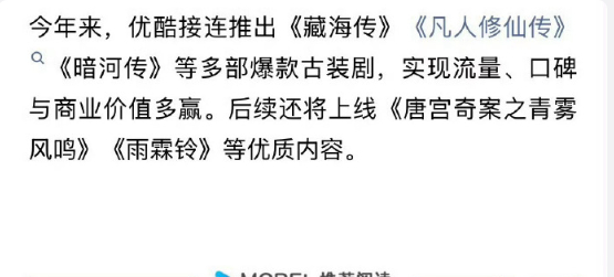 优酷认证爆款古装藏海传凡人修仙传暗河传爆款古装古装剧品质标杆!三部剧实现流量口碑双收,优酷后续新剧阵容,让人对古装市场更有信心~