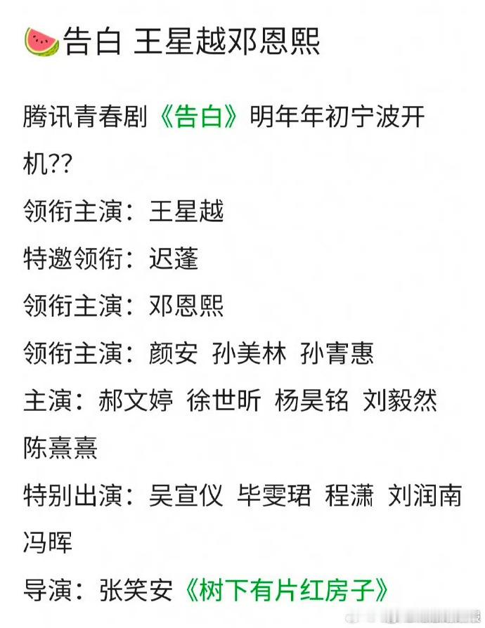 网传吴宣仪特别出演告白王星越邓恩熙或将合作告白《告白》阵容集齐多圈好感!王星越邓恩熙领衔,吴宣仪程潇等特别出演,明年初宁波开机值得期待~