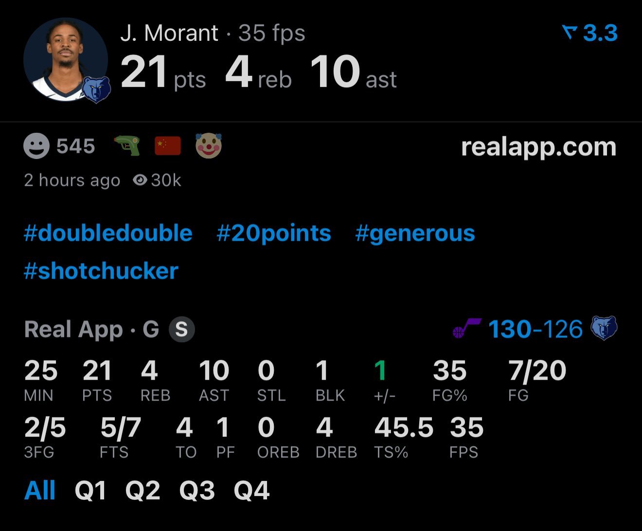 莫兰特复出之战20中7拿21分10助攻,灰熊主场输给爵士,本赛季莫兰特登场的比赛一共只赢了4场,输了8场。对面猪猪侠乔治39分6篮板8助攻,创造个人生涯单场得分新高。爵士vs灰熊NBA
