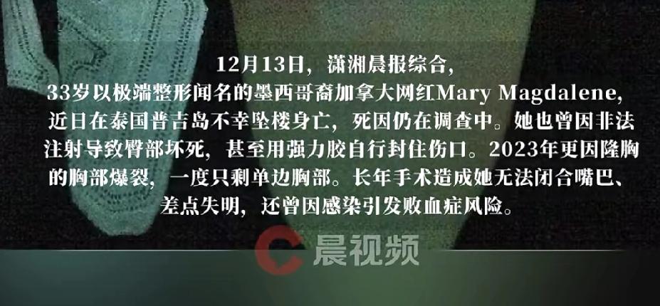 明明长得很好看,非得整到亲妈认不出,加拿大女网红Mary近日殒命泰国普吉岛,年仅33岁。 看照片从脸到身子基本都改动过了,她也是对自己够狠,说是有次非法注射后臀部溃烂坏死,她竟然用强力胶自行封堵创口。 多次上下手术台,对胸部、嘴巴和眼睛都留下不可逆的伤害。 整容易成瘾,不是在修修补补,就是在准备修修补补的路上,她自己也后悔了,可惜没有回头路。 Mary在泰国普吉岛某公寓高层坠亡,具体原因正在调查。
