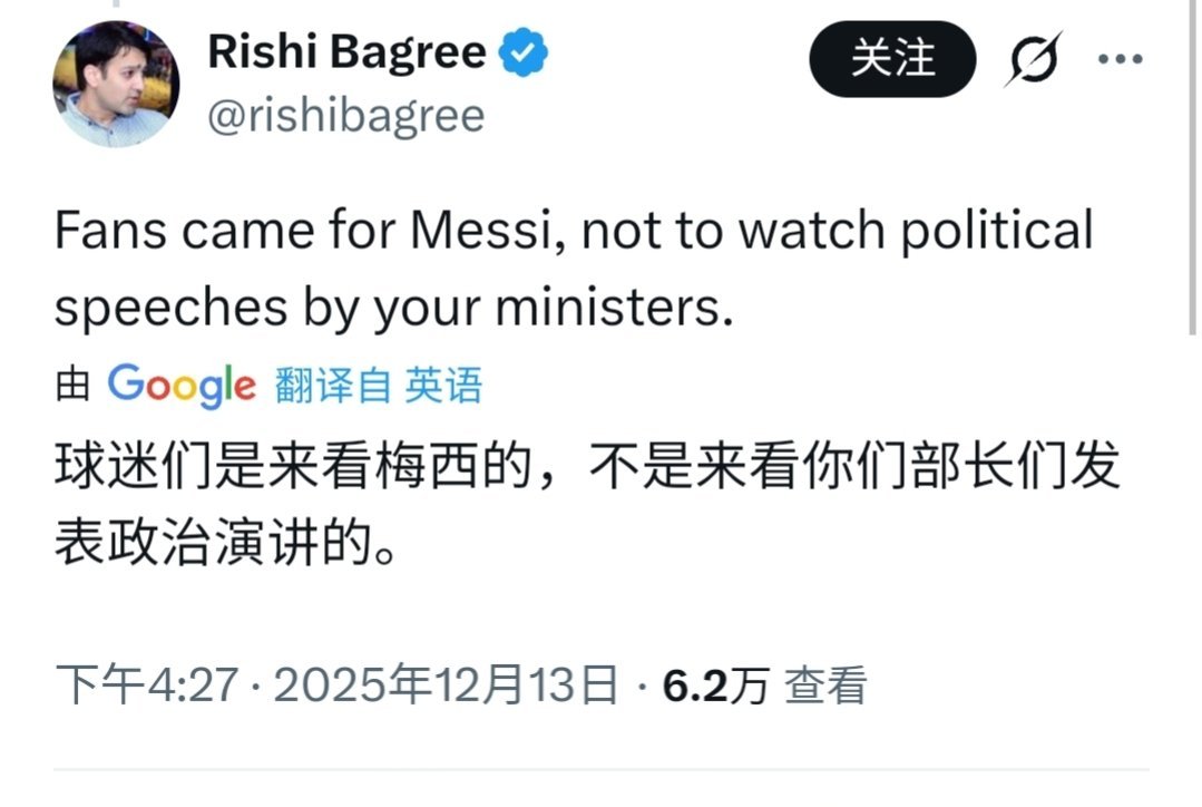 梅西不该遭受这样的对待,加尔各答人民也不该遭受这样的对待。赛事管理方坑骗那些花了数千卢比来看球的球迷。卑劣、贪婪的商人和政客完全劫持了这场活动。梅西印度行 印度官员向梅西道歉