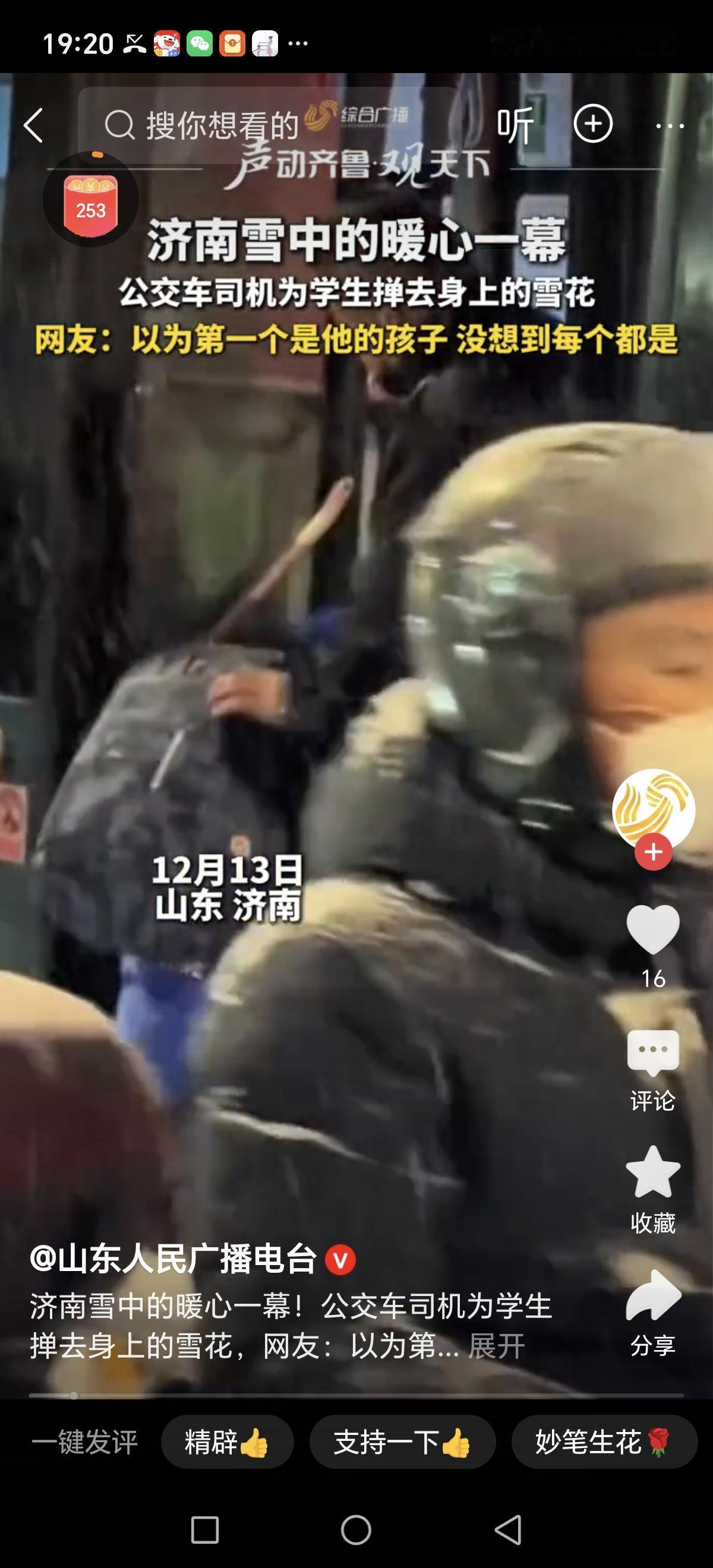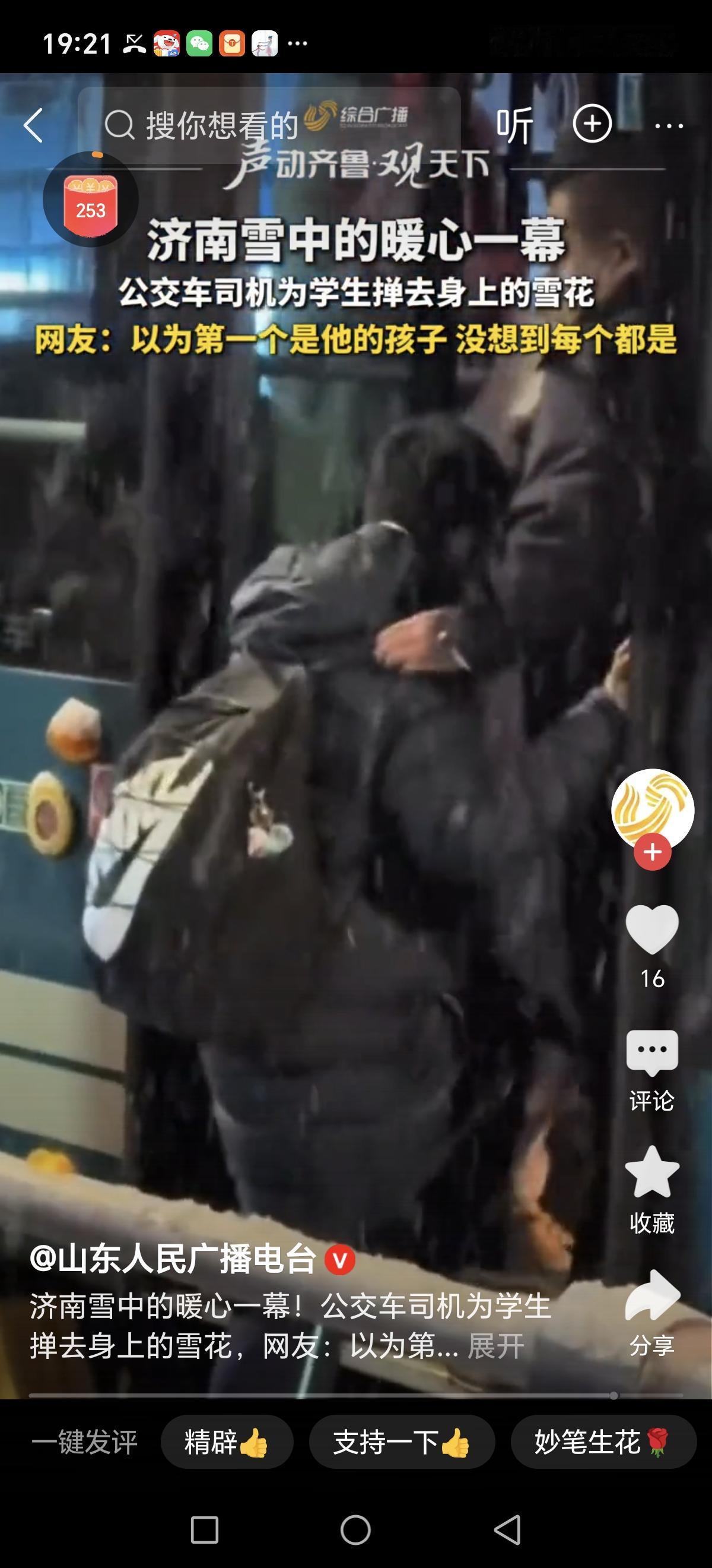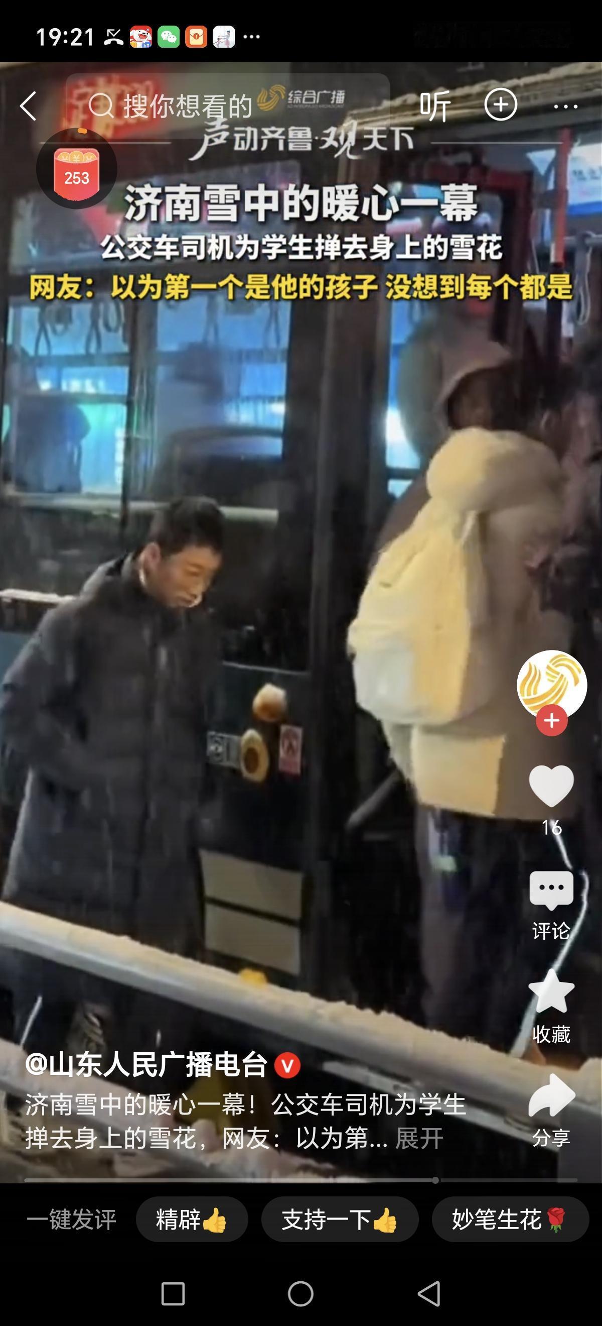 济南雪中的暖心一幕!那一刻,仿佛冬日的寒冷都被融化在空气中。街道上飘扬的雪花,为这座城市披上了一层银装素裹的童话色彩。而在这样的雪景中,一位公交司机的一幕温暖瞬间,瞬间在市民心中留下了深深的感动。 只见一名小男孩拖着沉甸甸的书包,小心翼翼地走到公交车门前,身上的雪花还未完全融化,冻得瑟瑟发抖。司机师傅一眼就看到了这个小乘客的尴尬与寒冷,他没有多说什么,只是微笑着打开车门,轻声邀请:“小朋友,上车吧,这雪天,别让自己受凉。”说完,他熟练地拿起随身携带的掸子,温柔而细心地帮孩子掸去身上的雪花。 这一幕,让在场的乘客都屏住了呼吸。司机的动作既自然又充满关切,没有任何高高在上的姿态,而是一种父亲般的温暖。这不只是一份职业的责任,更像是用行动传递出的那份人间真情。在那个瞬间,雪花不再冰冷,空气中弥漫着温馨的气息。 这样的细节,折射出社会最真实的温度。它告诉我们,善意和关心其实可以很简单:一句问候、一个动作、一份细腻的体贴,就能温暖一颗颗冰封的心。在这个快节奏、高压力的时代,或许我们都需要这样一份“暖”,去驱散心头的阴霾。 更重要的是,这样的暖心场景,激发了我们每个人内心那份善良的种子。我们或许无法改变整个世界,但可以从身边的小事做起,用一份关怀、一份耐心,让这个社会变得更加温暖。就像那位司机,用行动告诉我们:关心他人,从细节开始;温暖人心,源于每一个微小的善意。 当我们再次踏上公交车,或许也可以像他一样,用一句“您好”或一个微笑,去温暖身边的每一个人。因为,生活的真谛,就是在点滴中传递温暖,在平凡中创造不平凡。让我们都成为那份雪中温暖的传递者,用心去守护每一份纯粹的善意,让这个冬天不再寒冷,而是充满希望和爱。济南降雪