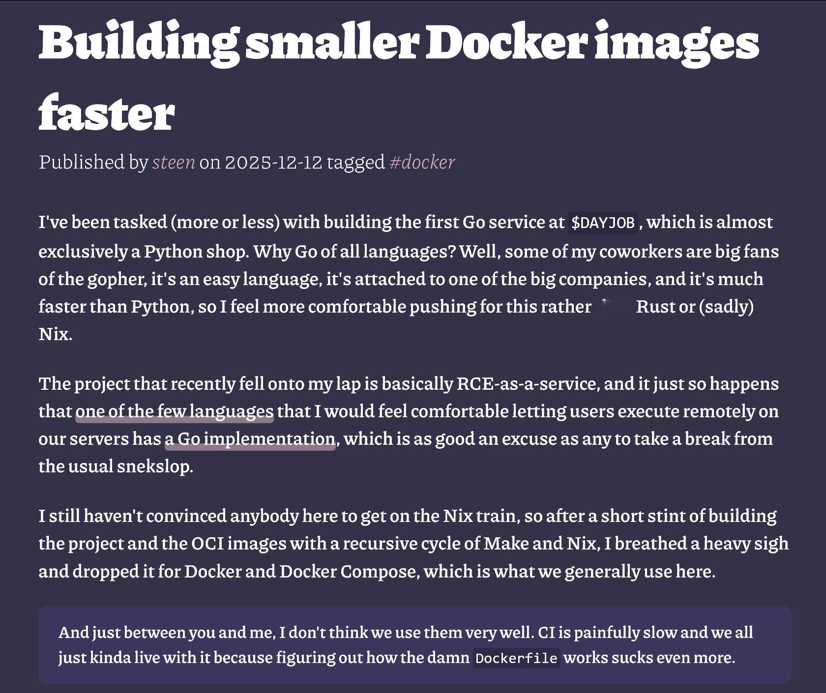 Building smaller Docker images fastersgt.hootr.club/blog/docker-protips/作者通过优化 Dockerfile 的结构、利用缓存和挂载机制、减少不必要的文件,成功地加速了 Docker 镜像的构建过程,并有效地减小了镜像大小