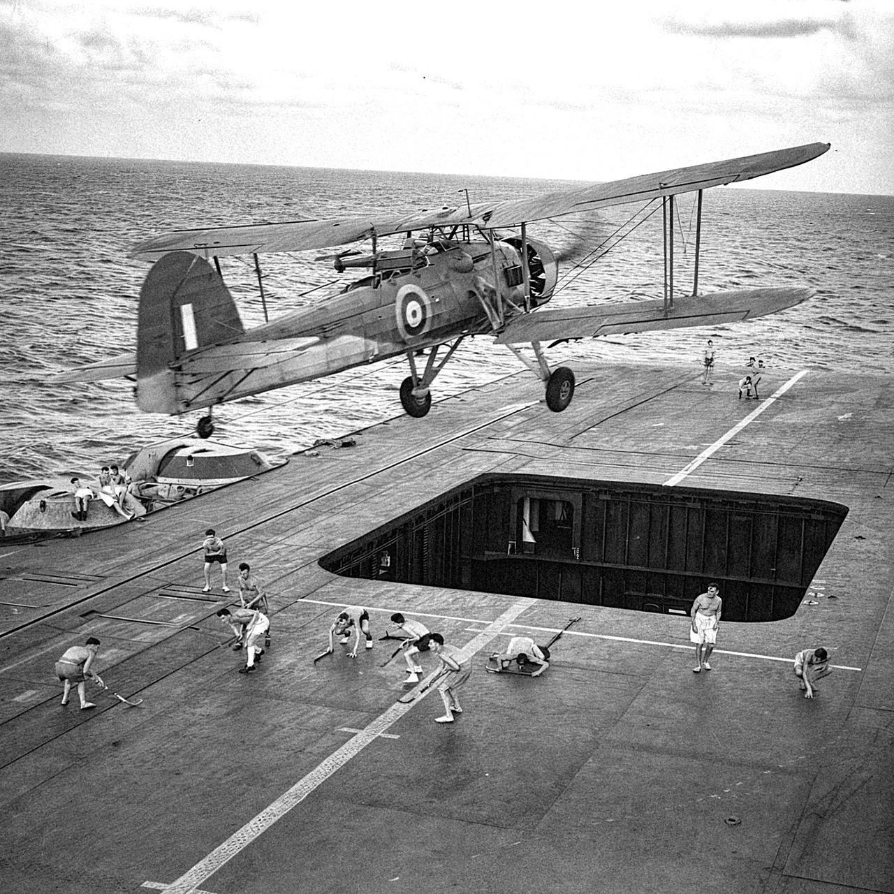 20世纪30年代,一架费尔雷“剑鱼”鱼雷攻击机低空飞掠英国皇家海军“不屈”号航空母舰甲板,它正在进行飞行训练,具体内容大概是准备投下一个布袋靶标,让机组人员学习在不同高度和速度下空投武器(鱼雷或炸弹)的时机和要领。前甲板的升降机平台此时正在准备提升飞机,已经下行到飞行甲板下方,留下的巨大空间直观地显示出升降机的尺寸。甲板上,水兵们正在进行一场曲棍球赛,在出海的闲暇时光里,宽大的飞行甲板就是水兵们散步、跑步、操练和游戏的天然场地。按照今天的安全规范来衡量,在升降机下行状态下,在飞行甲板进行这样的体育活动无疑具有相当的危险性——巨大的升降机“坑洞”周围没有任何保护性护栏,一旦有人失足跌落下去,即使不丢掉性命也必然是重伤。