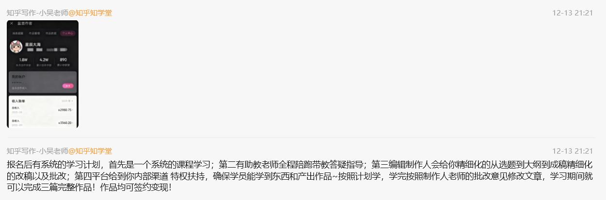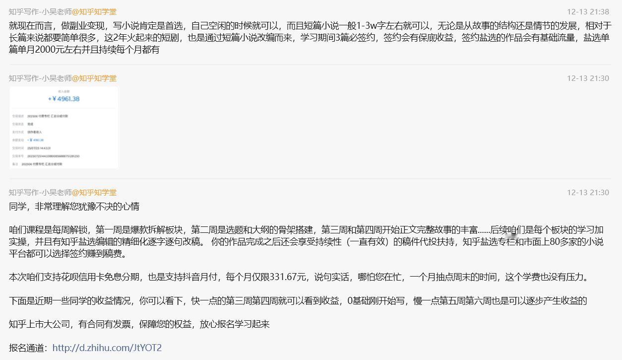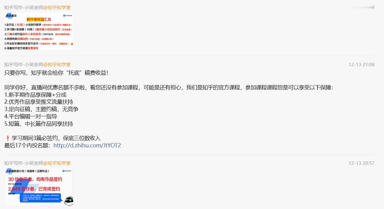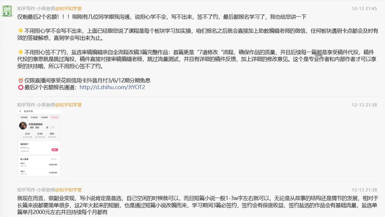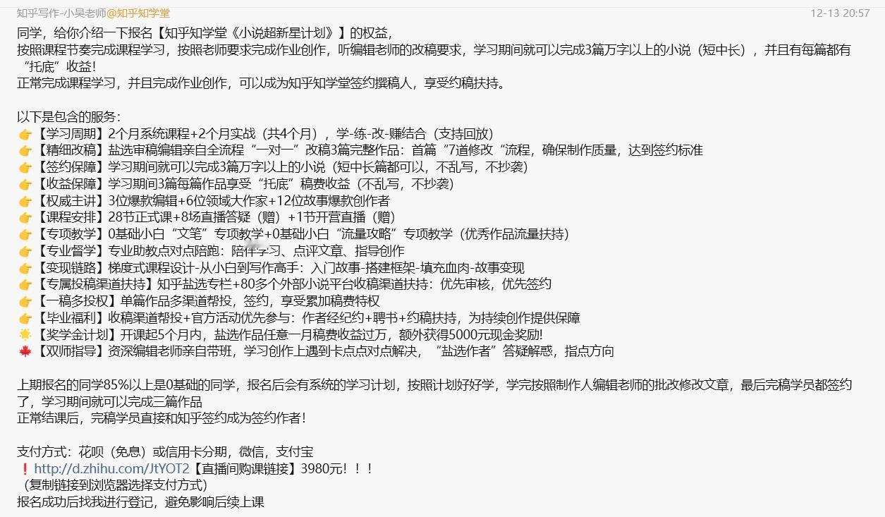 知乎的小说超新星计划靠谱吗? 参加了两天的知乎官方写作培训直播,收货不少。花了一毛钱,很划算。相当于免费的。 然而自然逃不开免费培训是为了卖课的魔咒。最后老师抛出这个超新星计划,收费约3980块,有内部投稿的特权,有编盐选的福利,有……很多福利。 我有点心动,也有点失望。心动是福利确实够吸引人,失望是知乎投稿都要走后门了,是不是该换平台了。 当玩跨境电商不再挣钱,教跨境电商的培训却挣得钵满盆满,当当玩抖音不再好挣钱,教人玩抖音的确实热闹非凡。 写网文的是不是也这样呢? 有参加过的朋友吗,能否说说?图片就是所谓老师,大群当时就结束了,客服说下班了?能买吗?