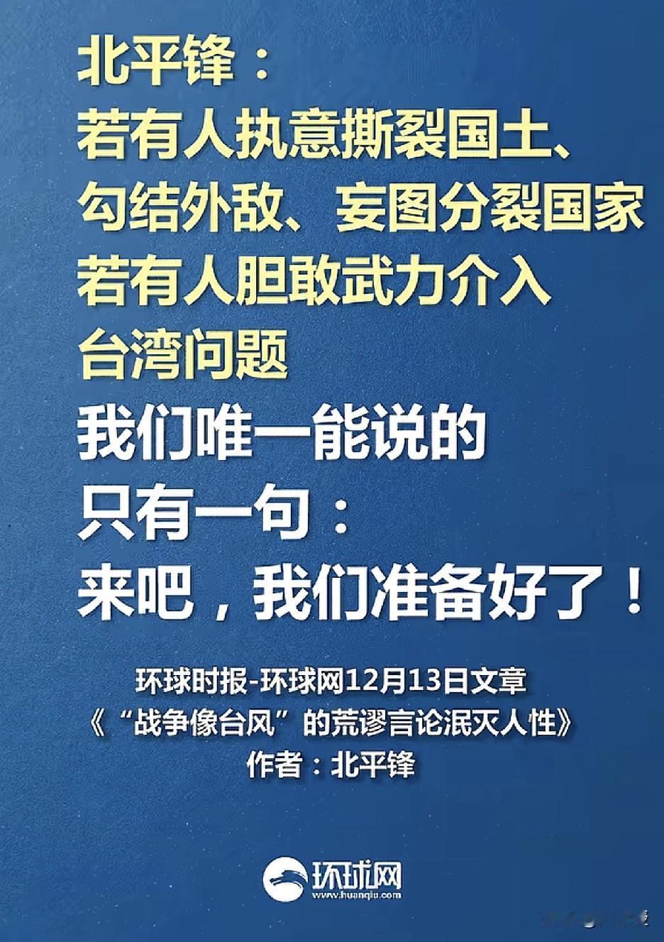 北平锋: 若有人胆敢武力介入 台湾问题 我们唯一能说的 只有一句 来吧! 我们准备好了