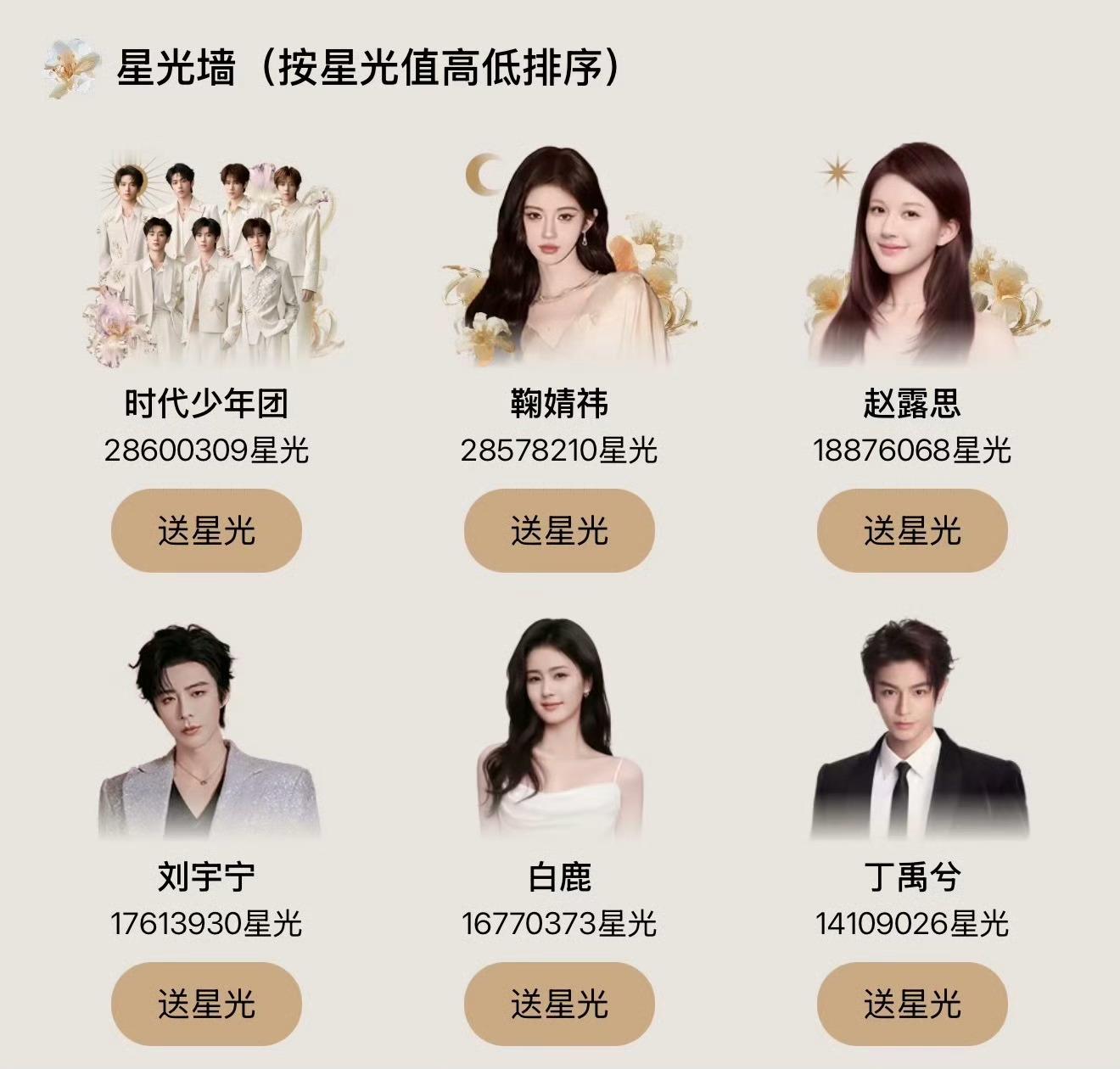 鞠婧祎和时代少年团交替领先,只有第三名的赵露思很稳定,刘宇宁跌到第四了!星光大赏投票鞠婧祎反超时代少年团