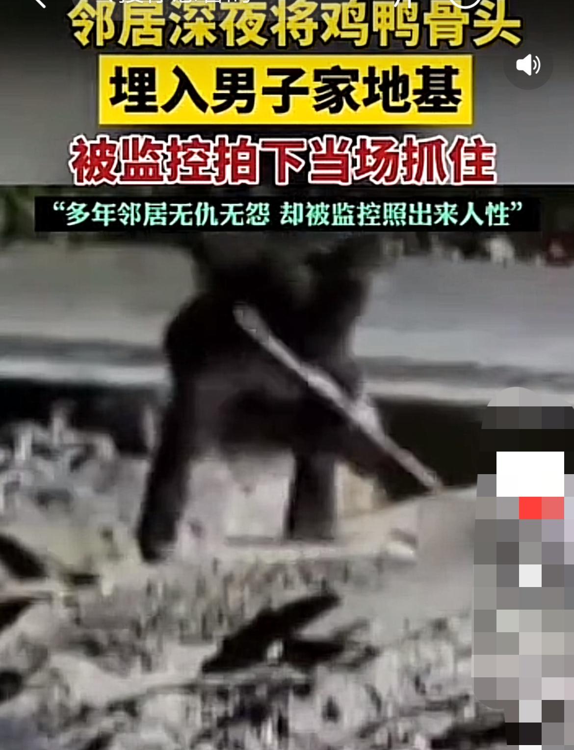 在广东,邻居深夜将鸡鸭骨头埋入男子家地基! “你说这里埋骨头方便?那怎么不埋你家院子!” 这句让人匪夷所思的辩解,来自广东一处正在施工的宅基地。房主李先生查看监控时,目睹了让他脊背发凉的一幕:隔壁邻居深夜翻过矮墙,在他的房屋地基位置,鬼祟地挖坑、倾倒、掩埋,前后往返三次。他原以为对方在埋什么私人物品,直到亲自挖开泥土——腐烂发臭、密密麻麻的鸡鸭骨头赫然在目,还带着刺鼻的腥味。 “我和他多年邻居,无冤无仇。”李先生难以置信。面对拿着监控视频的对质,邻居起初百般抵赖,铁证面前才哑口无言,最终只轻描淡写地给出一个荒唐理由:“就是随手扔的,没想那么多”、“觉得那里埋骨头方便”。这个敷衍的解释,让事态从“缺德”升级为“诡异”。 李先生对此感到愤怒与困惑,他表示,自己与这位邻居虽然偶尔因琐事拌嘴,但并无深仇大恨。他担忧的是,这些动物骨头在地下腐烂后,会滋生细菌、产生异味,还可能破坏地基土壤,对房屋安全构成潜在隐患。事发后,李先生已要求邻居清理骨头并进行赔偿,并寻求了村委会的介入调解。 这件事你怎么看?你觉得是不是嫉妒心在搞鬼?来评论区聊聊你的看法。 [免责声明]文章的时间、过程、图片均来自于网络,文章旨在传播正能量,均无低俗等不良引导,请观众理性看待本事件,切勿留下主观臆断的恶意评论,互联网不是法外之地。本文如若真实性存在争议、事件版权或图片侵权问题,请及时联系作者,我们将予以删除。