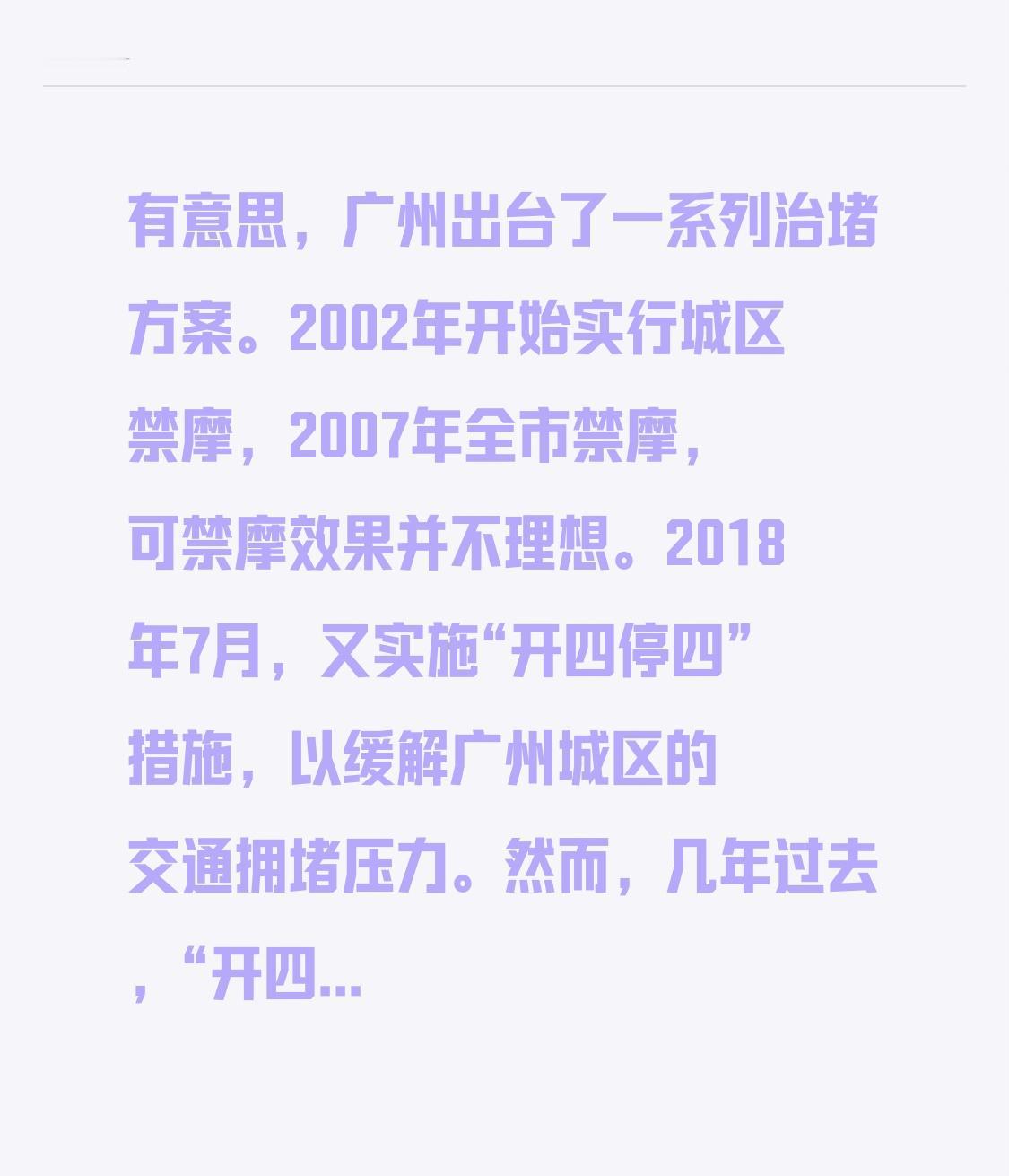 有意思,广州二十多年来,出台了一大系列治堵方案。 2002年开始实行城区禁摩。 2007年全市禁摩,可禁摩效果并不理想。 在2018年7月,广州市又实施城区路段的小汽车“开四停四”措施,以此来缓解广州城区的交通拥堵压力。 然而,几年过去,“开四停四”措施的治堵效果也不显著。 到了2024年7月,广州又开始效仿深圳,限制早晚高峰时段通行,但广州该堵车的时间点依然拥堵。 变来变去感觉治堵方案都不理想! 真不知道广州下次治堵又会想出什么新招! 不知你们有谁,被这些治堵方案深受困扰到的吗?