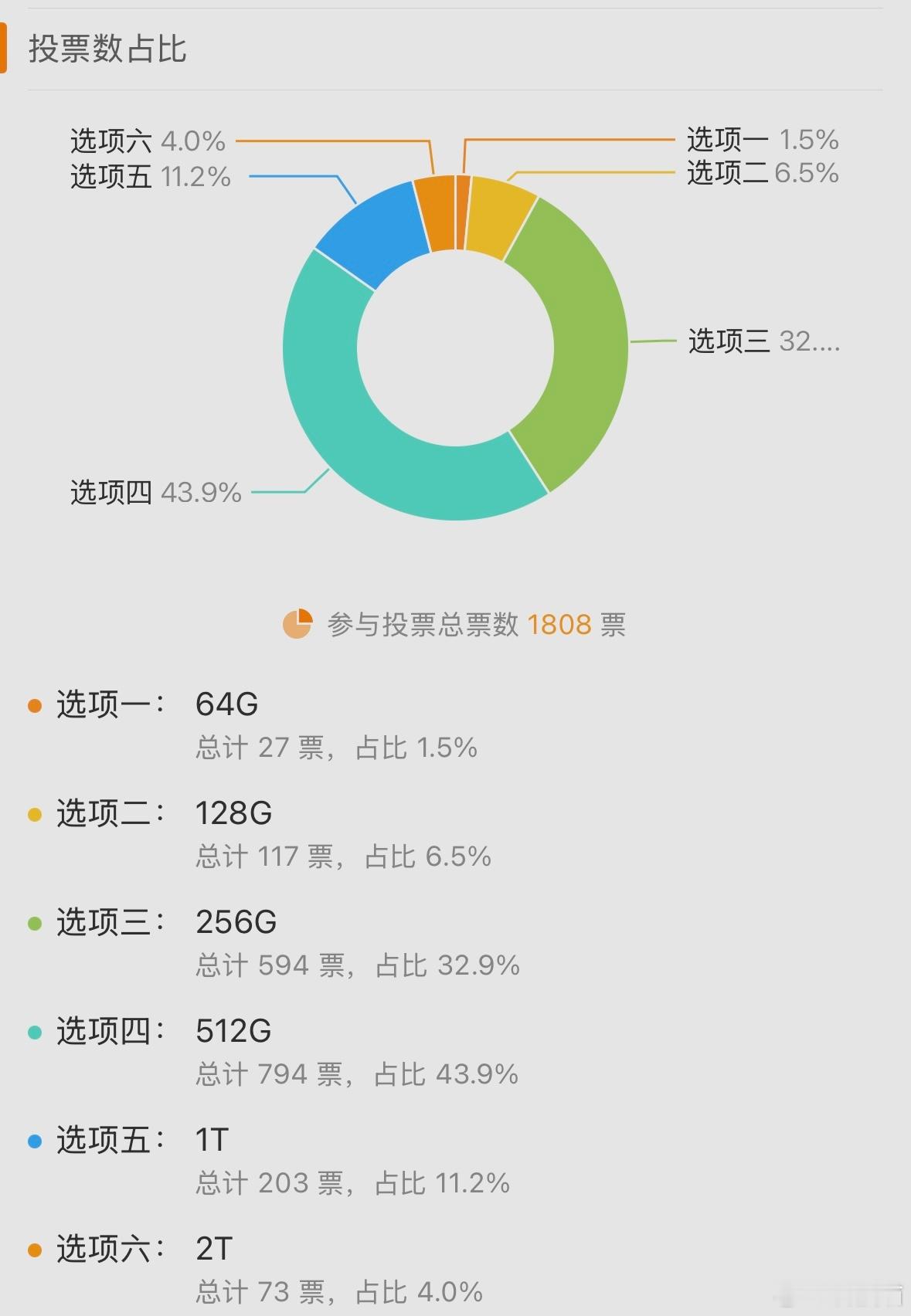 1808人参与投票,用512G手机的人有794,占比43.9%;其次是256G手机,占比32.9%。对我来说,用两年的情况下,苹果256G都够用了,然后删除一些东西