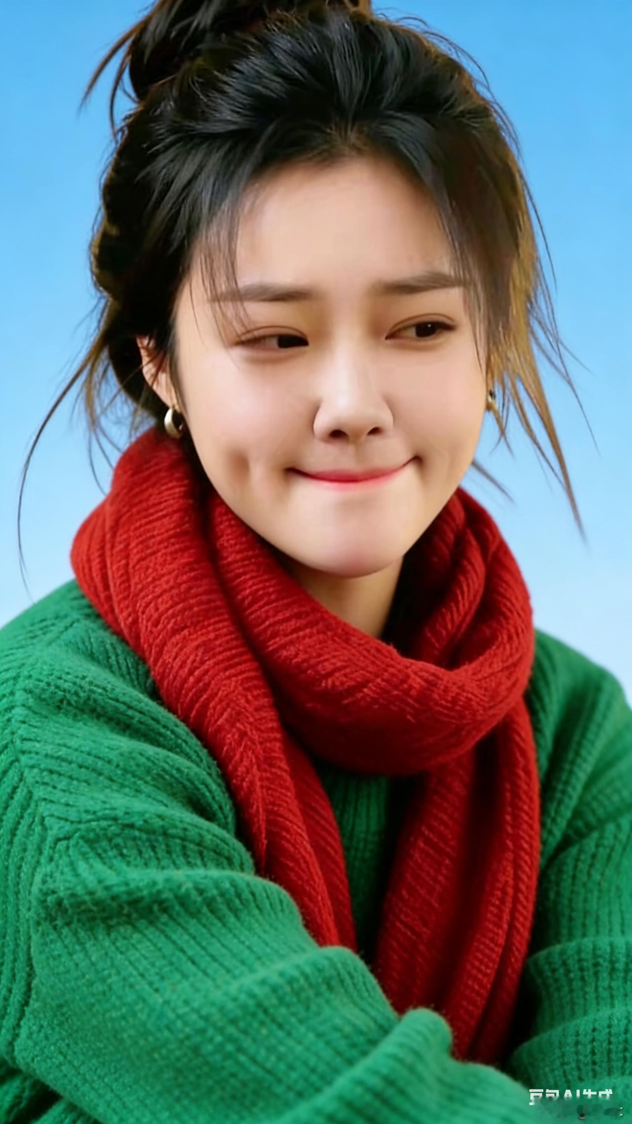 秋日树下,少女斜倚树干,蓝白毛衣与围巾相衬,棕发如瀑,红唇浅笑。构图简洁而梦幻,