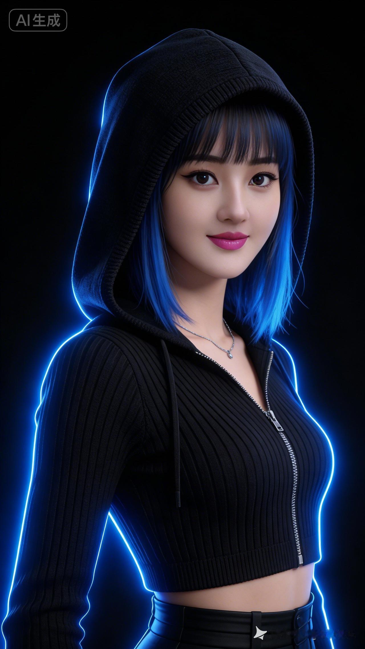 年轻女性中长发蓝色挑染,齐刘海搭配黑色针织连帽衫,帽檐轻遮额头。冷艳妆容衬淡粉紫