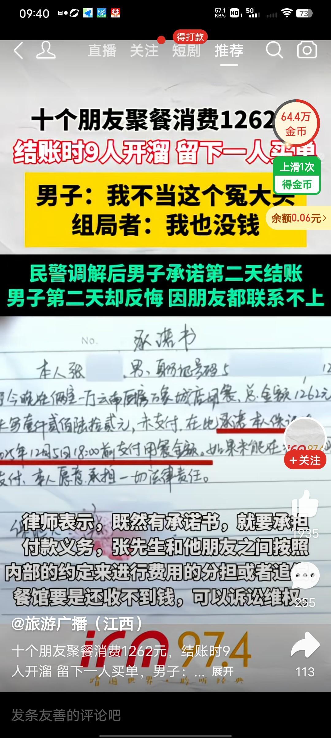 看看这所谓的酒肉朋友! 十个朋友聚餐消费1262元, 结账时九个人开溜留下一个人买单,张姓男子:我不当这个冤大头,组局者:我也没钱。 无奈之下饭店报了警,经过警察的调解下,张姓男子签了承诺书,约定第二天八点之前来结清付款,可第二天男子反悔,理由是因为联系不上其他的朋友。律师:既然该男子签了承诺书,就有付款的义务,张先生和他的朋友按照内部约定来进行费用的分担或者追责。 我就纳了闷儿了,就是AA制十个人,一个人才100多块钱,怎么一个人100多块钱都拿不出啊?那吃饭的时候怎么吃的比谁都欢呢?这几个男人的脸面真的不值钱?有网友说物以类聚人以群分,真的是啥人找啥人,都是一样的货色没有一个要脸的,你没钱你别组织吃饭呀,组什么饭局呀,自己兜里有几个钱不知道呀!就那么100多块钱面子都不要了,这倒好了丢脸丢到全国了!