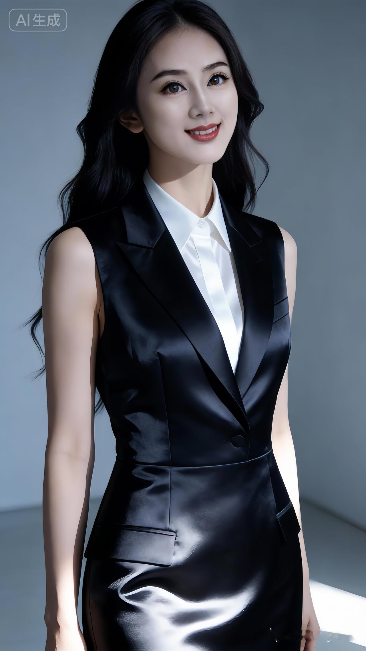 墨黑长发如丝绒轻扬,无袖黑缎西装裙泛着柔雾光晕,她浅笑抬眸,冷白肌肤映衬正红唇色,尽显冷艳而干练的优雅气韵。