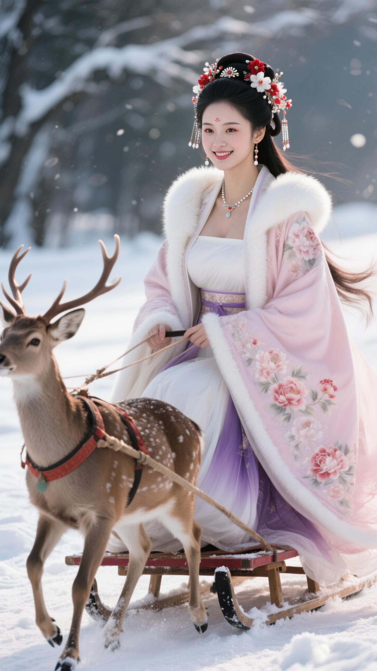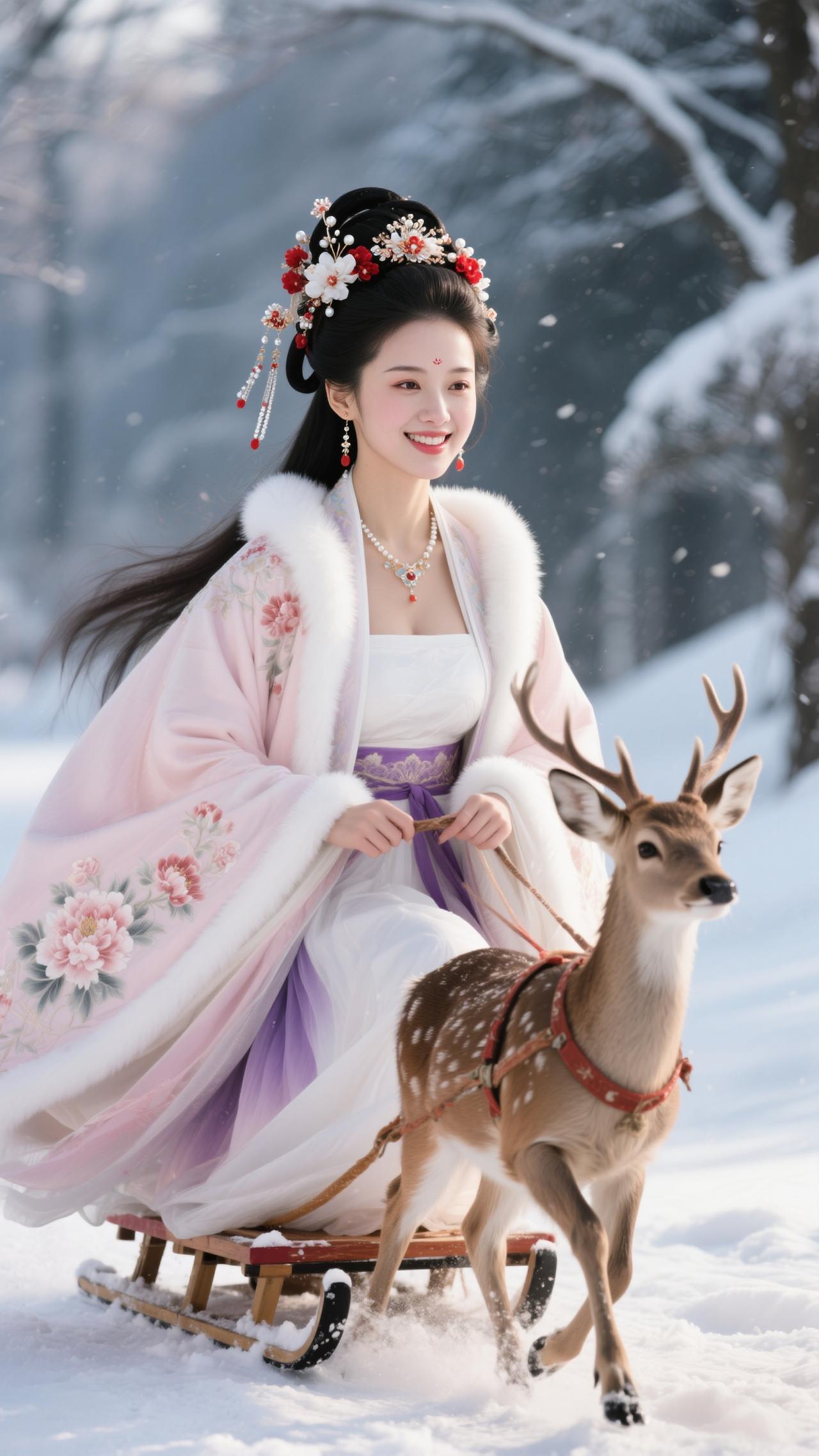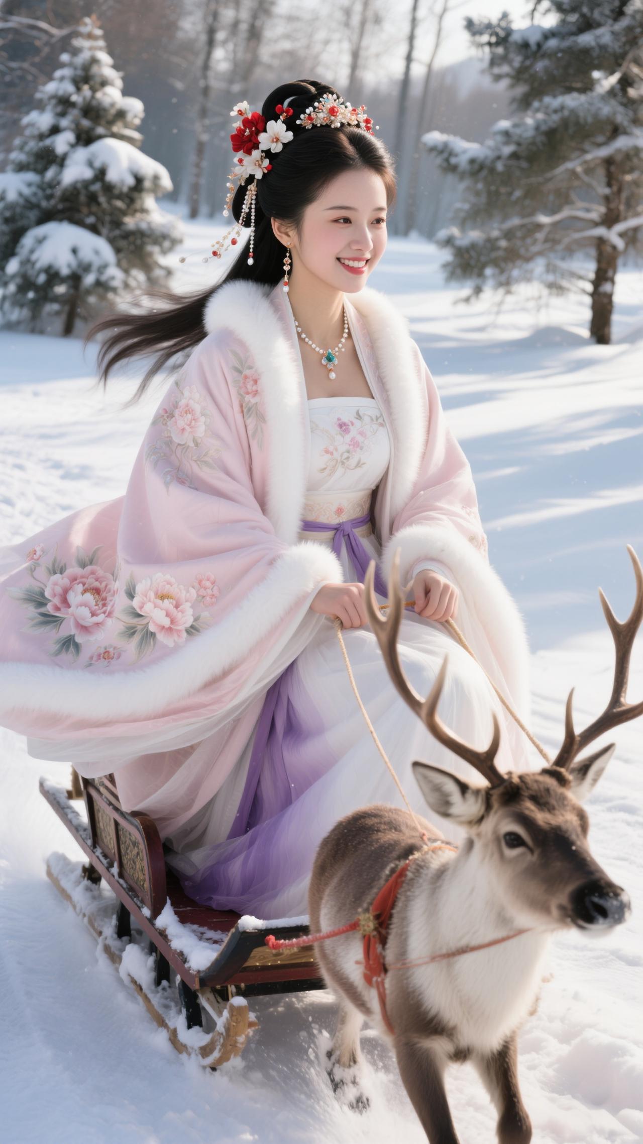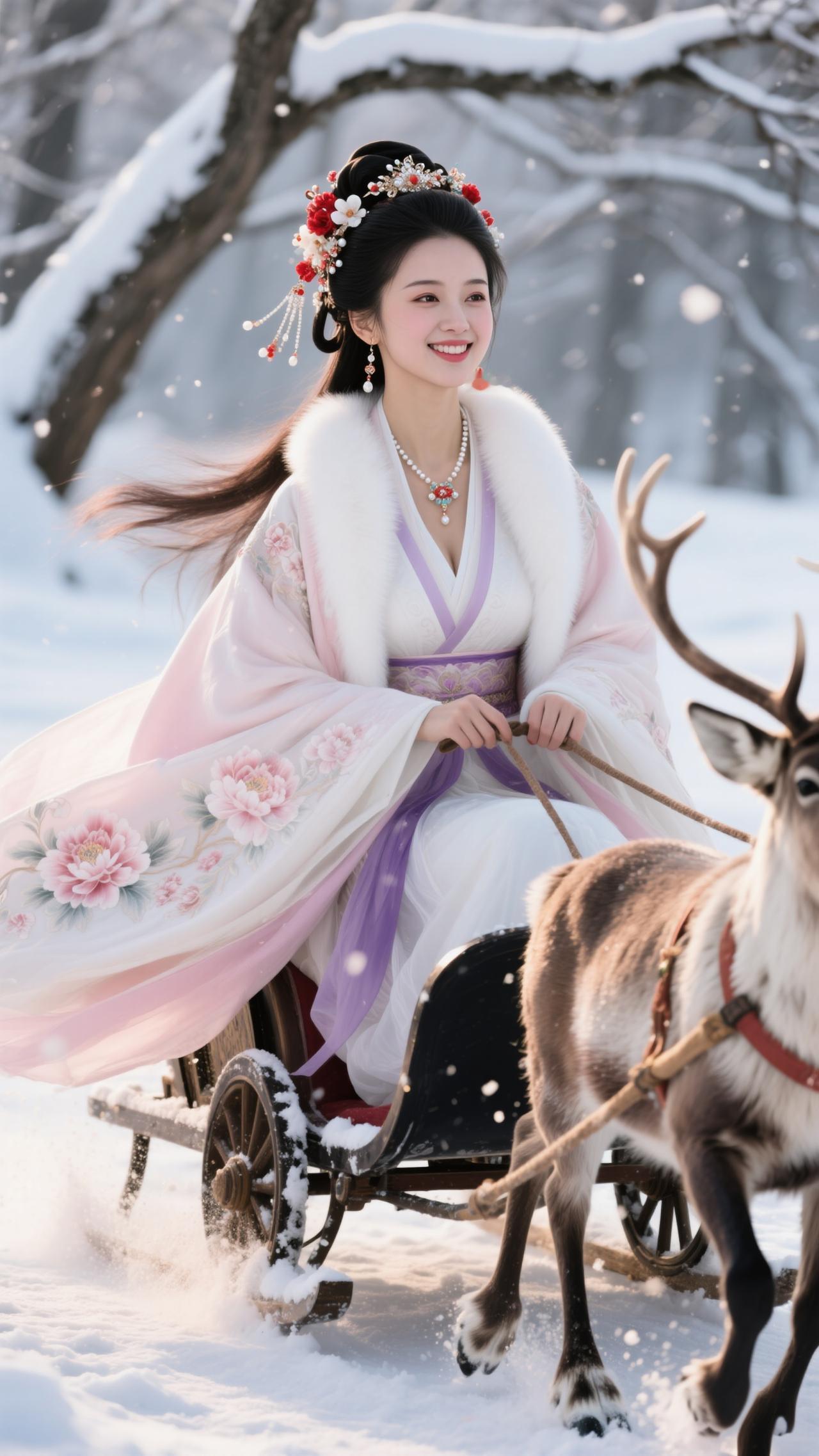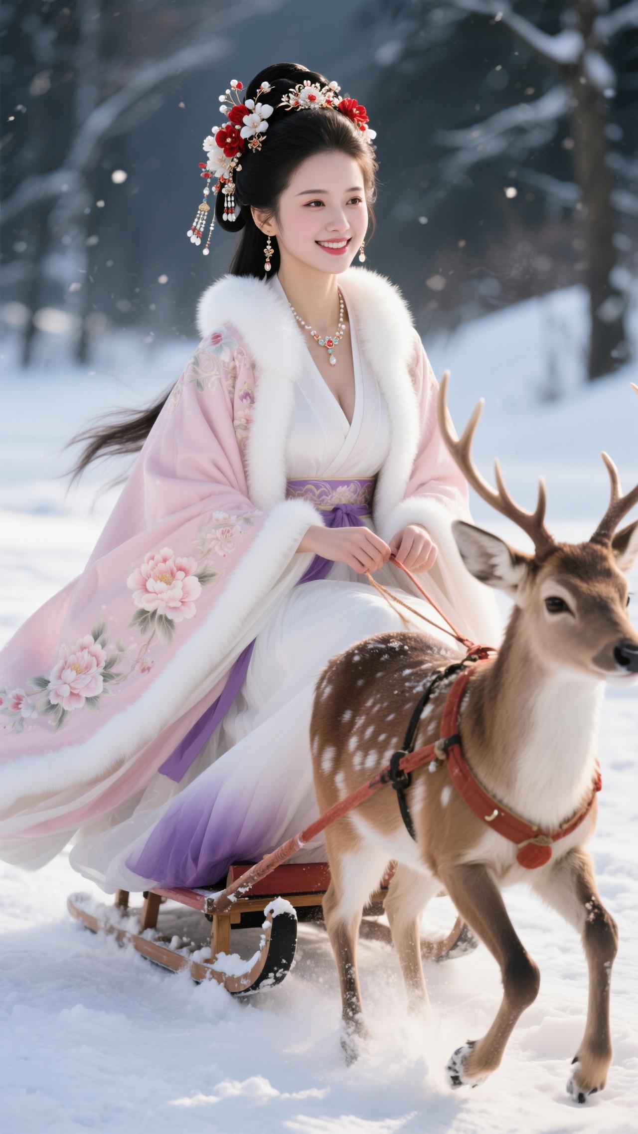 《蝶恋花·鹿车踏雪》 白裘香融梅蕊雪,粉袂飘霞,紫带随风结。 鹿引冰车穿玉阙,金铃暗逐晴光曳。 笑指千山银浪叠,鬓畔花明,衬得容颜洁。 一骑霜华惊晓猎,满身风软沾香屑。