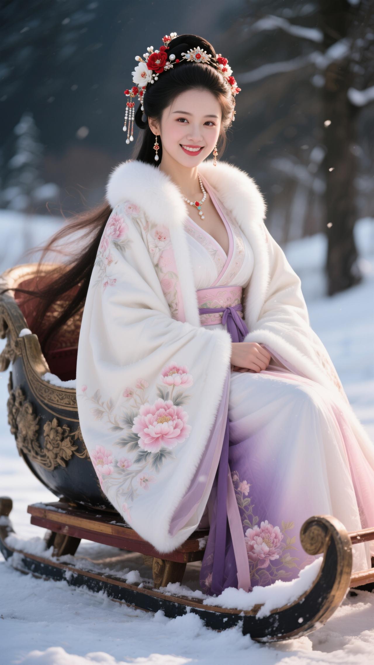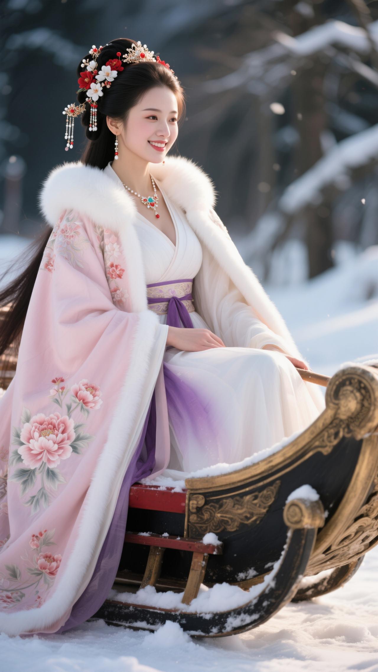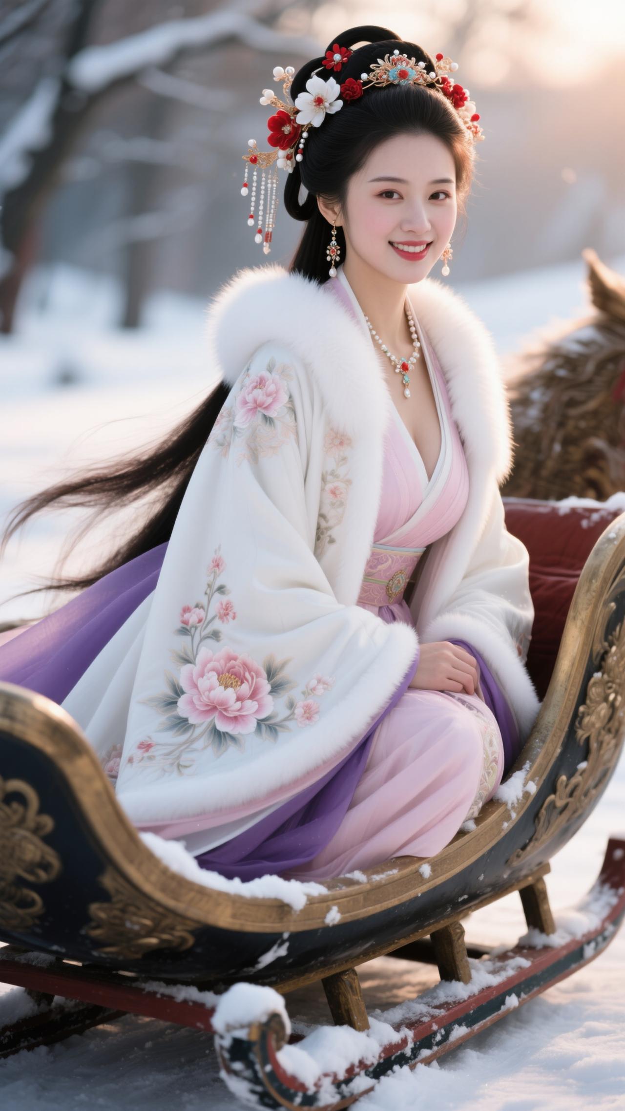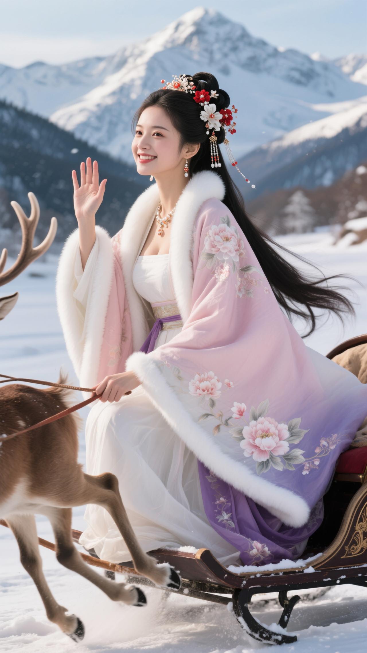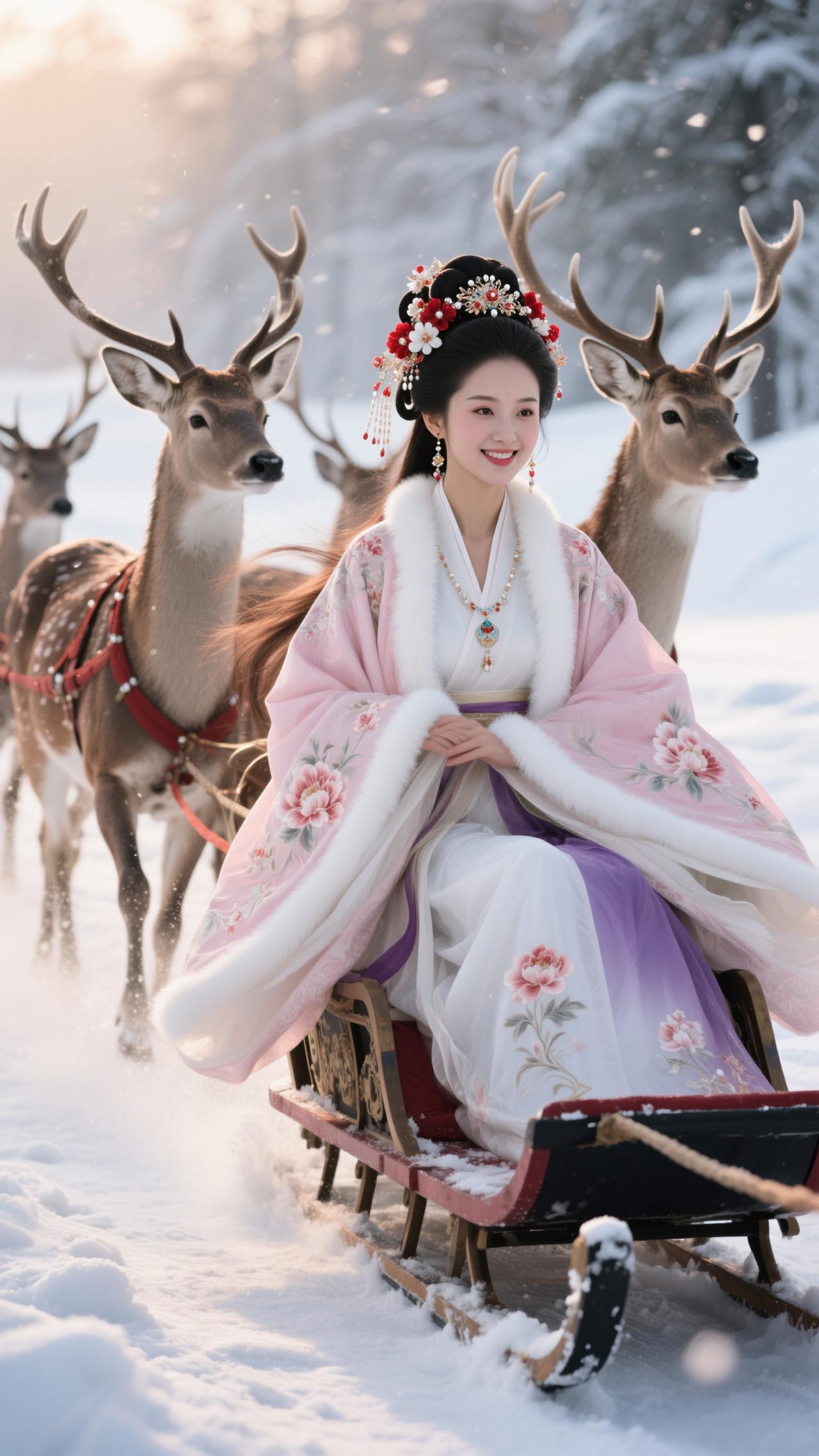 《蝶恋花·鹿车踏雪》 白裘香融梅蕊雪,粉袂飘霞,紫带随风结。 鹿引冰车穿玉阙,金铃暗逐晴光曳。 笑指千山银浪叠,鬓畔花明,衬得容颜洁。 一骑霜华惊晓猎,满身风软沾香屑。