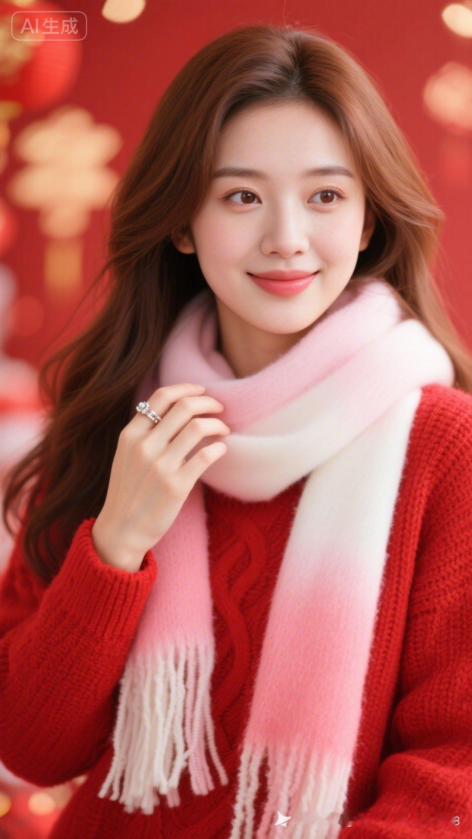 冬日暖阳下的甜美笑容,粉白相间的围巾搭配红色毛衣,温暖又可爱!🌞💕