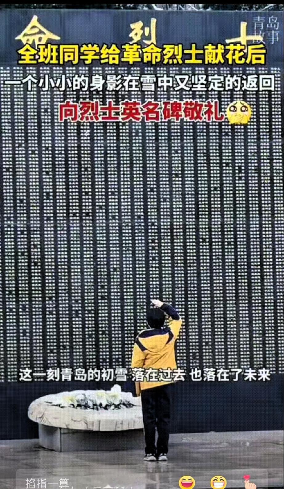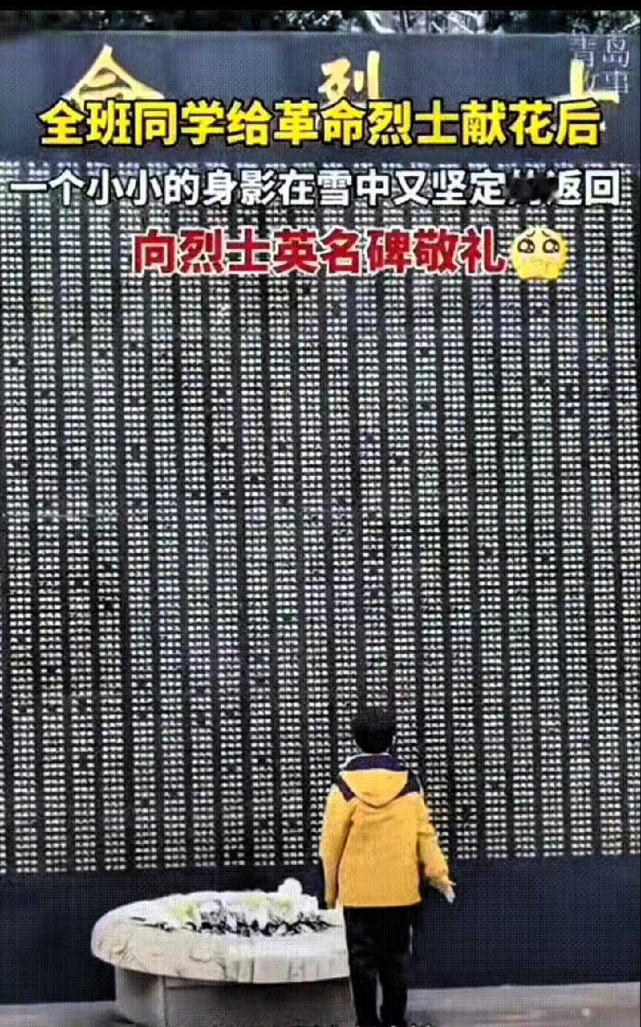 这一刻真的哭死!学校组织孩子们到青岛革命烈士纪念馆缅怀先烈,献花仪式结束后,大部队都有序离场,唯独一个小男孩,突然停下脚步,坚定地转过身,大步朝着烈士英名碑的方向走去。 雪花簌簌地落在他的头发和肩膀上,他却丝毫不在意,走到碑前稳稳站定,稚嫩的脸庞写满了庄重与严肃。 紧接着,他高高举起右手,敬了一个标准又坚定的礼。那小小的背影,在漫天风雪里,透着一股让人敬佩的力量,仿佛在对着碑上的英魂,诉说着无声的敬意。 有人看到这一幕感慨:“应该是某一个战士回来了!”这话听着格外戳心,其实哪里是什么轮回,分明是刻在我们骨子里的红色基因,正在下一代身上悄悄发芽、生根。 总有人说红色教育太生硬,可你看,真正的传承从不是照本宣科的说教,也不是喊几句空泛的口号。它就藏在这样一个下意识的转身里,藏在一个郑重的军礼里,藏在孩子眼里对英雄的敬畏与崇拜里。 这个敬礼,是跨越时空的对话,是少年对先烈的回应。它让我们真切地感受到,英雄从未远去,他们用生命守护的山河,正被一代代少年接过守护的接力棒。那些曾为我们披荆斩棘的人,永远会被后来人铭记与仰望。