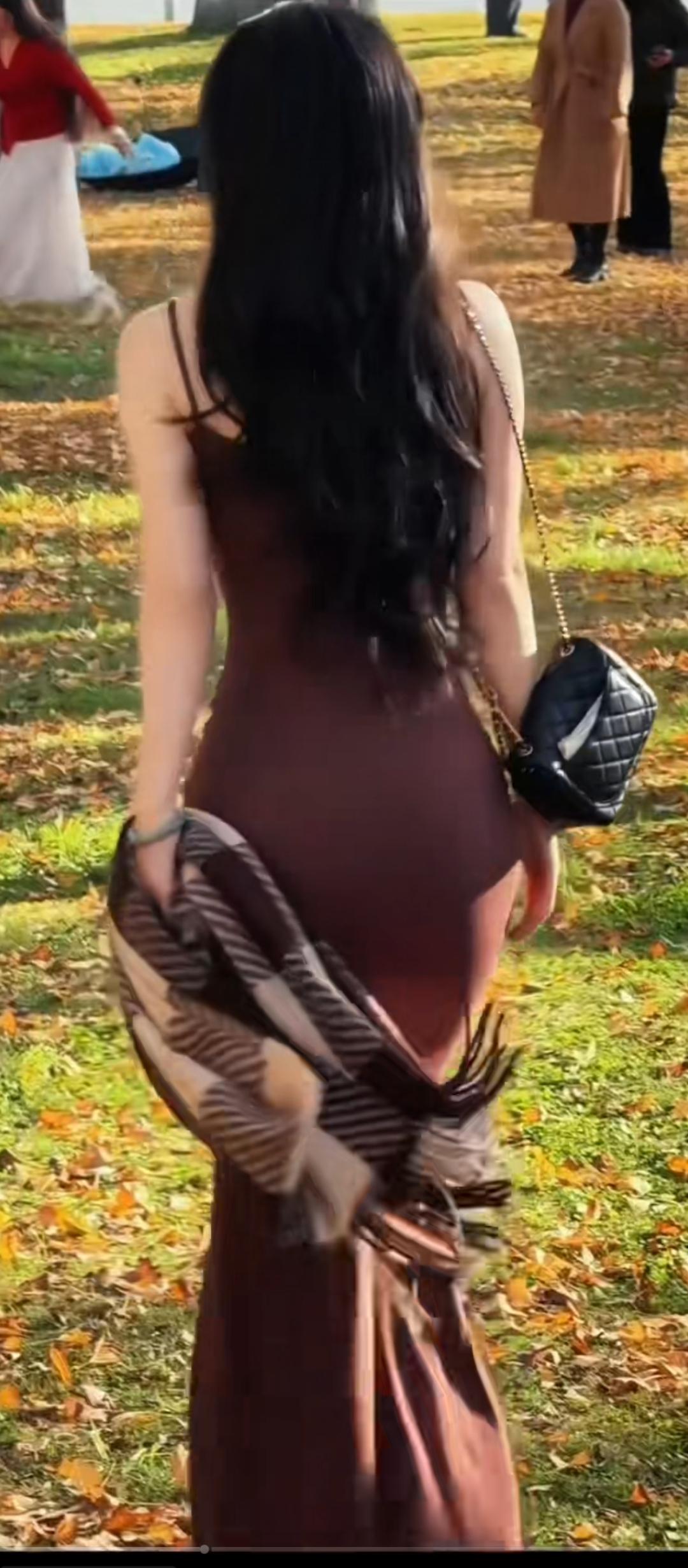 秋日暖阳下的优雅穿搭,棕色连衣裙搭配格子围巾,尽显时尚与温暖。