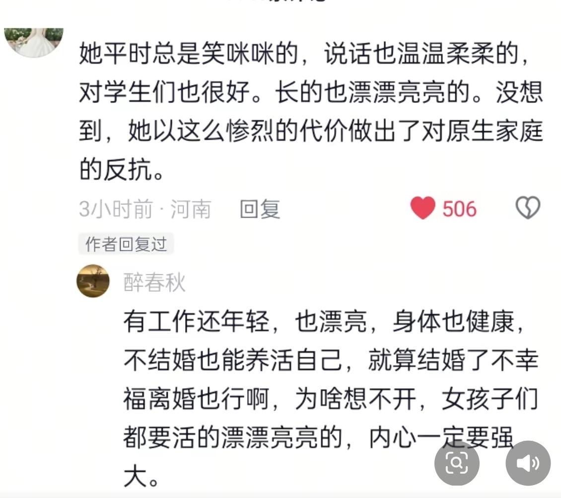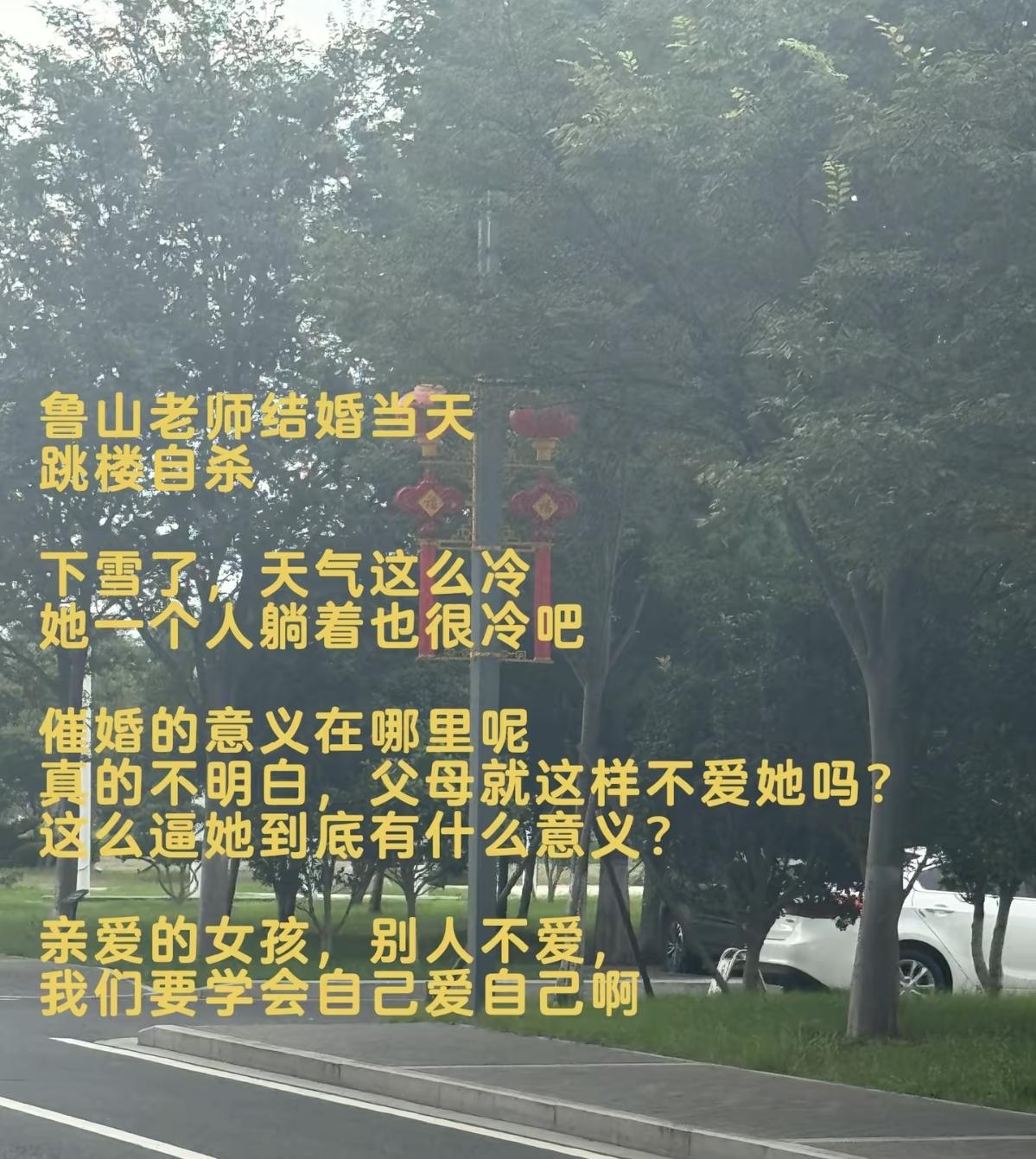 婚服换寿衣!鲁山女教师结婚日跳楼,11年反逼婚抗争终成绝唱 一场本该喜庆的婚礼,变成了一条年轻生命的葬礼!鲁山一高的魏老师,在编制稳定、样貌出众的人生坦途上,却因父母长达11年的逼婚,在结婚当天以跳楼的方式诀别世界。 更讽刺的是,她死后遗体归属成了双方家庭的扯皮焦点,男方索要彩礼,女方推诿责任,唯独没人记得她遗书里“让朋友处理骨灰”的遗愿。这场悲剧,撕开了中国式逼婚最冰冷的一面。 魏老师从大学起就因抗拒父母安排的相亲不断抗争,哪怕用极端方式反抗,也抵不过父母以死相逼和亲戚的“不孝”指责,最终妥协相亲结婚。 婚礼当天,她用纵身一跃结束了11年的痛苦,遗书里交代了财产密码留给家人,还为自己的死影响到一楼住户而道歉。 可她死后,男方纠结“未正式娶亲”推诿遗体责任,还要求退还彩礼,这场闹剧让人心寒的同时,更叩问着以亲情为名的绑架式逼婚。 逼婚的本质从来不是“为你好”,而是把子女当成满足面子的工具。当孝道变成枷锁,当亲情沦为绑架,再鲜活的生命也会在窒息中凋零。 魏老师的悲剧,该给所有执着于“催婚光荣”的父母敲响警钟!