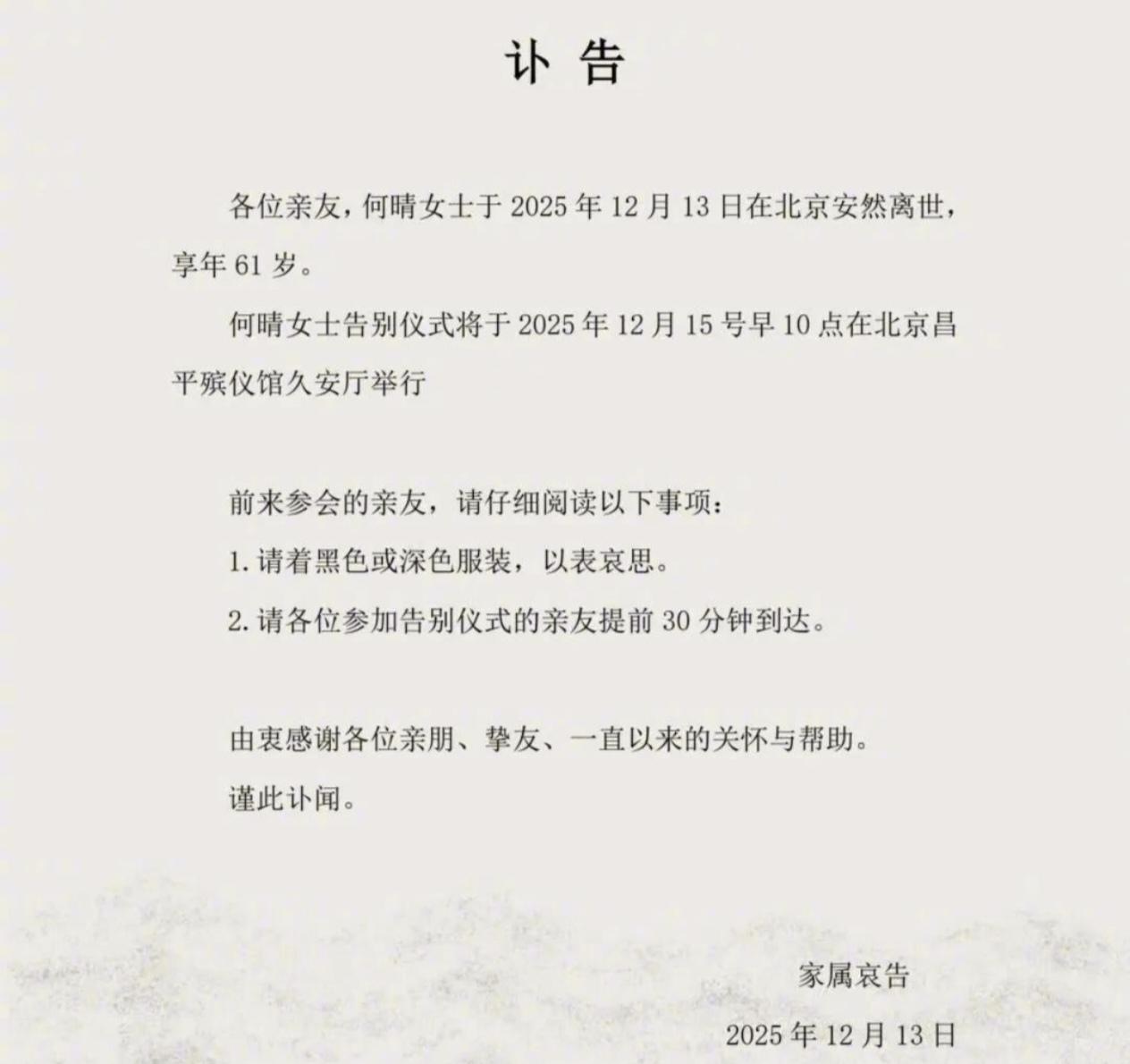 好可惜,早上刚醒来就看到热搜了,演员何晴去世了。 这些年一直没怎么见到她活跃在屏幕前,原来早在2014年就已经查出患有脑癌了,期间不间断的治疗有了好转,在2024年的时候又发作了,不得不宣布退圈。 回顾往昔,她是唯一一位出演过四大名著的演员,每个角色都出演得绘声绘色。然而天不遂人愿于2025面12月13日去世,享年61岁。 这期间没有任何她生病的消息,我们都不知道原来她默默的承受了那么多年的痛苦,现在走了也是一种解脱吧,愿天堂没有病痛!一路走好。何晴 四大名著