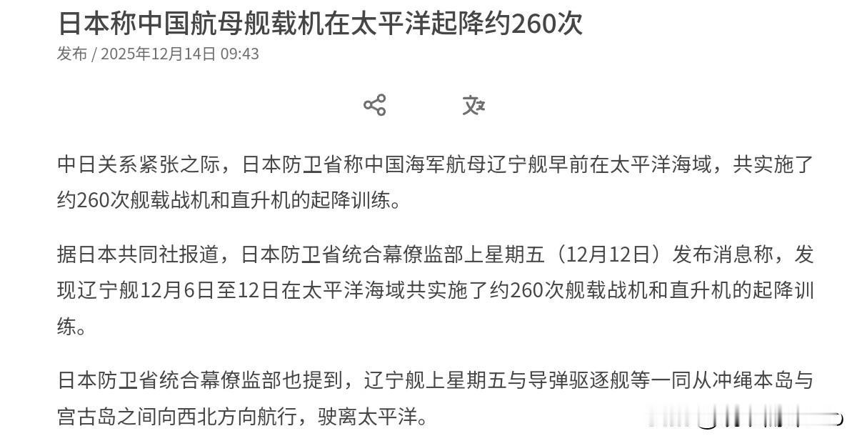 日本越看越紧张,日本方面公布了一个数据,自己估计也捏一把冷汗!12月14日,根据外媒报道,日本防卫省统合幕僚监部发布消息称,中国辽宁舰12月6日至12日在太平洋海域共实施了约260次舰载战机和直升机的起降训练。很显然,日本公布这一数据,这说明什么呢? 这无疑说明两点,其一,我方进行起降训练,日本方面非常的关注。而我们的飞机起降次数日本均能够掌握,这让日本编造的雷达照射谣言不攻自破,事实证明日本方面对我们的动态是了解的,日本这是蓄意滋事。其二,更为关键的是,我们的辽宁舰航母打击群能够在一周之内进行260次起降训练,这说明我们辽宁舰战力非常成熟,稳固,可靠,这是半点掺水的空间都没有的。 明眼人都知道,能不能安全稳定的弹射舰载机,这是衡量航母战力如何的关键性指标之一。我们在日本面前进行如此频密的起降训练,这就是告诉日本,我们的航母打击群刀锋很锋利。事实上,在日本国内,因为我们的辽宁舰是首艘航母,日本国内对该舰非常轻视,认为辽宁舰缺乏一战之力。 但是,事实证明就算是我们国内的首艘航母,日本也感到极为头疼。很显然,这样的震慑力道不是假的,而是实实在在摆在了日本面前。若日本军国主义者还狂妄的不知道自己有几斤几两,妄图试试我们的刀锋,这注定将头破血流。面对日本我们是不怕事情闹大的,接下来就看日本自己的选择。