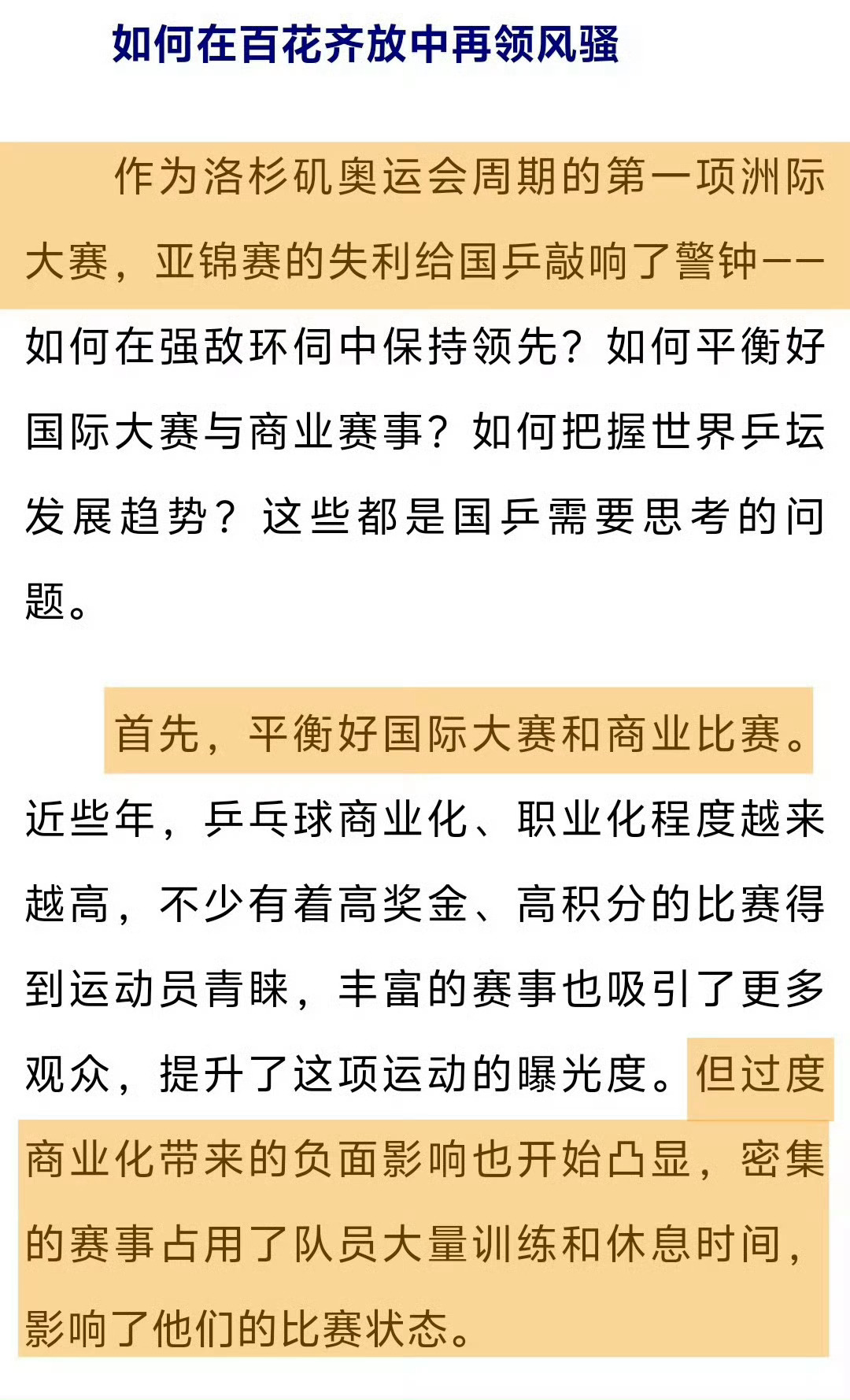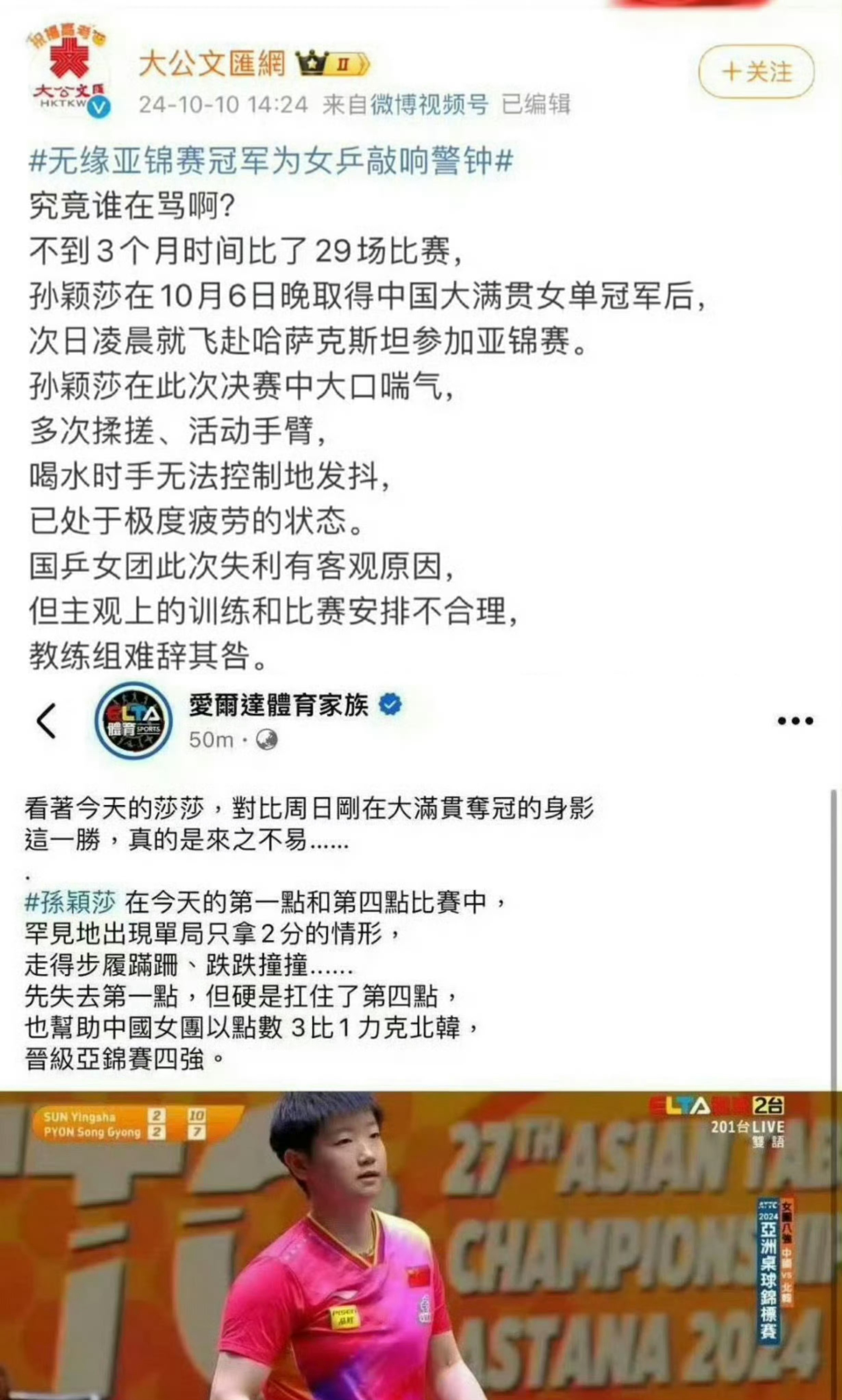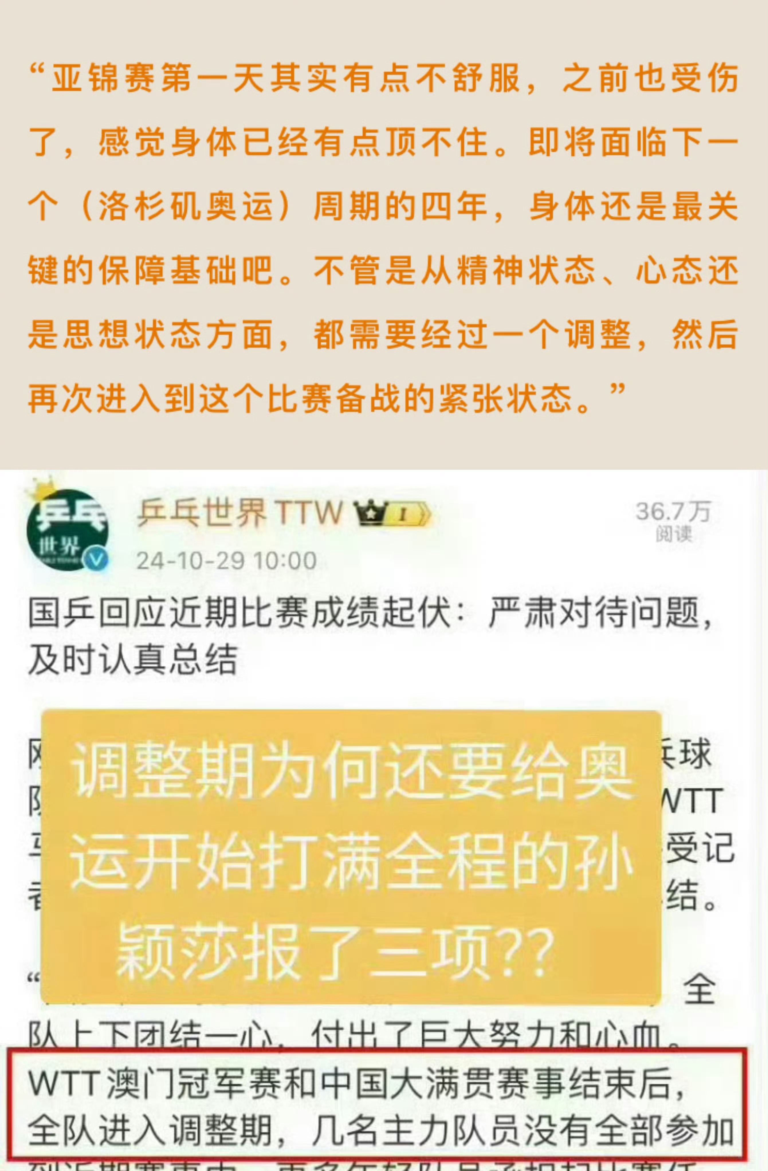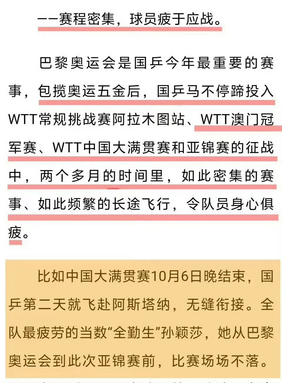 孙颖莎说自己自愿去参赛这时候还要把孙颖莎推出来真的其心可诛,不论是去年亚锦还是总决赛混双,国乒都应该深刻意识到不珍惜运动员的身体长期恶意透支消耗孙颖莎、毫无魄力锻炼小将不重视梯队建设的后果就是国乒一次次的丢金。新华网在去年早已一针见血总结【过度商业化带来的负面影响开始凸显,密集的赛事占用了队员大量训练和休息时间,影响了他们的比赛状态】,孙颖莎也提出过赛程过于密集不利于身体恢复的建议,而CTTA和WTT仍然一意孤行,强行抢混双外卡,强行让孙颖莎不合理兼项,甚至排出七小时三赛的魔鬼赛程变本加厉的透支运动员。国乒主要对手日本队国手也早已在专访提到【孙颖莎几乎没有明显弱点,日本选手有时能趁她看起来疲劳的时候进行胶着的对抗,但若她状态万全就非常困难】作为国乒绝对核心,孙颖莎始终肩负着极重的参赛任务,全世界都看得出来外协们都在正寄希望于通过密集赛程对孙颖莎进行持续消耗,期盼她在连续作战中出现精力体力下滑从而获得可乘之机,而我们国乒却始终没有危机感让孙颖莎疲于辗转各种赛事,女队唯一连续两届世锦赛兼三,唯一连续三届总决赛兼项,长时间处在高压状态导致精力体力被过度透支。乒乓球作为国球,守候国球荣耀永远应该置于商业化利益之上。我们应当合理规划运动员的赛程,保障充分的休整与系统性训练时间,为技术创新与身心健康发展保留必要空间,绝不能为短期商业利益而无尽消耗这份珍贵的财富,过度消耗运动员、过度商业化让运动员成为“卖🎫工具人”,不仅是对个人职业生涯的损害,更是对祖国荣誉的辜负,体育强国建设的光辉成就,不能掩盖运动员个体在高压体系下所承受的负担与风险,保护像孙颖莎这样的顶尖运动员,就是保护体育强国的核心竞争力,真的希望国家为运动员的拼搏提供坚实的后盾,避免最有责任心的运动员精神和身心在重压下被消耗殆尽!