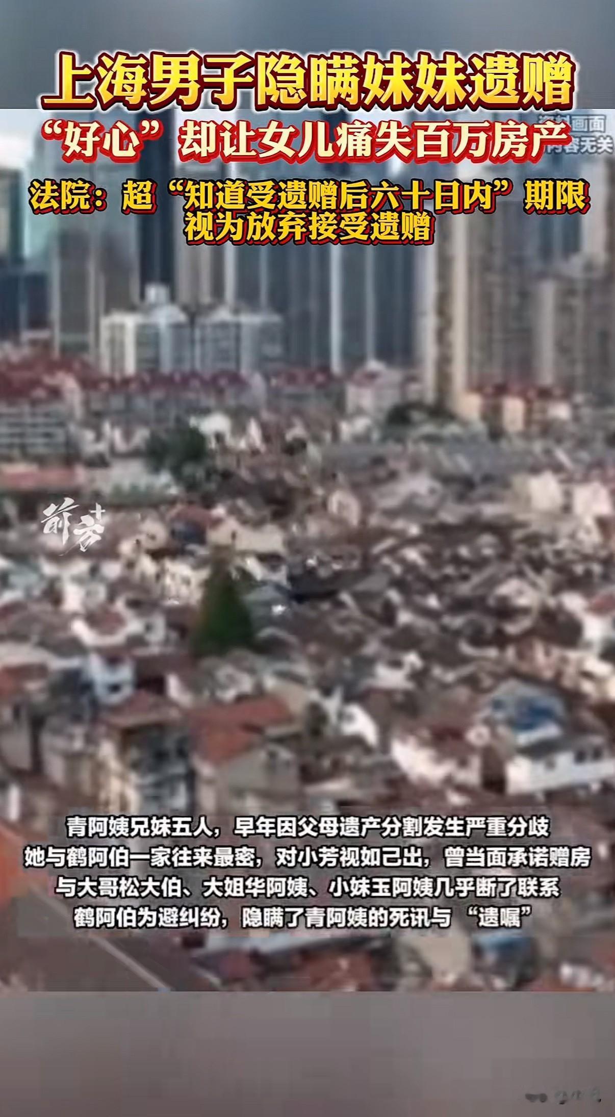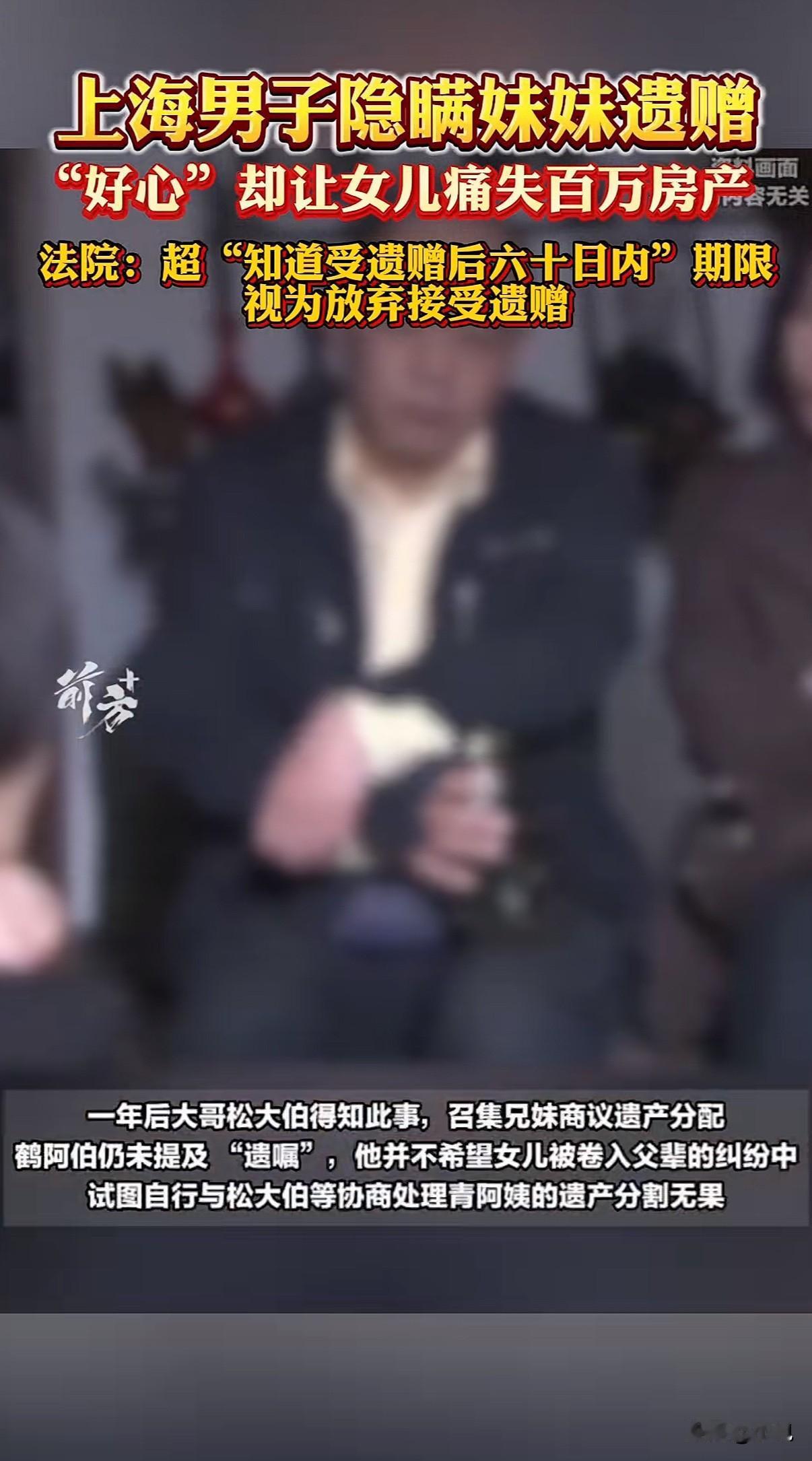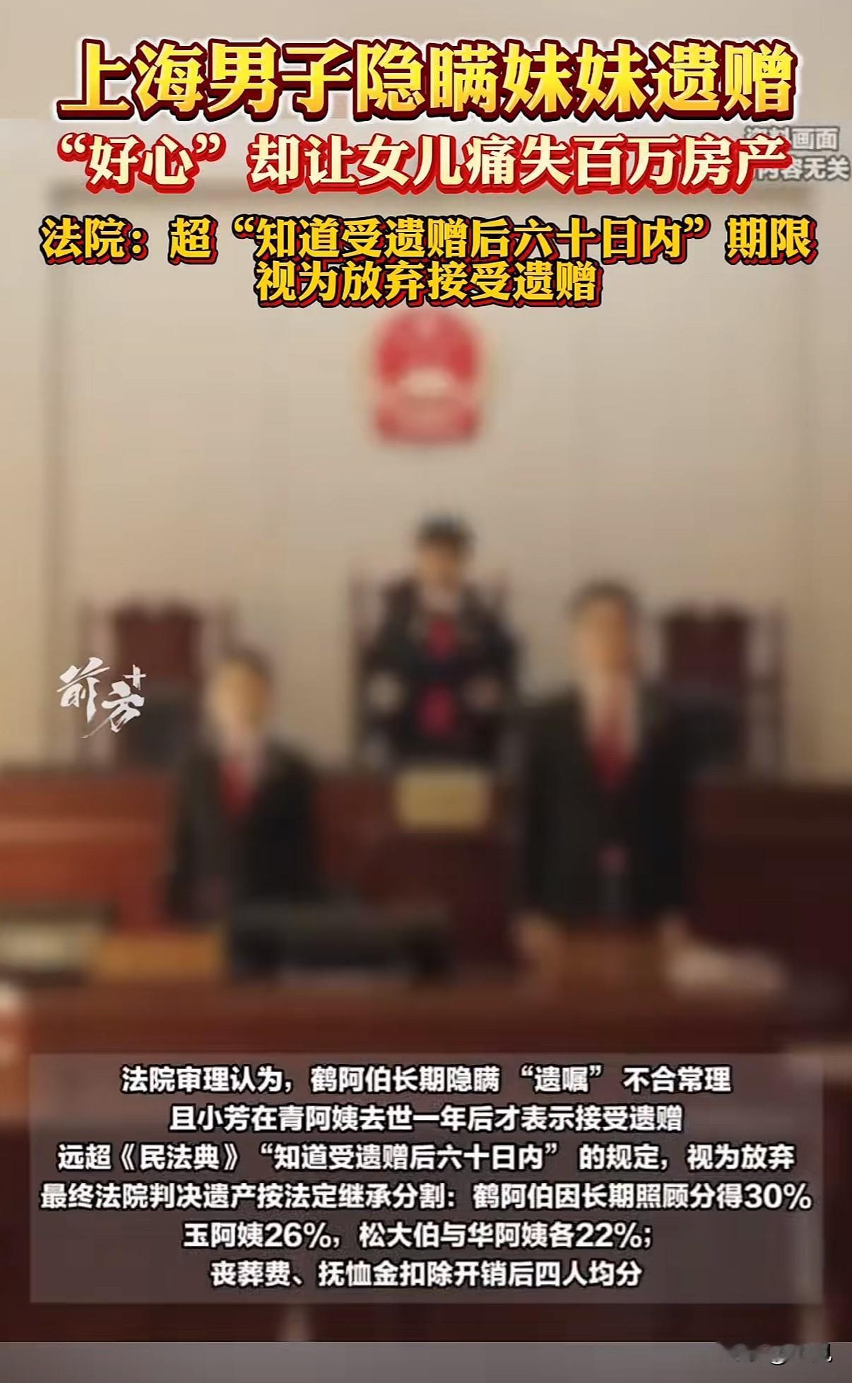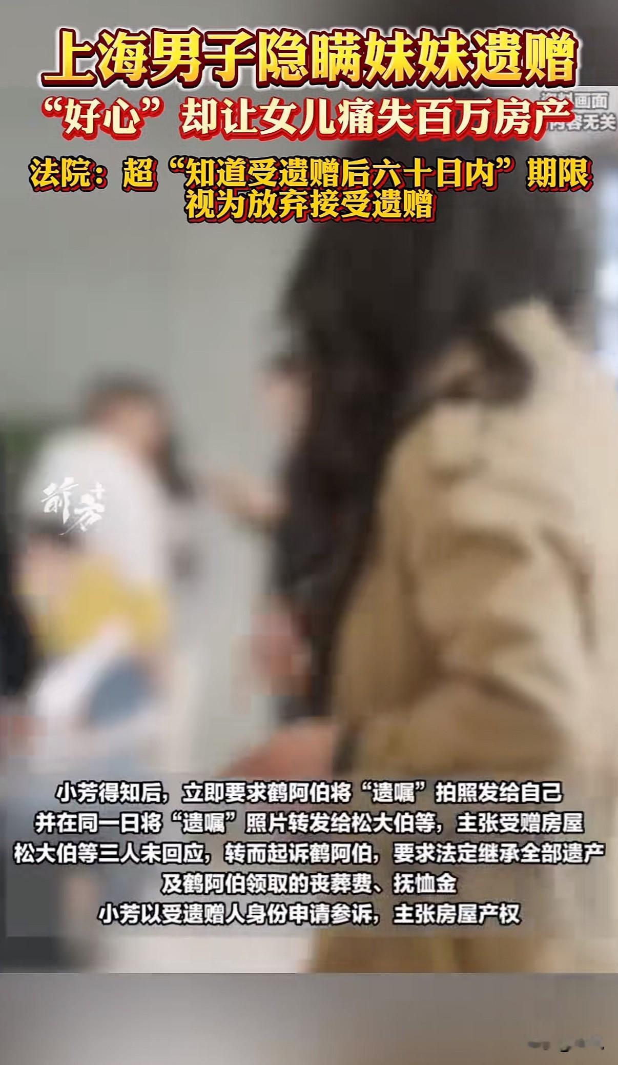 上海一位独居老人把百万房产留给侄女,只因侄女晚了六十天表态,房子没了。 事情是这样的。青阿姨没有子女,老伴也走了,一个人生活。她和自己小哥一家走得最近,特别疼侄女小芳。2014年,她亲笔写下一份东西,说要把自己凉城路那套房子留给小芳。这事她以前也当面对小芳说过。 青阿姨有五个兄弟姐妹,早年因为分爹妈的遗产闹得很不愉快,她和大哥、大姐、小妹后来基本不来往了,只和小哥鹤阿伯一家亲。 2022年2月,青阿姨走了。后事是鹤阿伯操办的。整理东西的时候,他翻出了妹妹那份亲笔遗嘱。可他做了一个决定:谁也不告诉。他没告诉女儿小芳,也没通知其他兄弟姐妹。他的想法是,不想再挑起家庭矛盾,打算自己私下里和哥哥姐姐们商量着把遗产分了。 这一瞒,就是一年。 一年后,大哥松大伯不知怎么得知了妹妹去世的消息。他把还在世的兄弟姐妹叫到一起,商量分遗产。这时候,鹤阿伯还是没提遗嘱的事。他可能觉得,女儿没必要卷进上一代的纠纷里,自己还在努力和其他人协商。 协商没成功。大哥他们干脆一纸诉状,把鹤阿伯告上法庭,要求按法律继承青阿姨的所有遗产,包括那套房子,还有丧葬费、抚恤金。 直到这时候,小芳才从父亲那里知道了遗嘱的存在。她马上让爸爸把遗嘱拍下来发给她,当天就转发给了大伯和姑姑们,明确说,这房子是姑姑留给我的。 但对方没理会她。 小芳只好以受遗赠人的身份,申请参加到官司里去。 法庭上,焦点全在这份遗嘱还有时间上。 法院认为,鹤阿伯作为遗嘱的发现者和保管者,隐瞒长达一年,这不合常理。更关键的是,小芳表示接受遗赠的时间,是在青阿姨去世一年之后。 法律有条规定,受遗赠人应当在知道受遗赠后六十天内,作出接受的意思表示。到期没表示的,就当是放弃。 小芳说,她是在父亲被告上法庭后才知道的,知道后就立刻表态了。 但法院的看法是,小芳和青阿姨关系密切,被视为“应当知道”受遗赠权益的密切关系人。从青阿姨去世到她表态,中间隔了一年,远远超过了六十天的法定期限。 因此,遗赠失效了。 最后,房子没有到小芳手里。法院判决按法定继承来分。考虑到鹤阿伯长期照顾妹妹,分了30%。其他三位兄弟姐妹,玉阿姨26%,松大伯和华阿姨各22%。丧葬费那些,扣掉实际开销,四个人平分。 一份写了八年的遗嘱,一份迟了一年的知情,结果天差地别。 有人觉得法律冷冰冰,六十天太不近人情。有人觉得父亲的好心办了坏事,隐瞒反而害了女儿。也有人觉得,其他兄弟姐妹明明知道小芳和阿姨亲,却一点份额也不让,亲情在房子面前很脆弱。 这里面有法律的刚性,也有人情的复杂。鹤阿伯想息事宁人,却让女儿失去了最重要的东西。小芳最终错过了期限,房子变成了四个兄弟姐妹的共有财产。 一场官司,断了一桩遗愿,也把旧日家庭裂痕晾在了阳光下。