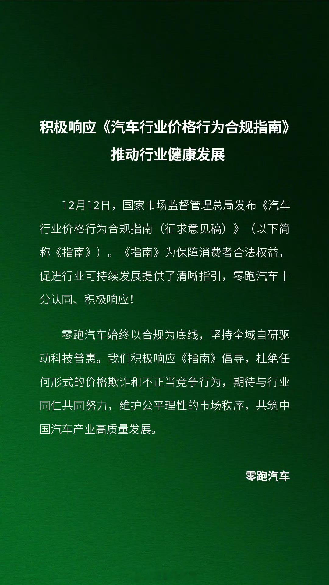 零跑汽车积极响应《汽车行业价格行为合规指南》:坚守合规底线,践行公平竞争。国家市场监督管理总局 12 月 12 日发布了《汽车行业价格行为合规指南(征求意见稿)》,对汽车生产、销售企业给予了明确、具体、全面的指导和提示。零跑汽车今日宣布积极响应该《指南》。 零跑308_IO新能源汽车