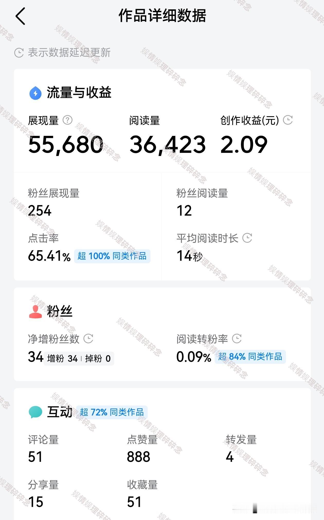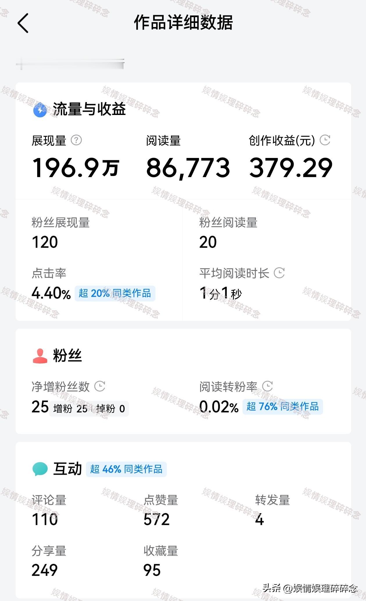 头条收益真的是个玄学, 我以为高点击、高互动就能有好收益,但是现实给我了重重一击…… 最近一篇文章点击率超高,达到65%,可以算是我写头条以来点击率最高的一篇了,互动率我感觉也还不错,但是大家看看收益,3万多阅读量收益只有2块钱,简直可以忽略不理了。千次阅读单价是多少,我都不想计算了。 来头条5个月了,展现量从几千到几万,然后慢慢有了几十万的小爆文,最多的一篇文章是196万展现,收益300+。虽然和大咖们的收益比起来,微不足道,但至少让我尝到点甜头了。 和大部分条友一样,希望有好的单价,慢慢提高收益,认真写好每一篇文章,申请了三次新锐创作者都失败了,原因都是内容质量有待提高。我也不纠结了,想怎么写怎么写吧。 虽然失望过,气馁过,想过要放弃,但是还是一天天在坚持。我告诉自己,放下对“标签”和“爆款”的执着,为那个从零走到今天的自己而写,相信终会在未来的某个时刻有所收获,而在这之前,每一字都是阶梯。 条友们,你们有过低落的时候吗?是怎么坚持下来的? 收益分析
