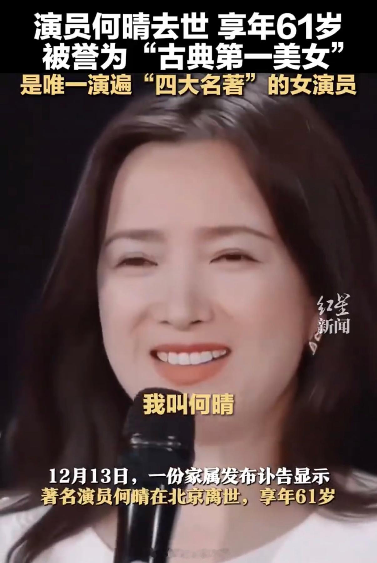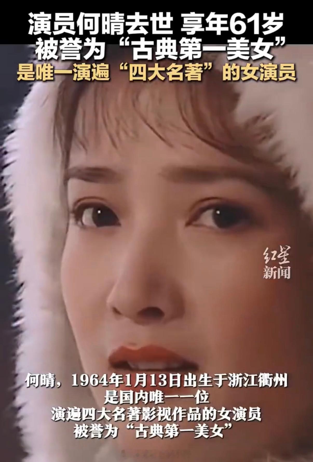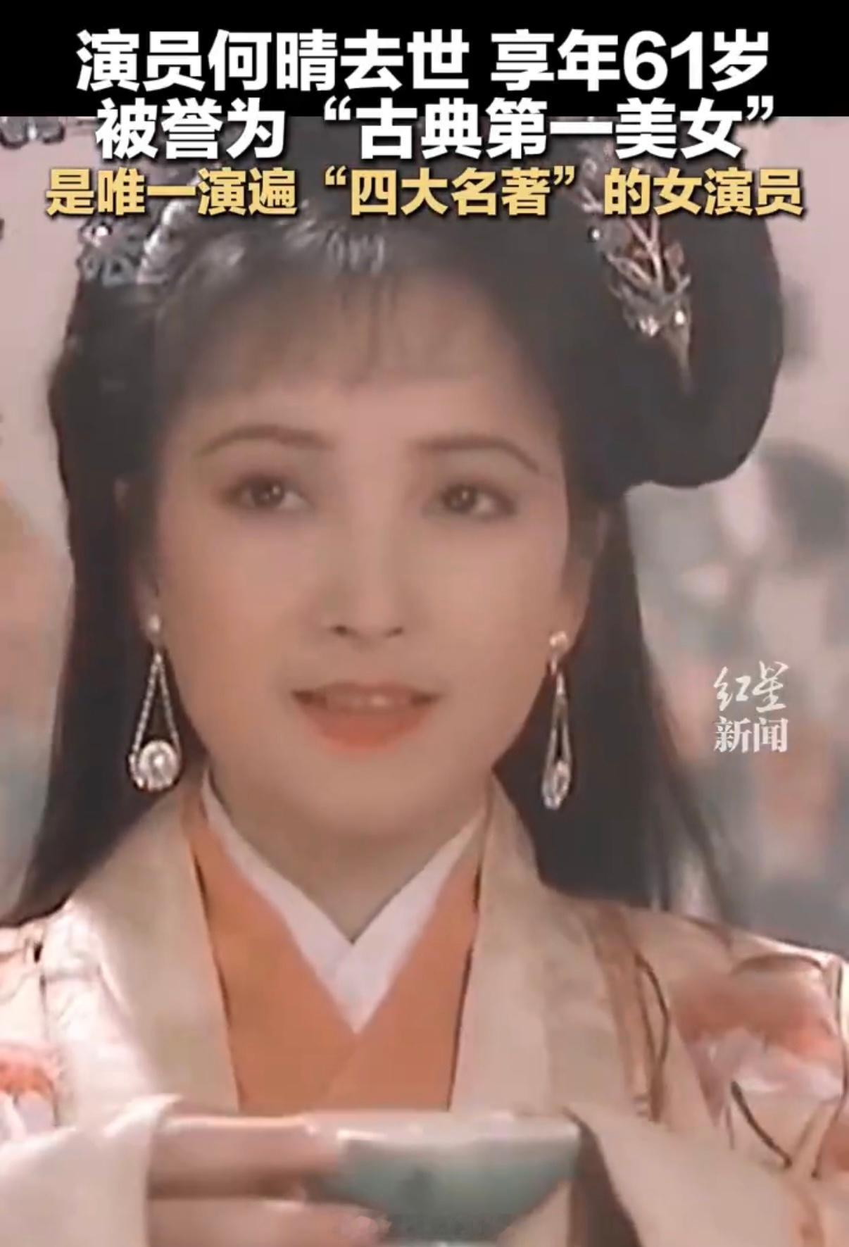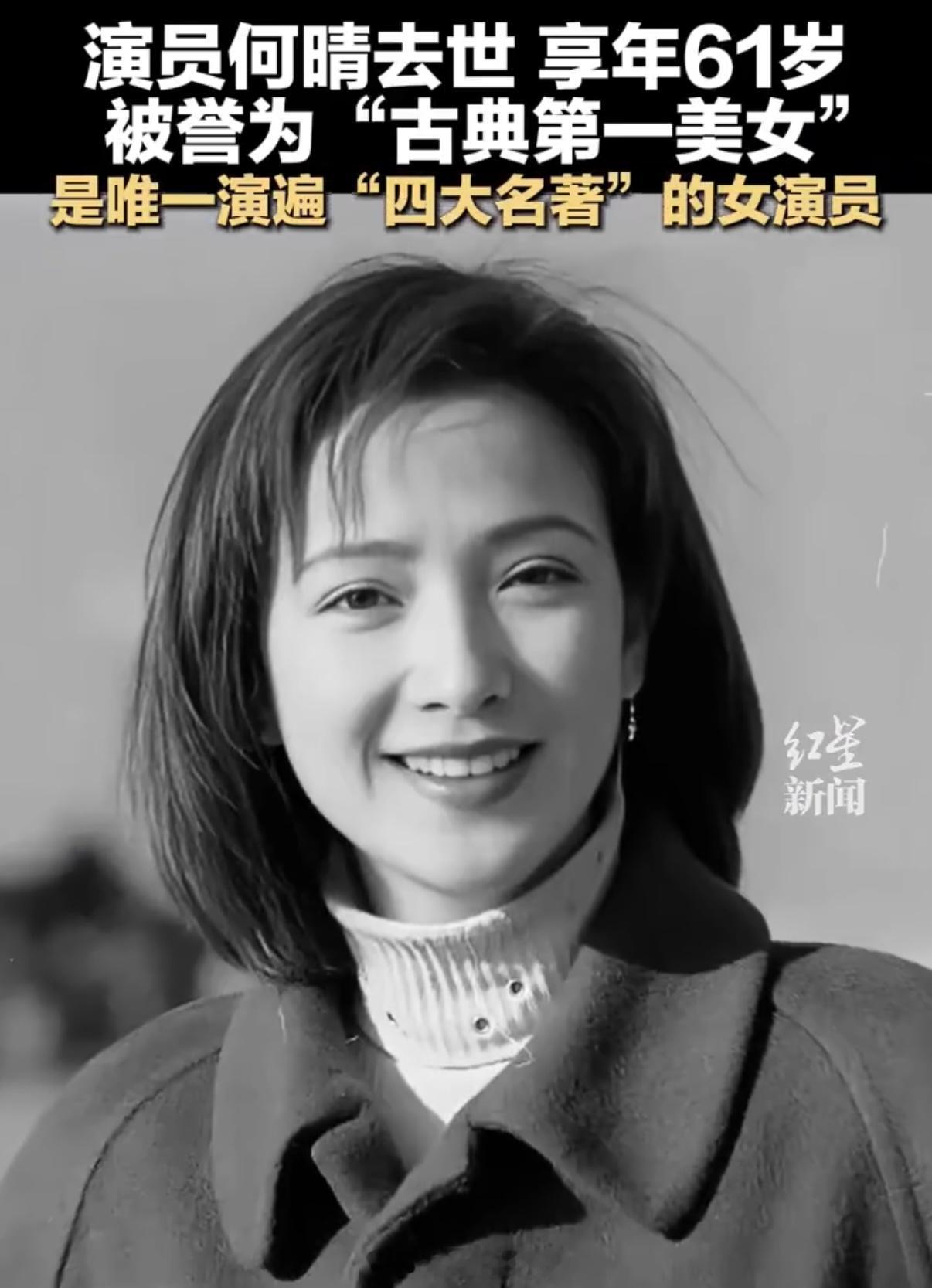 刚听说何晴老师走了,心里一沉。想起她演的那些角色——灵吉菩萨的慈悲,小乔的娇憨,李师师的清艳……四大名著里都有她的影子,真是把古典美刻进观众心里了。才61岁啊!她的戏我总爱翻出来看,现在再看,倒像在跟老朋友道别了。演员何晴去世