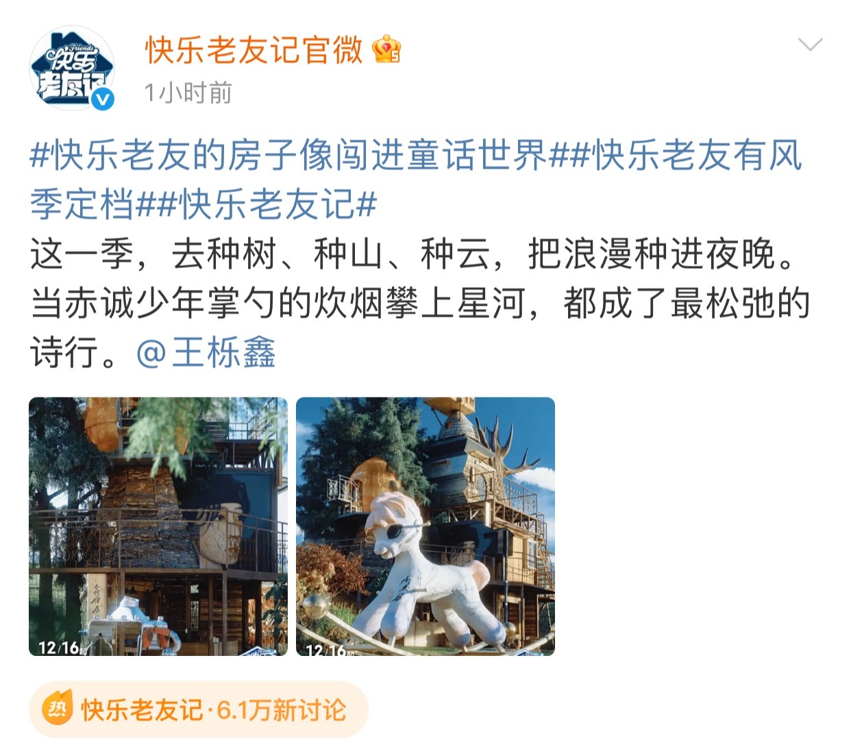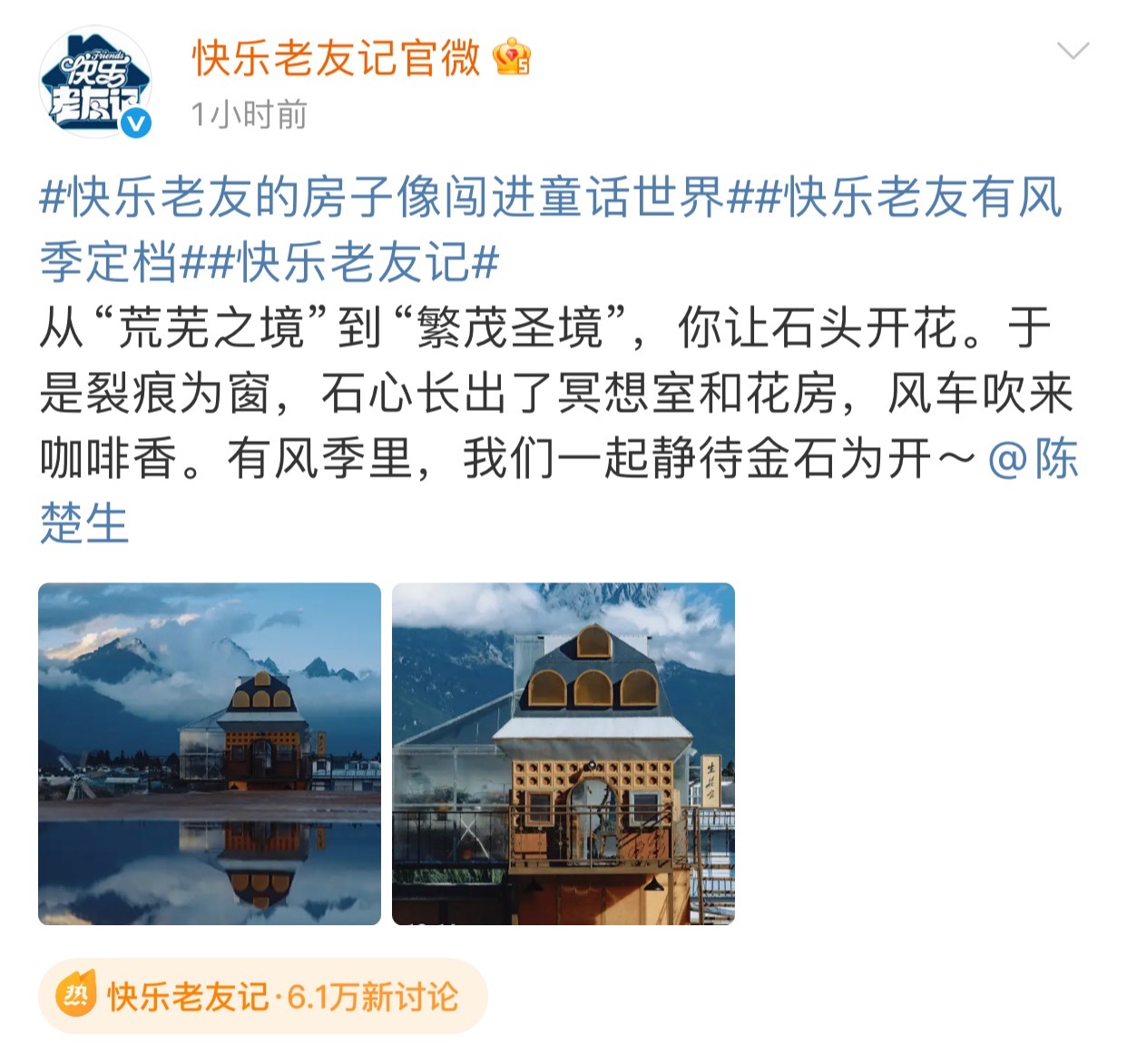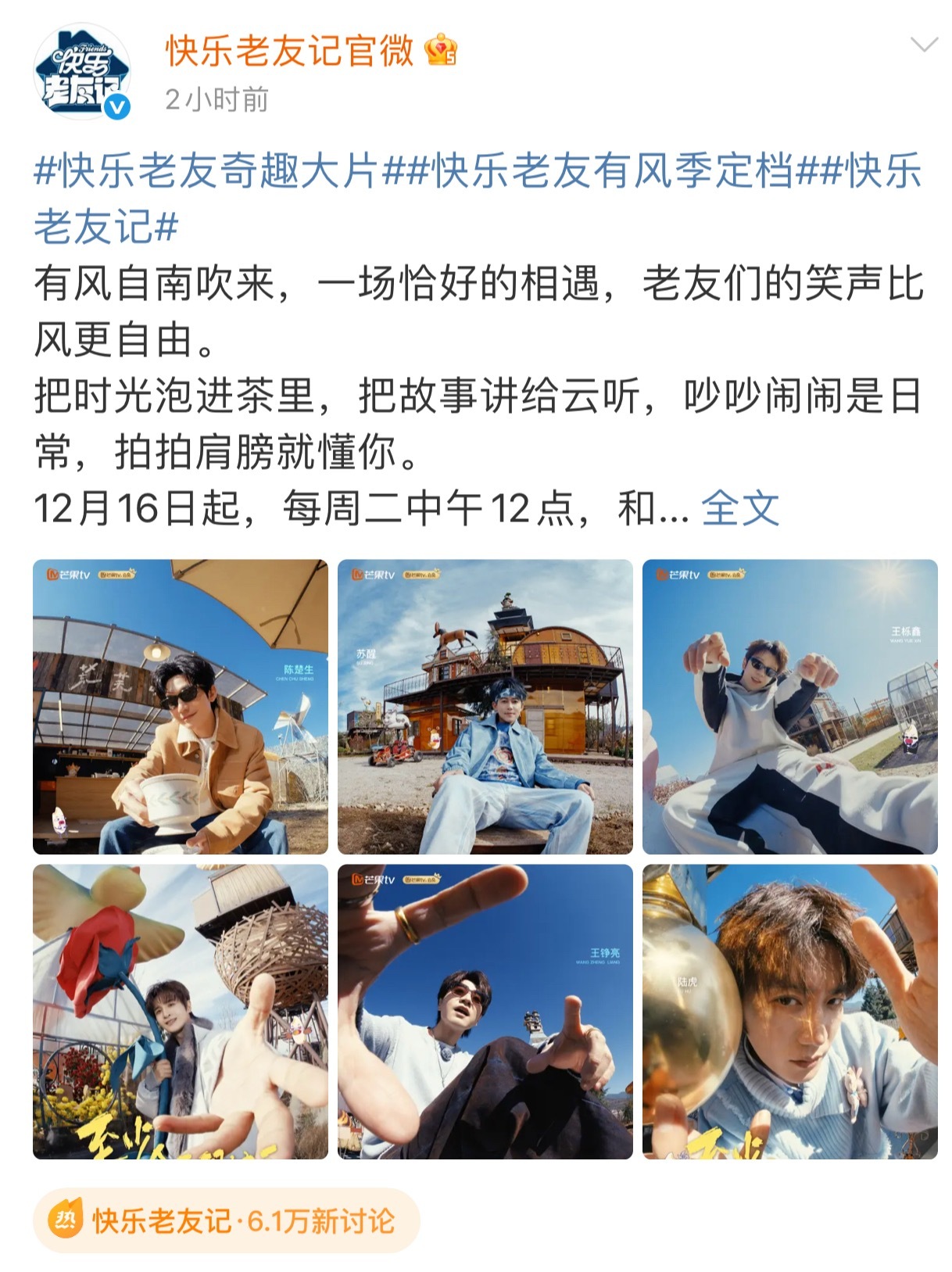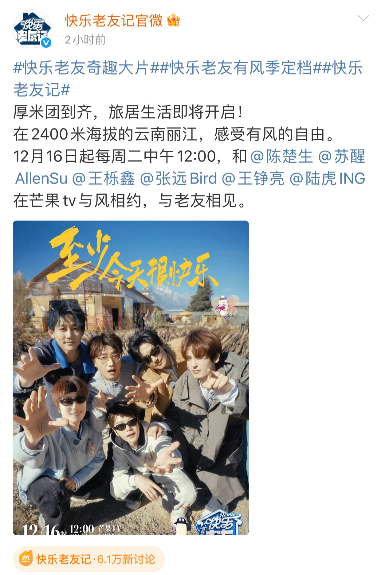快乐老友记官宣一口气发了69张图 哦莫,快乐老友记有风季官宣直接甩出69张连环暴击图——这哪是定档预告,这分明是给眼睛做了场SPA!陈楚生、苏醒、王栎鑫、张远、王铮亮、陆虎每个人都有属于自己的房子,有风是真疯,去了云南是真滇,我的电子榨菜终于回来了!期待播出~快乐老友记