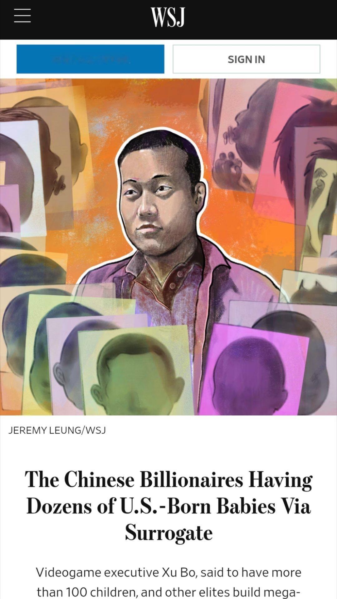 好家伙!徐老板在美国搞代孕,打官司,要求索回多个“中美犹太混血”的孩子,上了WSJ!重点是,这篇报道还提到一个叫Wang Huiwu的“富有的高管”,在美国用模特的卵子代孕了10个女孩,“目标是把她们嫁给成功人士。”科学人医疗社会史