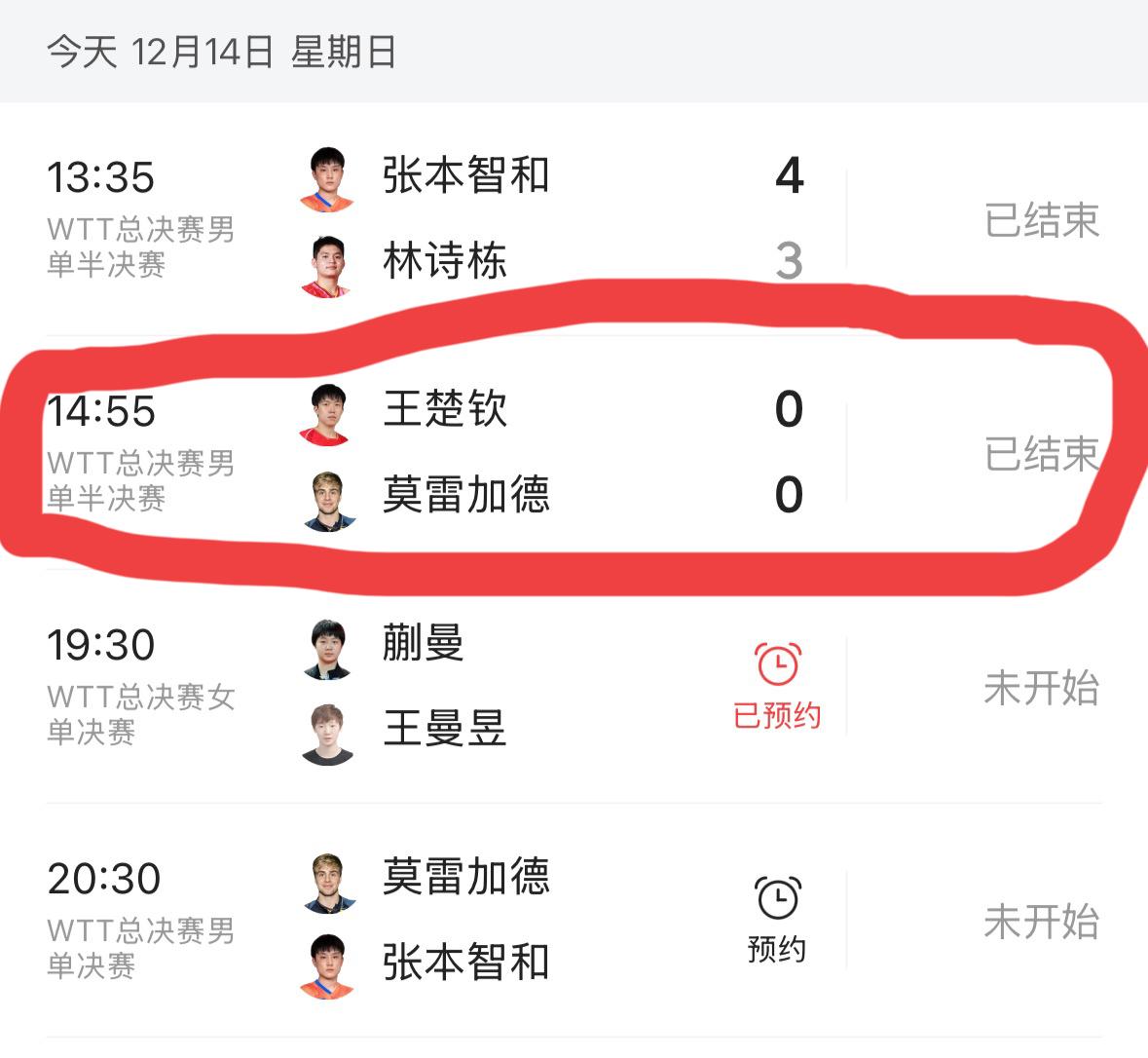 太意外了! 万万没有想到!继昨日国乒女单选手世界排名第一的孙颖莎在女单半决赛中因伤中途退赛后,今日,国乒男单选手世界排名第一的王楚钦也在男单半决赛中因伤退赛。 今天WTT香港总决赛赛程,我在手机上预约了王楚钦与莫雷加德的男单半决赛,可是当我下午点开手机时,却发现了奇怪的一幕,赛程显示:王楚钦与莫雷加德的比赛已结束,再看比分时,竟然是零比零,我大为惊讶,马上返回头条首页,这时就看到了王楚钦因伤退赛的消息,这样,莫雷加德不战而胜,顺利晋级男单冠亚军的决赛,决赛对手是日本队的张本智和。 2025 年的WTT香港总决赛,女单包揽冠军,亚军,季军,男单无缘冠军和亚军! 无论是谁,身体都是第一要素。希望王楚钦和孙颖莎这一对深受球迷喜爱的、世界排名第一的乒乓球高手,调理好身体,早日重返赛场!