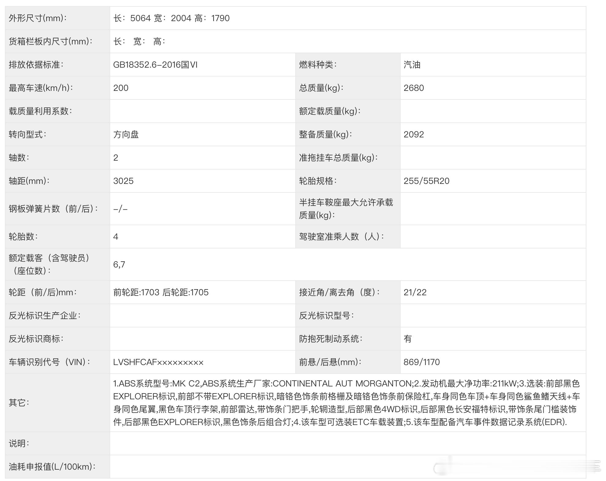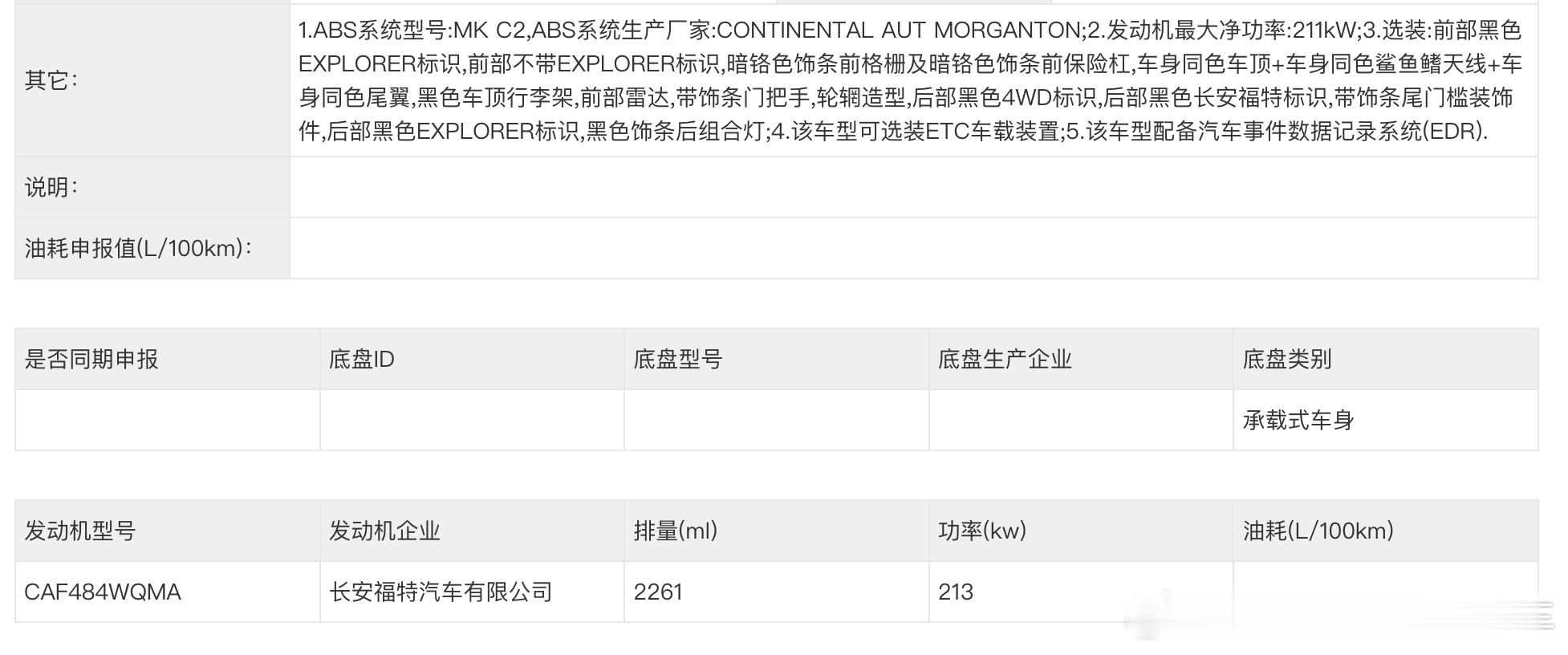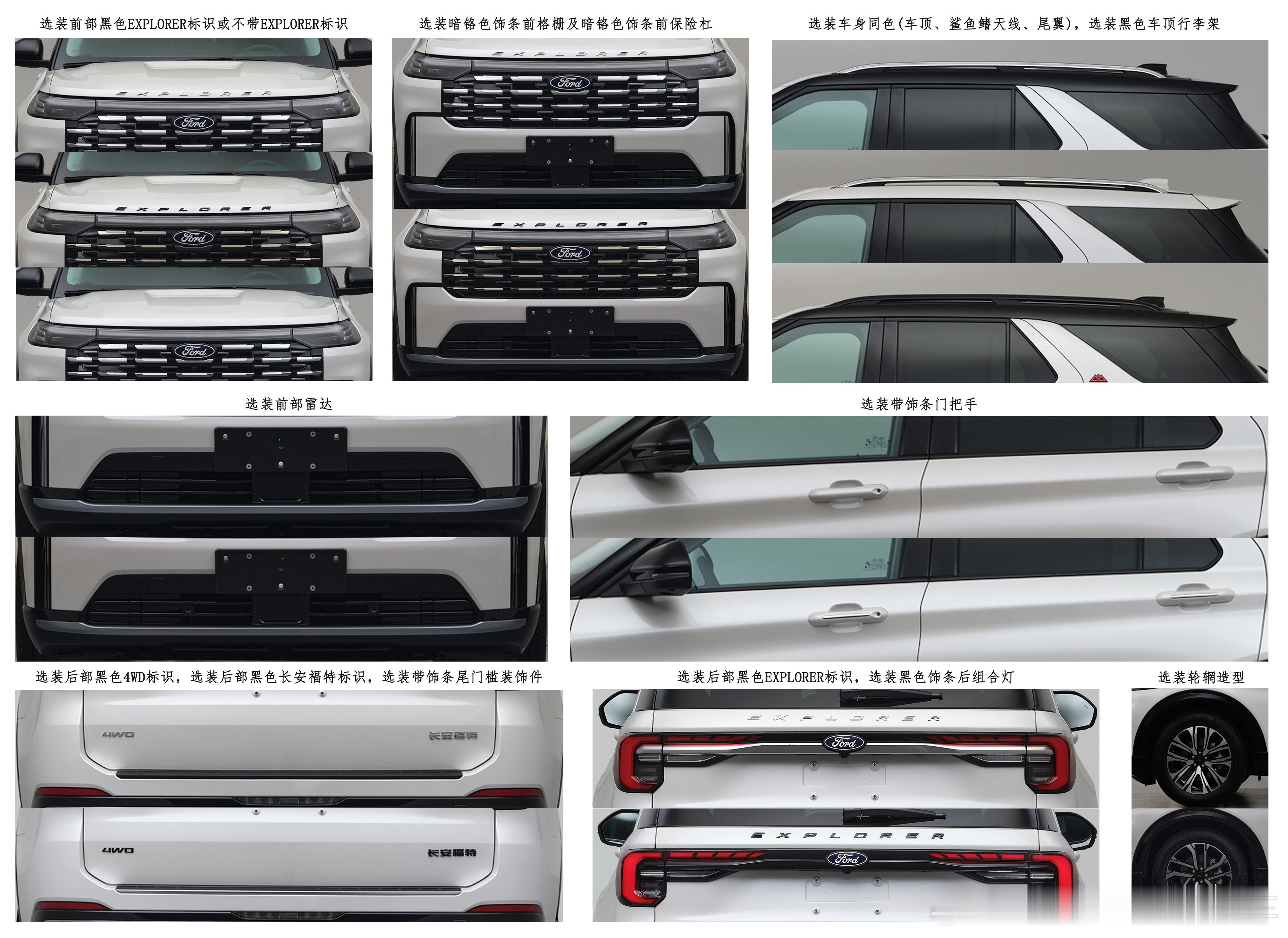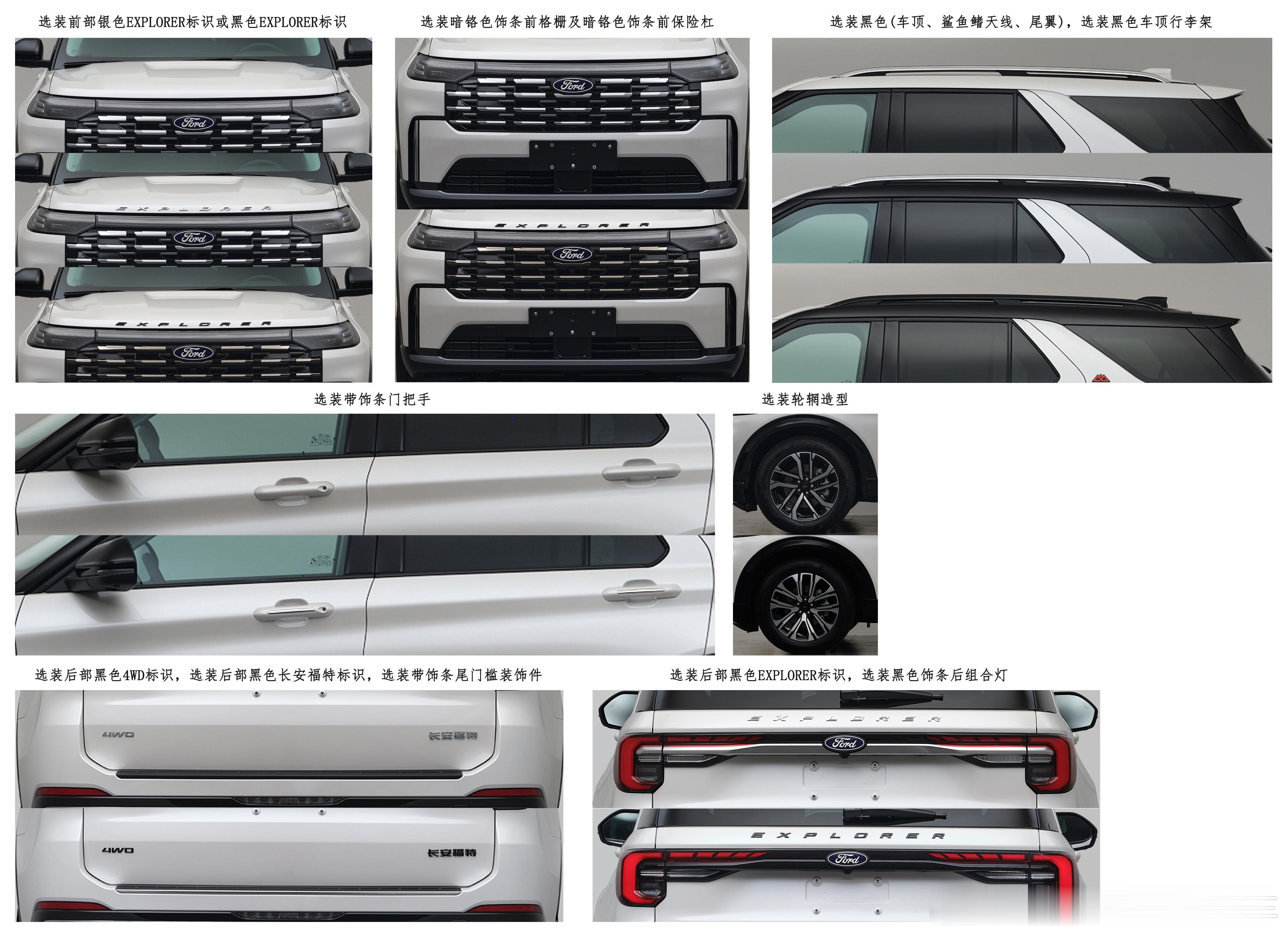 【新款福特探险者申报,5、6、7座都有,延续2.3T】近日,新款福特探险者登陆了工信部402批新车申报。新款探险者以外观细节优化为主,大灯以及前包围造型出现了较大改动,动力进一步延续2.3T,继续提供5座、6座以及7座车型,预计于2026年一季度上市。外观设计上,新车的调整主要集中在头部,隔栅样式进行了调整,现款有蜂窝孔洞状的,且稍早的2024款也有贯穿横条银色镀铬结合短条镀铬的。但新款统计样式为等宽横条镀铬,上下共四层,并给出了两处选装,一处是在机盖下沿,有无EXPLORER字标、银色EXPLORER字标和黑色EXPLORER字标三种;另一处是位于隔栅和前保险杠饰条,分亮银色和暗铬色。新的头灯样式,日间行车灯扁平化的三段式,其中第一段和中央贯穿式灯带连结在一起,如一把锐利光剑穿透机盖和前格栅之间。大灯主灯体积大幅受窄,显然与照明科技向高亮度但小体积化的技术迭代有关。此外,车顶行李架、鲨鱼鳍天线、车尾字标也分为银色和黑色两种,满把手也分为有/无银色贯穿饰条的两种。车身后侧翼子板处,也看到了有/无山峰标识的两种,意味着倍受欢迎的昆仑穿越/昆仑巅峰系列车型将继续提供。车轮申报了两个样式,比现款数量有所减少,没有看到现款昆仑巅峰版的黑色为主配亮橙色的轮毂,但个人预计后面必然会推出。车身尺寸申报数据长宽高为5064/2004/1790毫米,轴距为3025毫米,继续提供5座、六座和七座三个版型。动力方面,沿用成熟可靠且强劲的2.3T EcoBoost发动机,由于该机型提供电控涡轮增压、缸内直喷等技术,使得动力成为探险者的同级优势,最大功率213kW(289马力),峰值扭矩425N·m,匹配10挡手自一体变速箱,也将继续提供后驱与四驱版本可选。探险者的四驱张局在以往视频推送中也介绍过,采用多片离合器结构,高配更进一步配备后桥限滑差速器,所以探险者的越野能力也处在承载式结构车型和非承载式车型之间,成为兼顾城市/长途舒适性和越野能力的万金油选手。汽场全开大V聊车