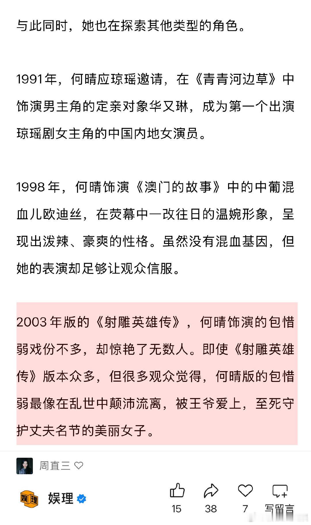 何晴劝黄绮珊别去整容 何晴和许亚军的家人都是好朋友 在“四大名著”之外,何晴也在探索其他类型的角色。1991年,何晴应琼瑶邀请出演了《青青河边草》。2003年版的《射雕英雄传》中,何晴饰演的包惜弱戏份不多,却惊艳了无数人。很多观众觉得,何晴版的包惜弱最像乱世中的美丽女子…娱理独家↓