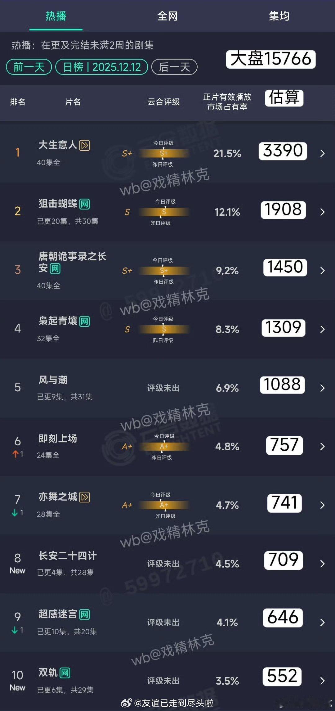 1214云合3.《双轨》1782w,市占率10%,次日翻倍3.2倍4.《长安二十四计》1746w,市占率9.8,次日翻倍2.5两部剧的次日表现都算稳住了,都稳住了自己受众的观众群,没有开门即送客,火不火还要继续看后续剧情 双轨云合超长安二十四计