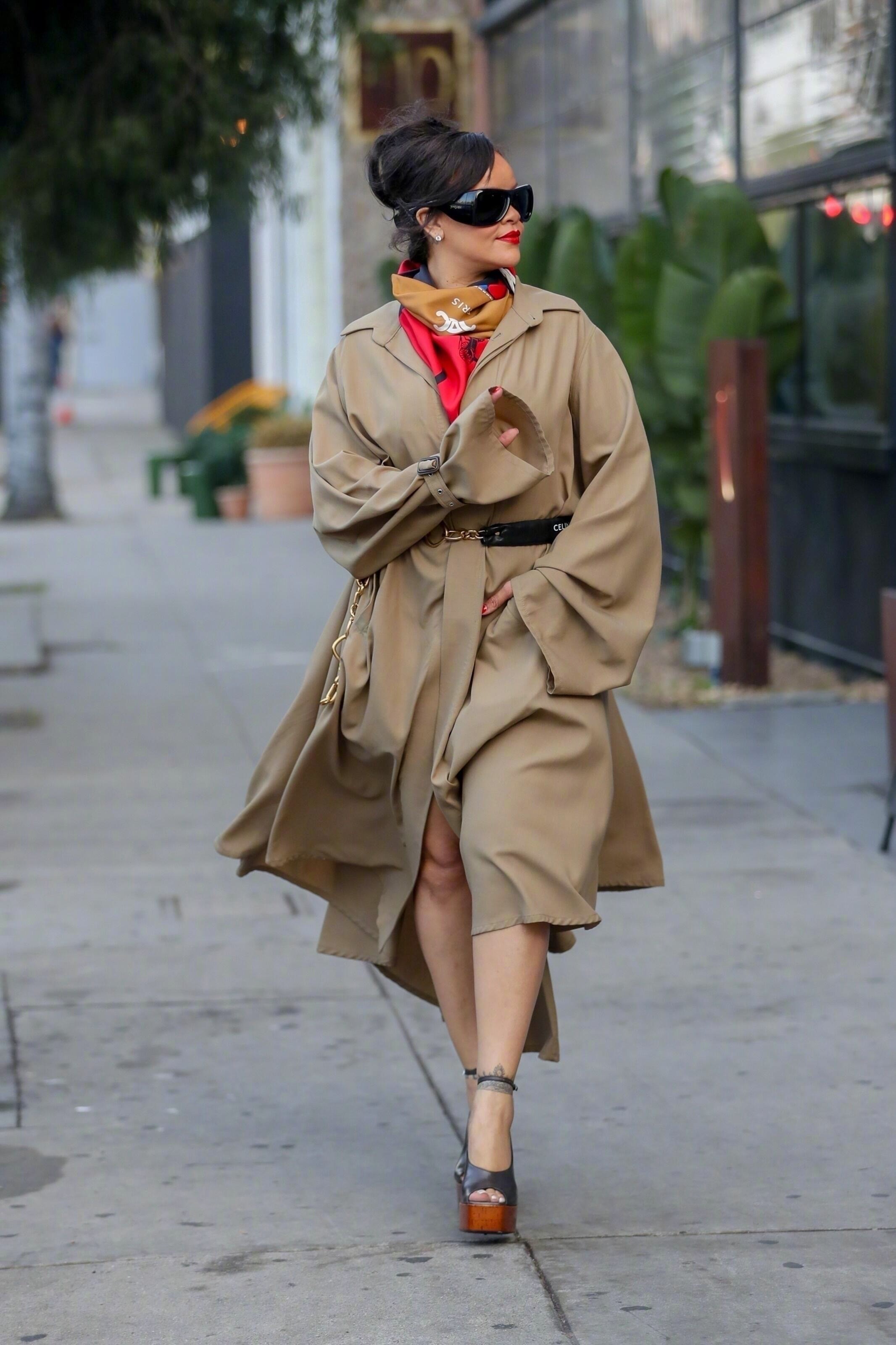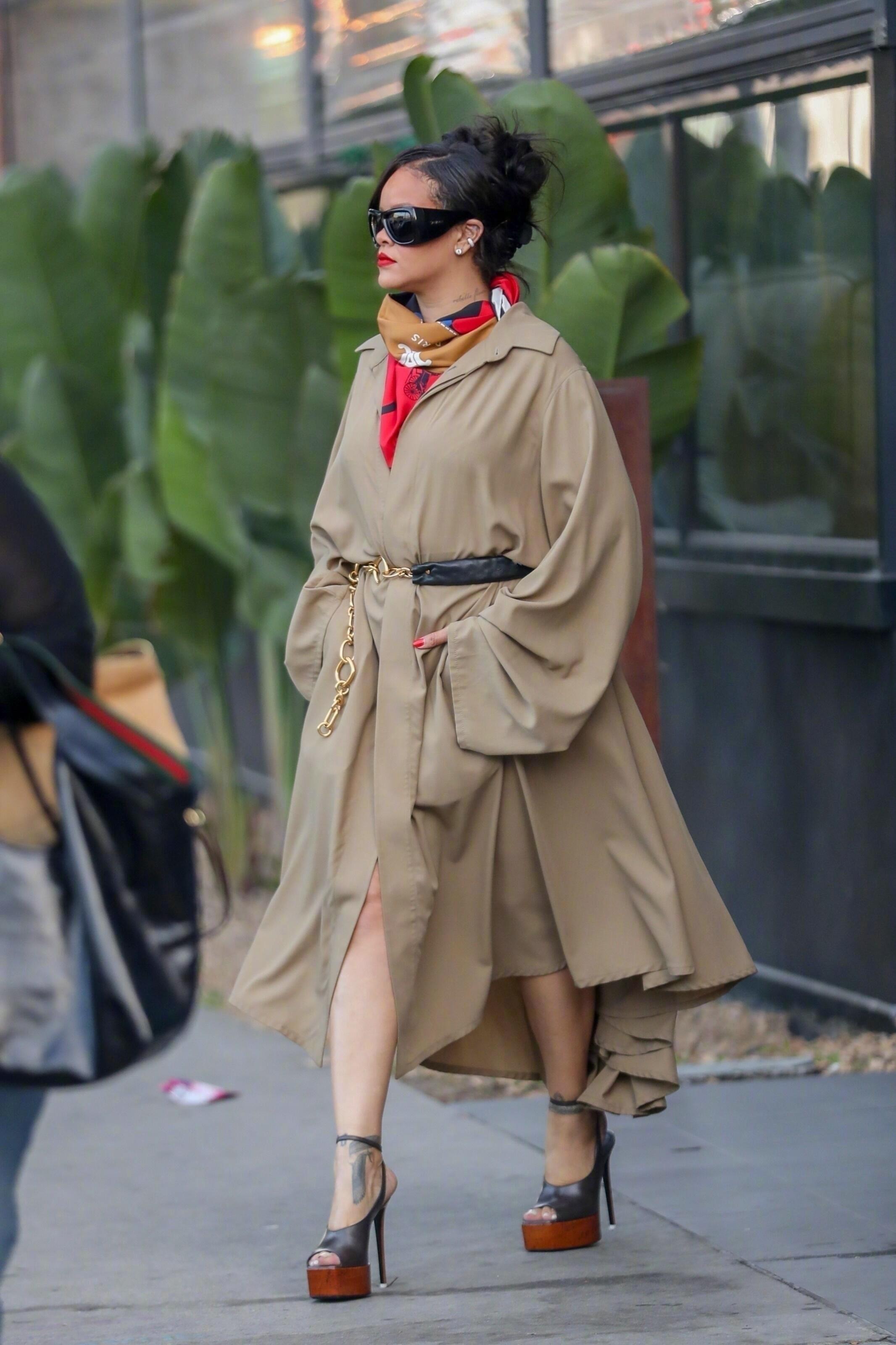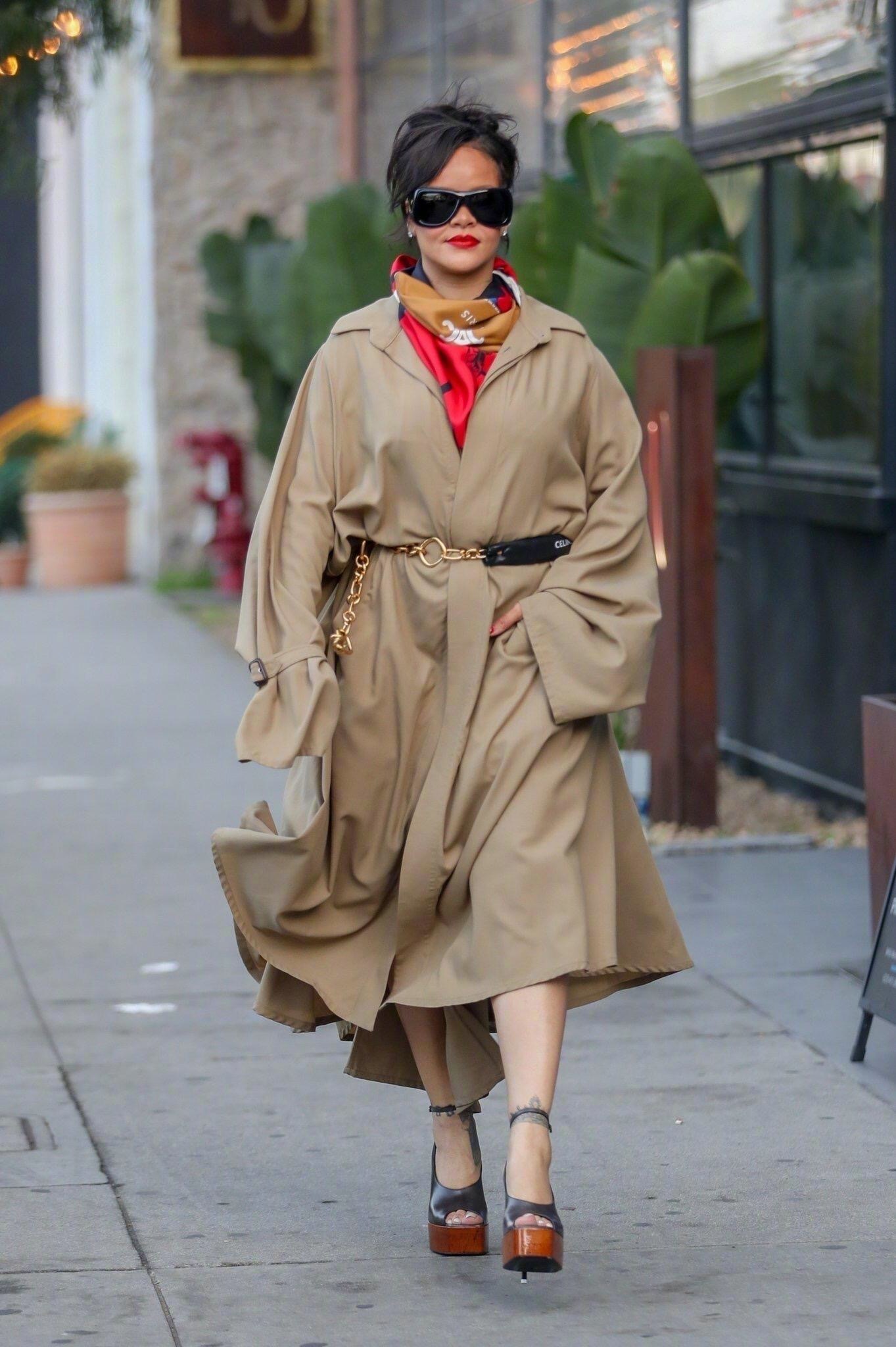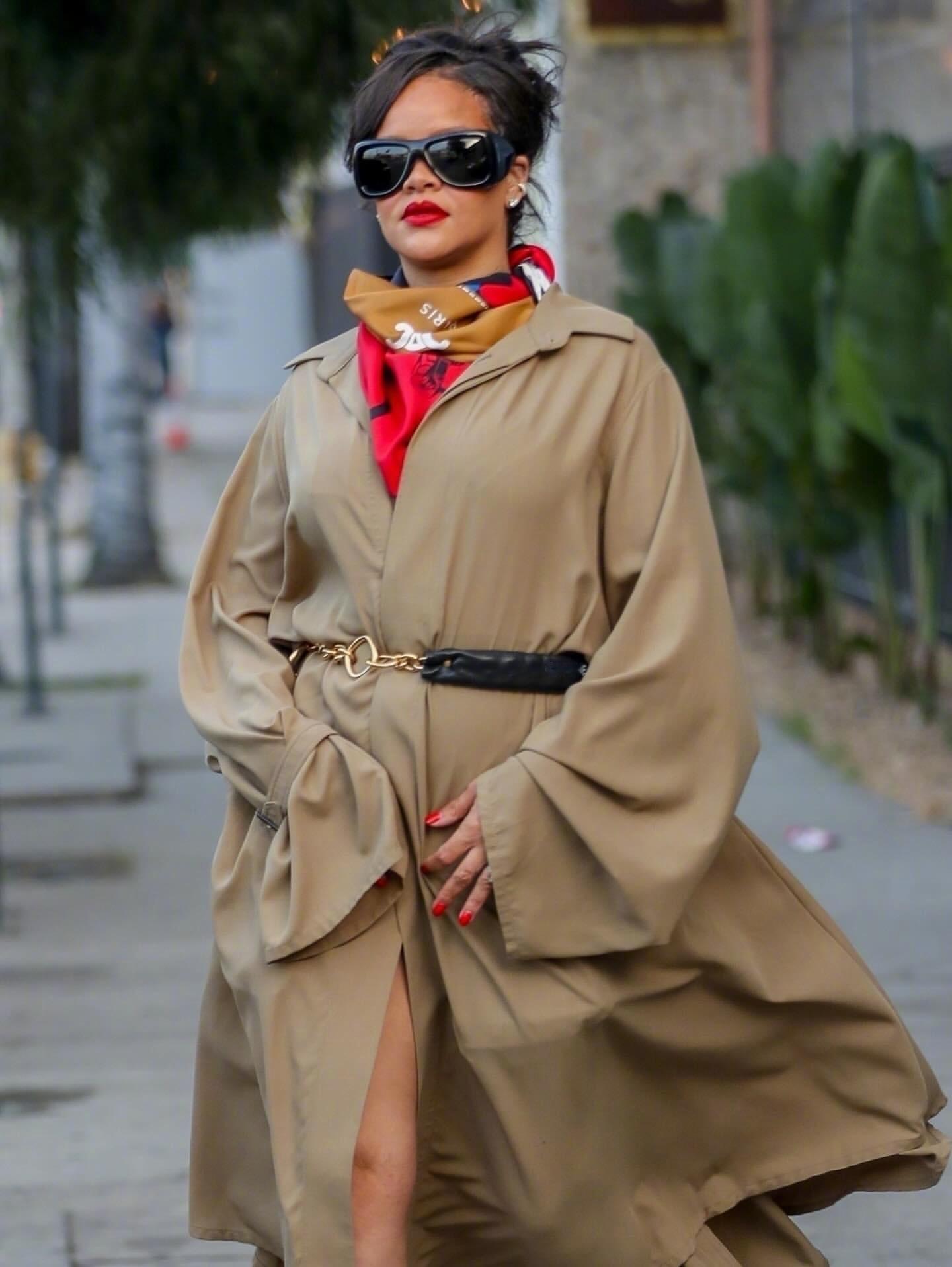 辣妈蕾哈娜一个人现身洛杉矶街头办事的街拍。身穿Celine 2026春季系列风衣🧥,围巾、腰带同出自该系列,脚踩Attico 厚底高跟鞋。外网热议蕾哈娜越来越白了!米拉服饰解析