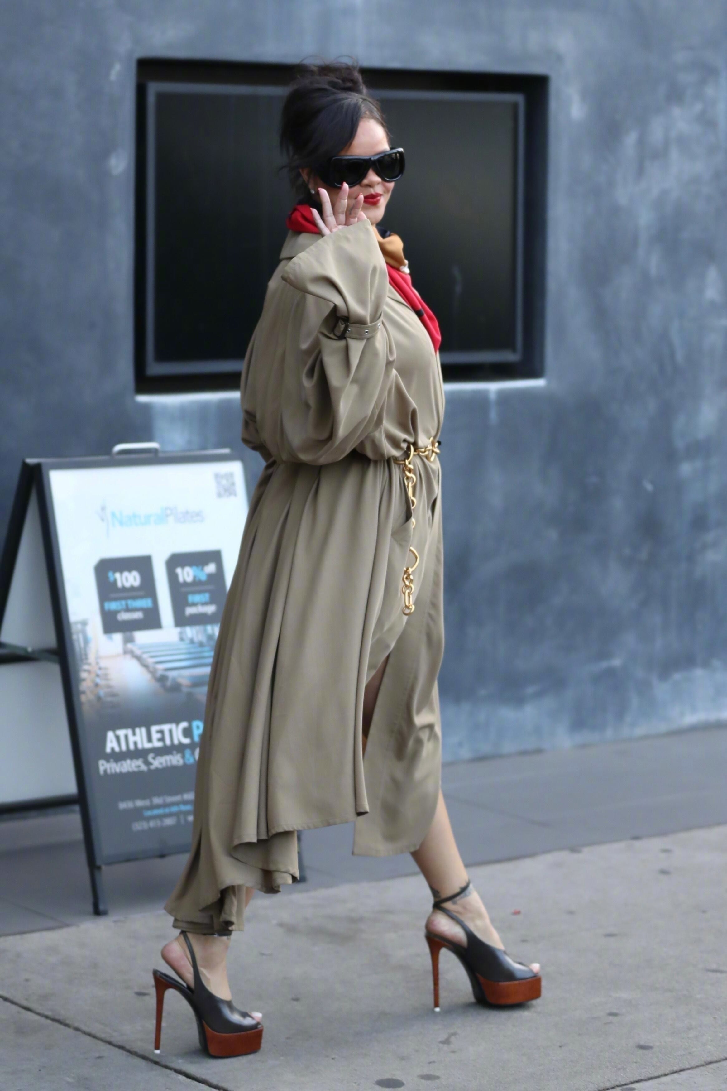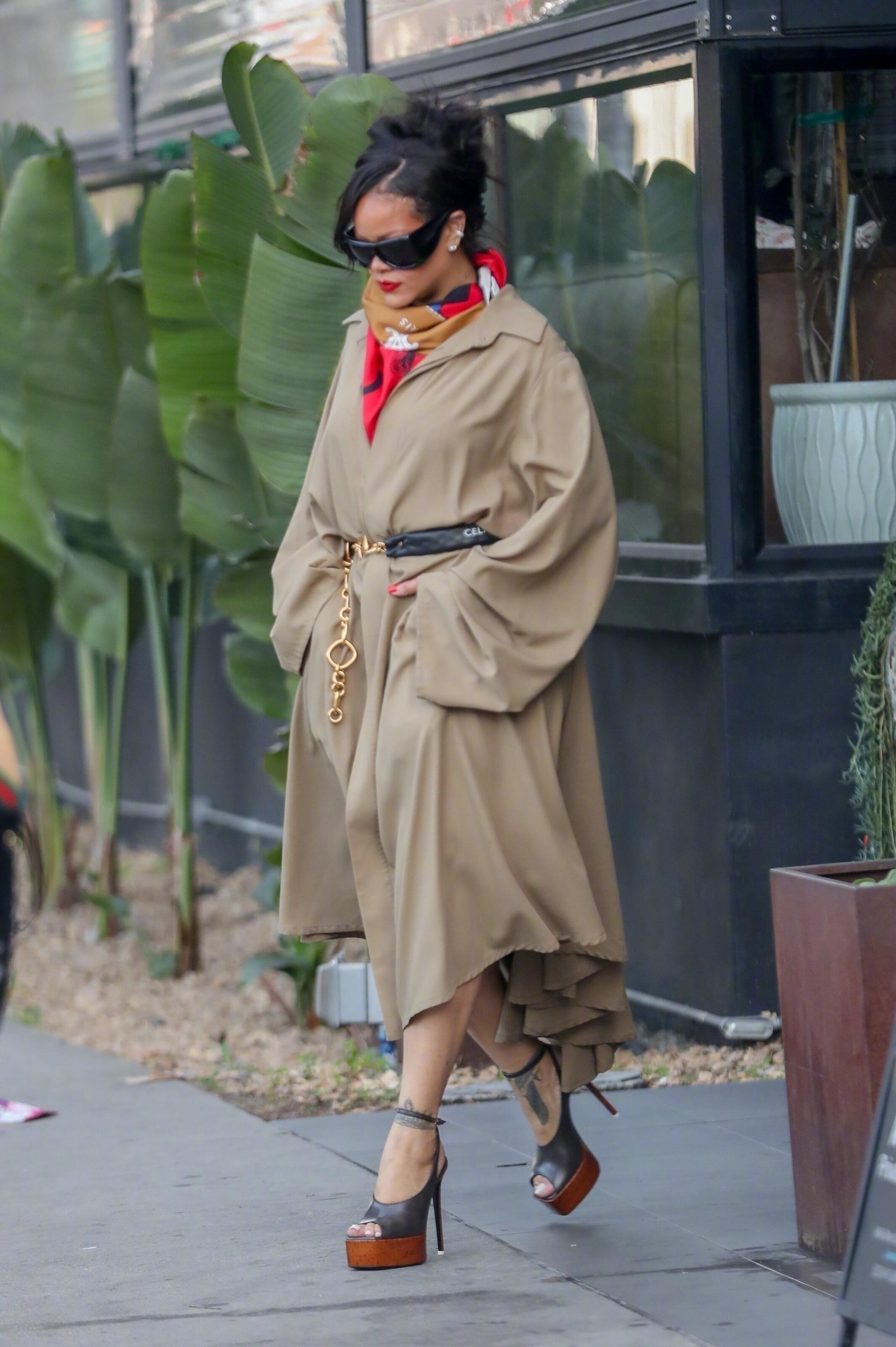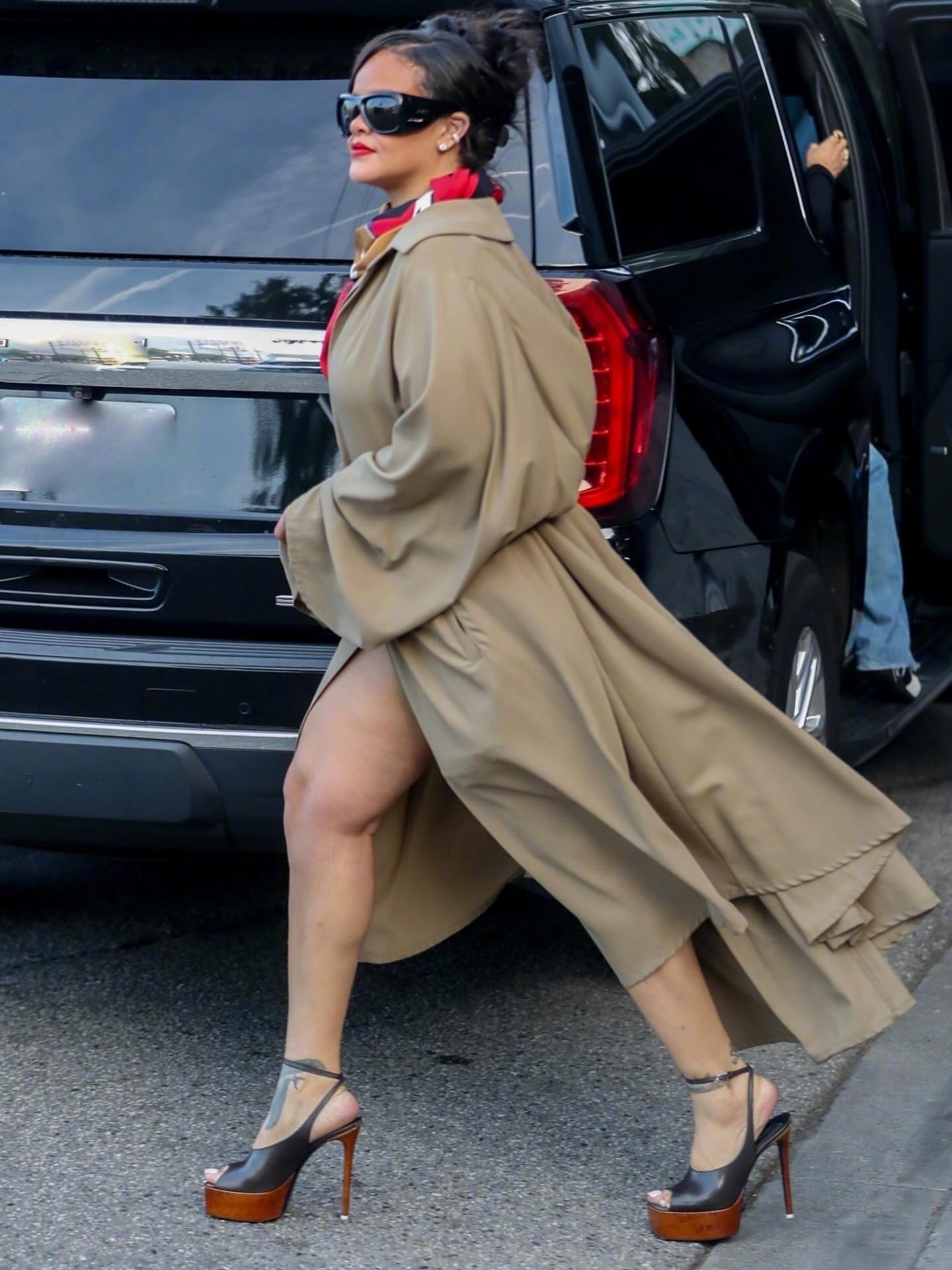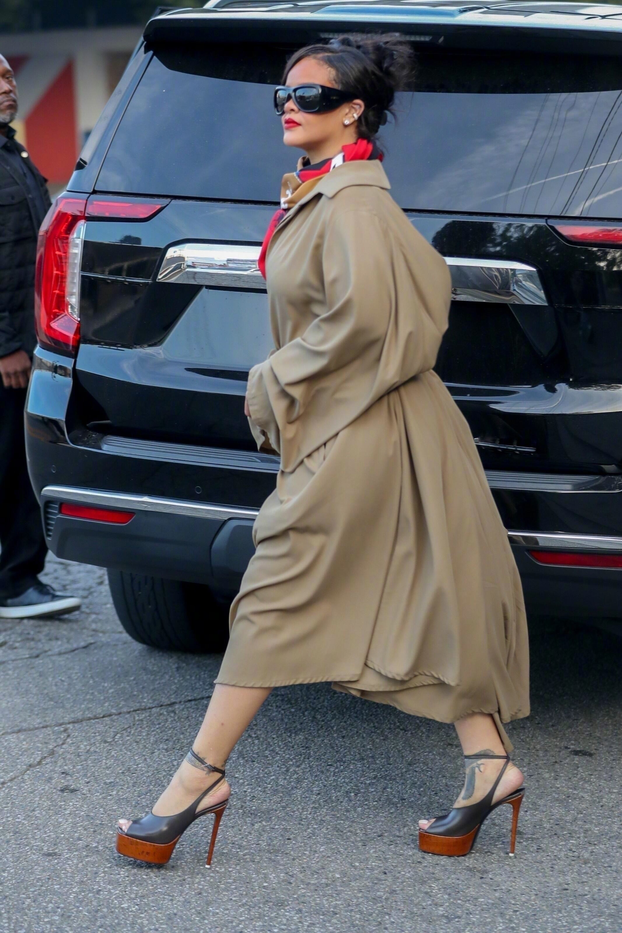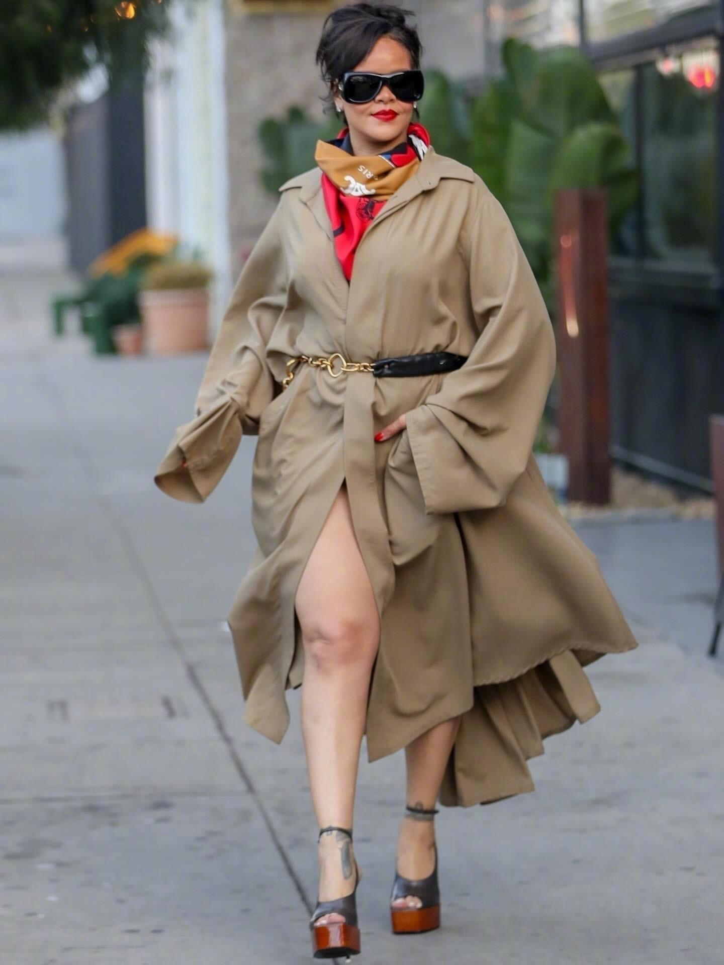 辣妈蕾哈娜一个人现身洛杉矶街头办事的街拍。身穿Celine 2026春季系列风衣🧥,围巾、腰带同出自该系列,脚踩Attico 厚底高跟鞋。外网热议蕾哈娜越来越白了!米拉服饰解析