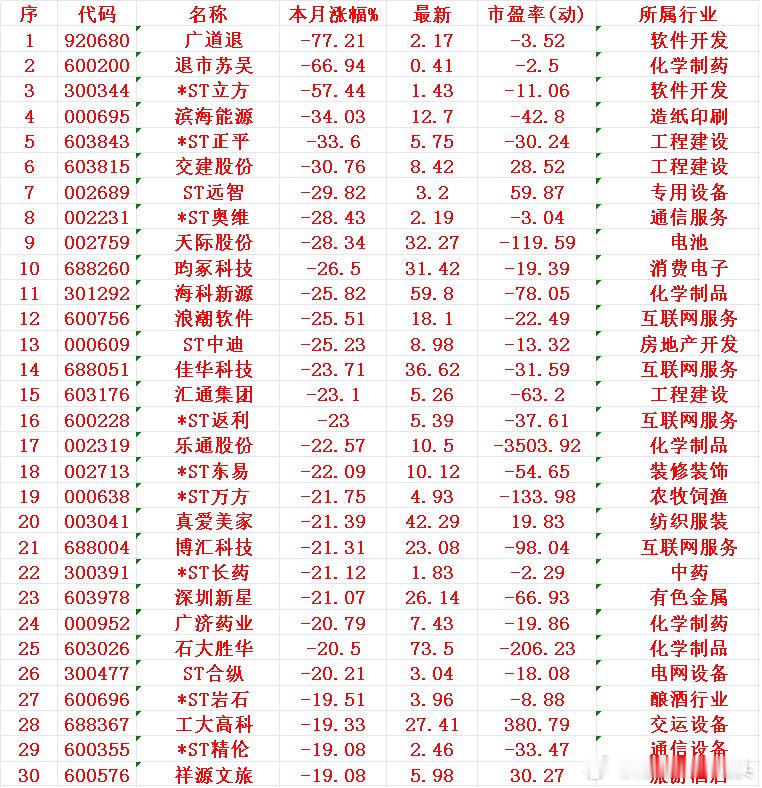 十二月以来,整个市场“跌幅最大”的30名单广道退:本月涨幅 -77.21%,所属行业 软件开发退市苏吴:本月涨幅 -66.94%,所属行业 化学制药*ST立方:本月涨幅 -57.44%,所属行业 软件开发滨海能源:本月涨幅 -34.03%,所属行业 造纸印刷*ST正平:本月涨幅 -33.60%,所属行业 工程建设交建股份:本月涨幅 -30.76%,所属行业 工程建设