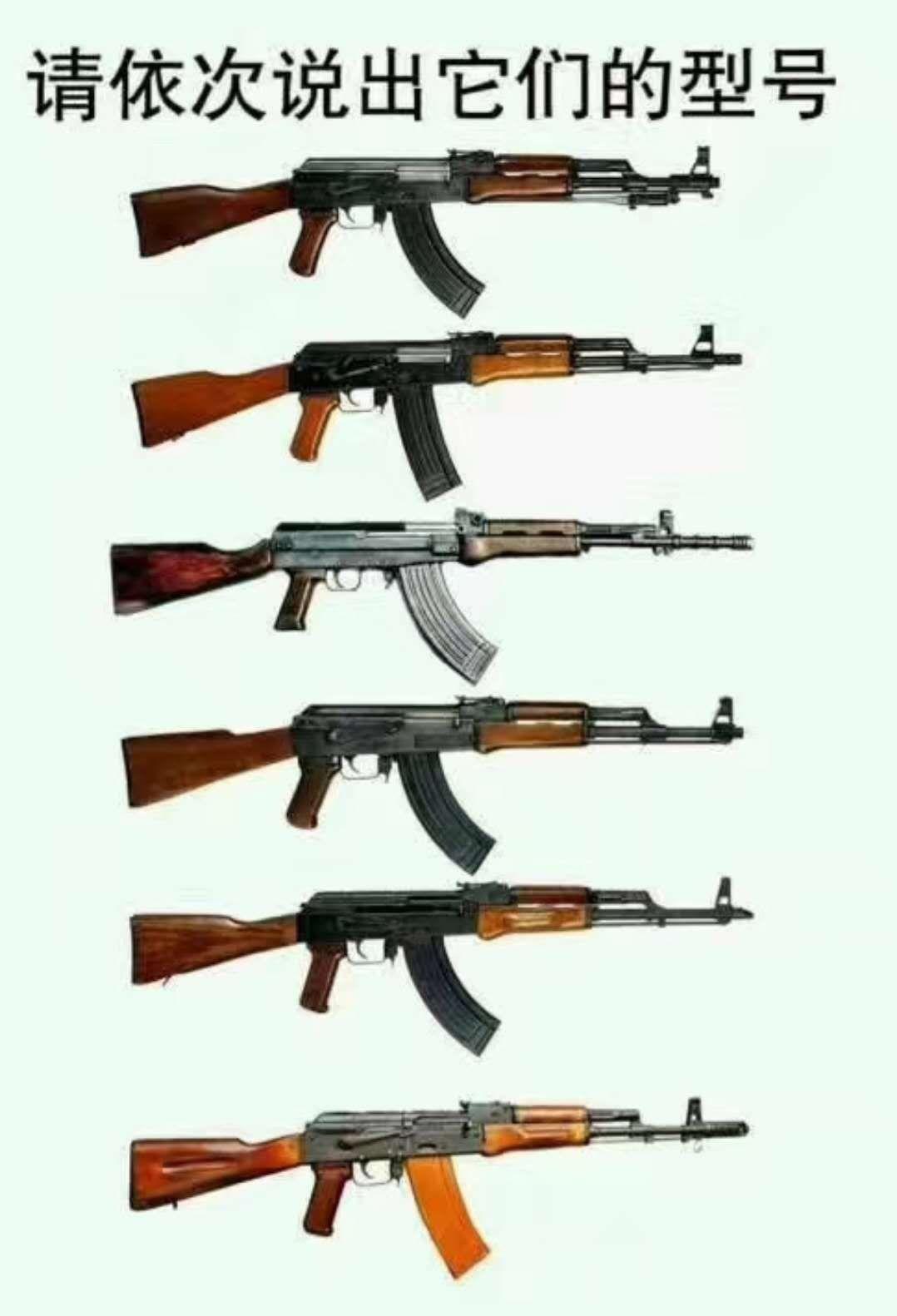 不怕说, 一脸懵, 对枪真的没认识, 感觉好像一把枪, 没区别。 看这个形状, 没见过枪的, 第一反应就是AK47。 嘻嘻,来了来了: 中国56式冲锋枪 中国84式步枪 中国81式步枪 俄罗斯AK47突击步枪 俄罗斯AKM突击步枪 俄罗斯AK74突击步枪