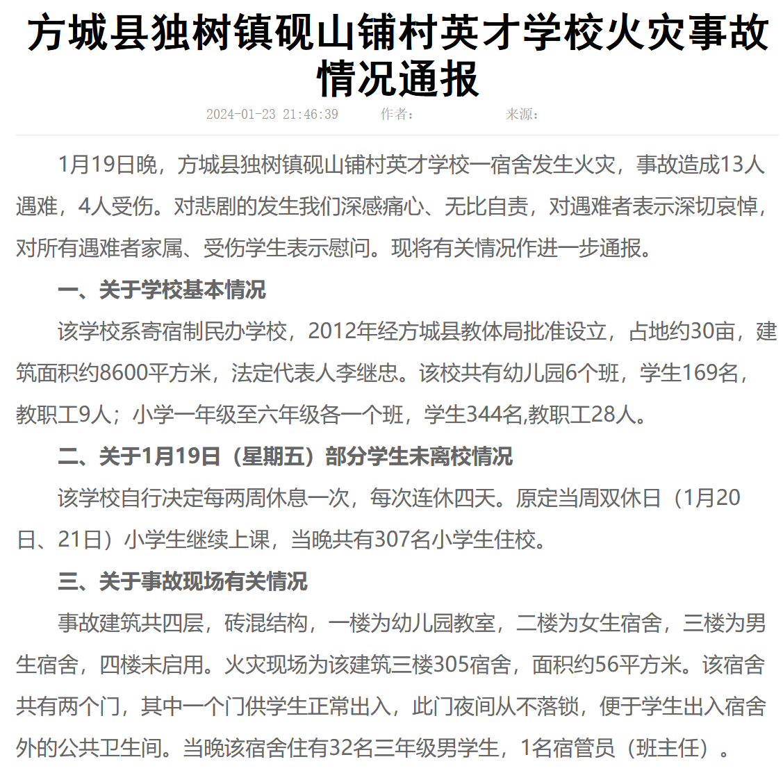#河南仍未公布致13死火灾调查报告#【快2年了,河南仍未公布致13死校园火灾事故调查报告】2024年1月19日晚,河南省南阳市方城县独树镇砚山铺村英才学校宿舍发生火灾,导致13名三年级学生遇难,4人受伤。同年1月23日,方城县英才学校火灾事故处置指挥部通报称,省调查组正在对事故原因、事故性质、消防器材配备等情况进行全面调查,调查结果将及时公布。涉事学校7名相关责任人员已被依法控制。纪检监察部门同步启动问责调查,对涉及失职失责人员将依法依规依纪严肃追责问责。一年多过去了,遇难学生家长仍在等待答案:那份迟迟未对外发布的事故调查报告。近两年,遇难学生小南的父亲范永归,一直在为儿子去世的真相奔走。据潮新闻报道,火灾发生后,范永归从工作地广东东莞赶回,在方城县的一家宾馆内,他被告知需先签署一份赔偿协议,才能前往殡仪馆见到孩子遗体。签署协议后,他于当天见到了孩子。范永归表示,从事故发生至今,省、市等各级有关部门均未向遇难者家属出示书面的事故调查报告。“事故的起因、详情等均由公职人员口述,且过程不允许家属录音录像。”范永归曾多次向有关部门反映,被告知因涉及“未成年人”,相关信息不予公开。对于事故的追责情况,范永归也提出了疑问。他提到,检察院目前仅以教育设施重大安全事故罪起诉了学校的法定代表人、校长和班主任。这与事故发生后,方城县英才学校火灾事故处置指挥部于2024年1月23日通报的“涉事学校7名相关责任人员已被依法控制”存在出入。遇难者家属并不清楚其余人员是否以及受到了何种处分。“河南消防总队工作人员曾向部分家属透露过事故起因,但目前尚未有正式的书面结论文件。但负责处理此事的政府工作人员曾告诉我,学校的校园消防安全管理肯定没有做到位,消防安全设施存在问题。”范永归说。另一位遇难者家属李先生和范永归均表示,他们希望政府能够公布这起事故的相关报告。如果事故中涉及未成年人,应该依法追究其监护人责任。对此,潮新闻多次向方城县检察院、教体局、应急局等部门致电,均未被接听。此外,方城县政法委工作人员表示:“并不清楚。”第一财经发表评论称,当地有关部门称按照未成年人保护法才不予公布,这种说法站不住脚。《未成年人保护法》第一百零三条规定:公安机关、人民检察院、人民法院、司法行政部门以及其他组织和个人不得披露有关案件中未成年人的姓名、影像、住所、就读学校以及其他可能识别出其身份的信息,但查找失踪、被拐卖未成年人等情形除外。可见,规定针对的是涉及未成年人的案件处理,而不是事故调查情况公开。附:方城县独树镇砚山铺村英才学校火灾事故情况通报1月19日晚,方城县独树镇砚山铺村英才学校一宿舍发生火灾,事故造成13人遇难,4人受伤。对悲剧的发生我们深感痛心、无比自责,对遇难者表示深切哀悼,对所有遇难者家属、受伤学生表示慰问。现将有关情况作进一步通报。一、关于学校基本情况该学校系寄宿制民办学校,2012年经方城县教体局批准设立,占地约30亩,建筑面积约8600平方米,法定代表人李继忠。该校共有幼儿园6个班,学生169名,教职工9人;小学一年级至六年级各一个班,学生344名,教职工28人。二、关于1月19日(星期五)部分学生未离校情况该学校自行决定每两周休息一次,每次连休四天。原定当周双休日(1月20日、21日)小学生继续上课,当晚共有307名小学生住校。三、关于事故现场有关情况事故建筑共四层,砖混结构,一楼为幼儿园教室,二楼为女生宿舍,三楼为男生宿舍,四楼未启用。火灾现场为该建筑三楼305宿舍,面积约56平方米。该宿舍共有两个门,其中一个门供学生正常出入,此门夜间从不落锁,便于学生出入宿舍外的公共卫生间。当晚该宿舍住有32名三年级男学生,1名宿管员(班主任)。四、关于火灾发生后救援情况1月19日23时00分,方城县消防救援大队指挥中心接警,迅速调集救援力量赶赴现场处置,23时38分,明火被扑灭,其他宿舍未发生引燃。方城县120指挥中心派出医用救护车和医务人员现场开展医疗救援;方城县公安局派多警种现场参与救援处置。共有294名学生被安全疏散至西教学楼。五、关于伤员人数及救治情况在疏散的305宿舍19名三年级学生中,吴某某伤情较重,当即被送往平顶山某医院救治,后转往郑州一烧伤专科医院,医院专门成立救治专家组,联系3名国家级专家远程会诊,正在不惜一切代价,抢救伤者,确保治愈。目前,该学生呼吸道灼伤好转,创面包扎治疗,气道黏膜水肿进一步消退,血气分析检查正常,生命体征平稳。学生疏散转移以后,学校教师及医务人员对学生身体状况作进一步排查,发现还有3名学生有体外伤情,遂送至方城县某医院作进一步检查。检查显示,一名学生右腕部、左手掌有不规则水泡,局部红肿;一名学生左侧耳廓处红肿;一名学生左额部、左耳廓、右小腿、右臀部局部红肿,有不规则水泡。为确保治疗效果,将3名学生转至南阳市一家三甲医院烧伤专科诊治。目前,3名学生已全部出院。六、关于善后处理情况火灾事故处置指挥部设置工作组及遇难学生家属服务专班,全力开展伤者救治、家属安抚、善后处置工作,抽调县内骨干医护人员分赴郑州、南阳医院做好服务保障;主动与遇难者家属对接沟通,做好情绪心理疏导、健康监测等工作;积极与保