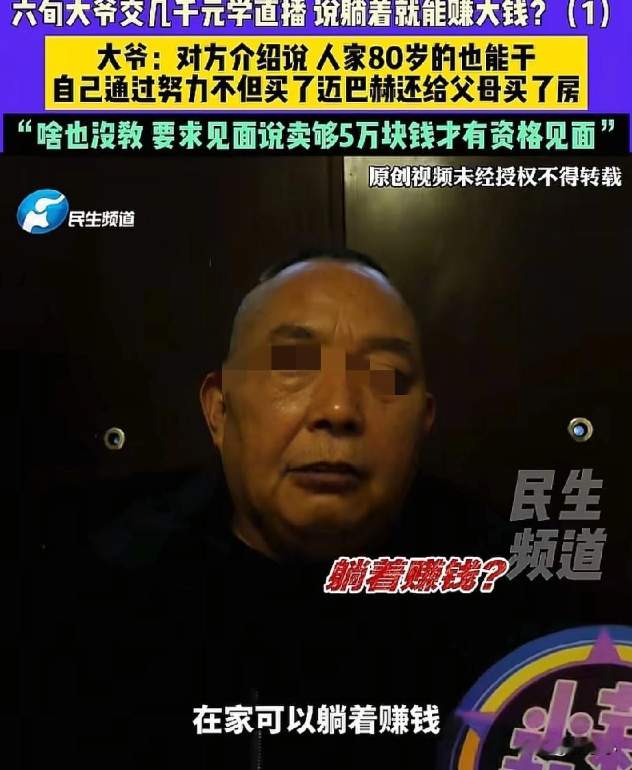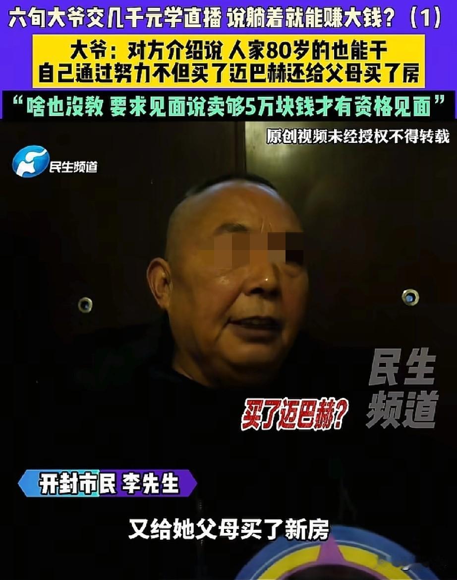 天上掉馅饼?河南,63岁大爷交了几千块钱学直播,说到躺着就能赚大钱,大爷直接照办在家里躺了几个月了,一分钱也没看到。 李先生在家里闲着无聊刷短视频,这天他刷到了一个叫赢老板的女子,直播带货,可以在家里躺着数钱。 从赢老板的描述中,她通过自己的努力不仅买了迈巴赫,还给父母买了房子,李先生很是心动呀,在家里躺着就能赚钱,还不用出力,这是个好工作啊! 于是,李先生就和这个赢老板聊了起来,说自己年龄大了,已经63岁了,还能不能干。 这个赢老板为了能拉住李先生,直接告诉他,你这年龄还算小的,人家有80多岁的都在干,一天都能赚个几百块钱。 这话一出,李先生特别被打动了,直接交了几千块钱的学费,对方也发来一个链接,让他下载这个,那个的。 李先生也不会,就要求能不能见面方面教他,对方可直接拒绝了,理由是必须要卖到5万块才能见面。 这个时候李先生已经意识到了自己可能被骗了,立马就联系了这个赢老板,但是已经联系不上了。 为了能追回自己的损失,李先生求助了河南广播电视台。 此事引发热议! 有网友表示, 躺的时间还短,不要吃饭一直躺,再躺半个月估计亲朋好友都来送钱了。 也有网友表示,那女的说躺在那里都能赚钱,大爷躺在那里没挣到钱。应该是大爷躺的姿势不对。 所以,一句老话还是有道理的,天上不会掉馅饼的,如果真掉的话,那肯定是陷阱等着你。