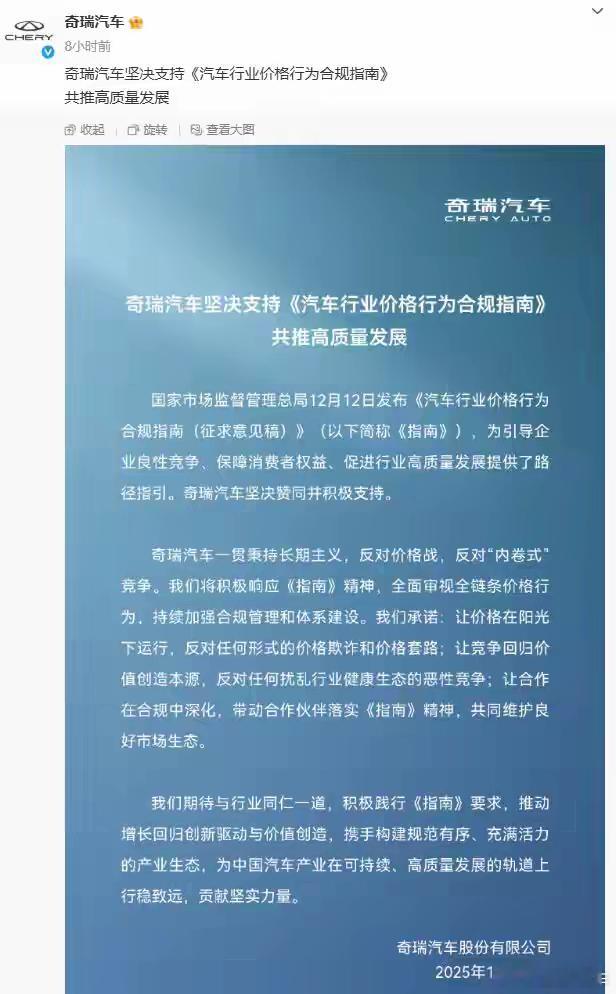 汽车民生 两车企表态:坚决支持规范汽车价格!相关部门发布规范汽车行业价格行为,目前正在征求意见,很快长城汽车、奇瑞汽车表态:坚决拥护,全力支持!
