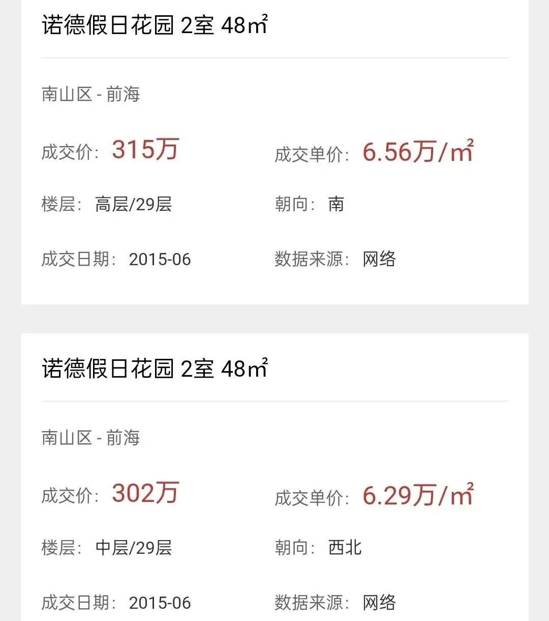 另一个例子是前海曾经的“网红盘”诺德假日,凭借优质学位和小区品质备受追捧。如今一套48平米户型挂牌315万元,价格仍在下探,已回落至2015年中的水平。若无强有力的政策刺激,这类楼盘的趋势短期内恐难逆转。