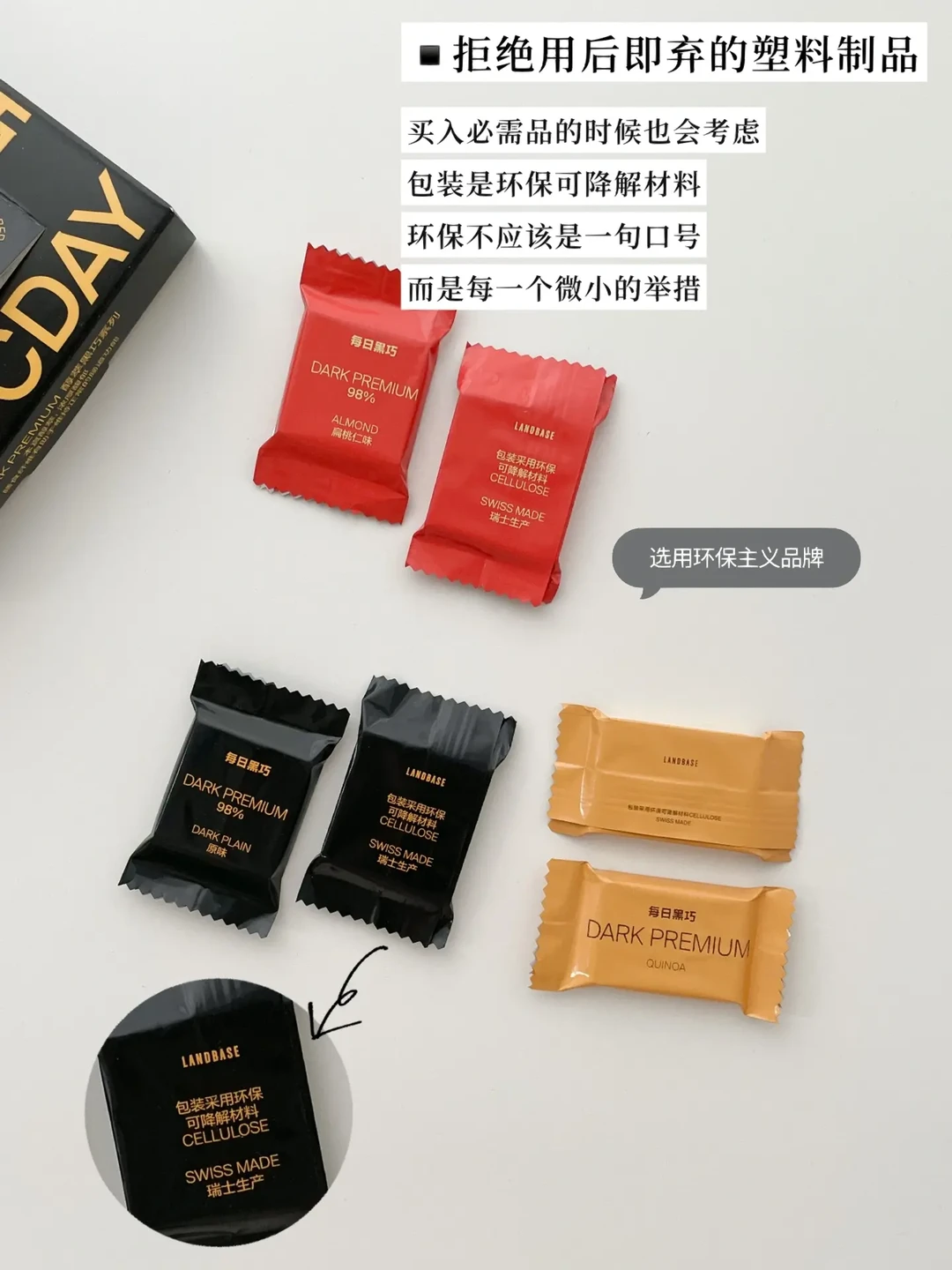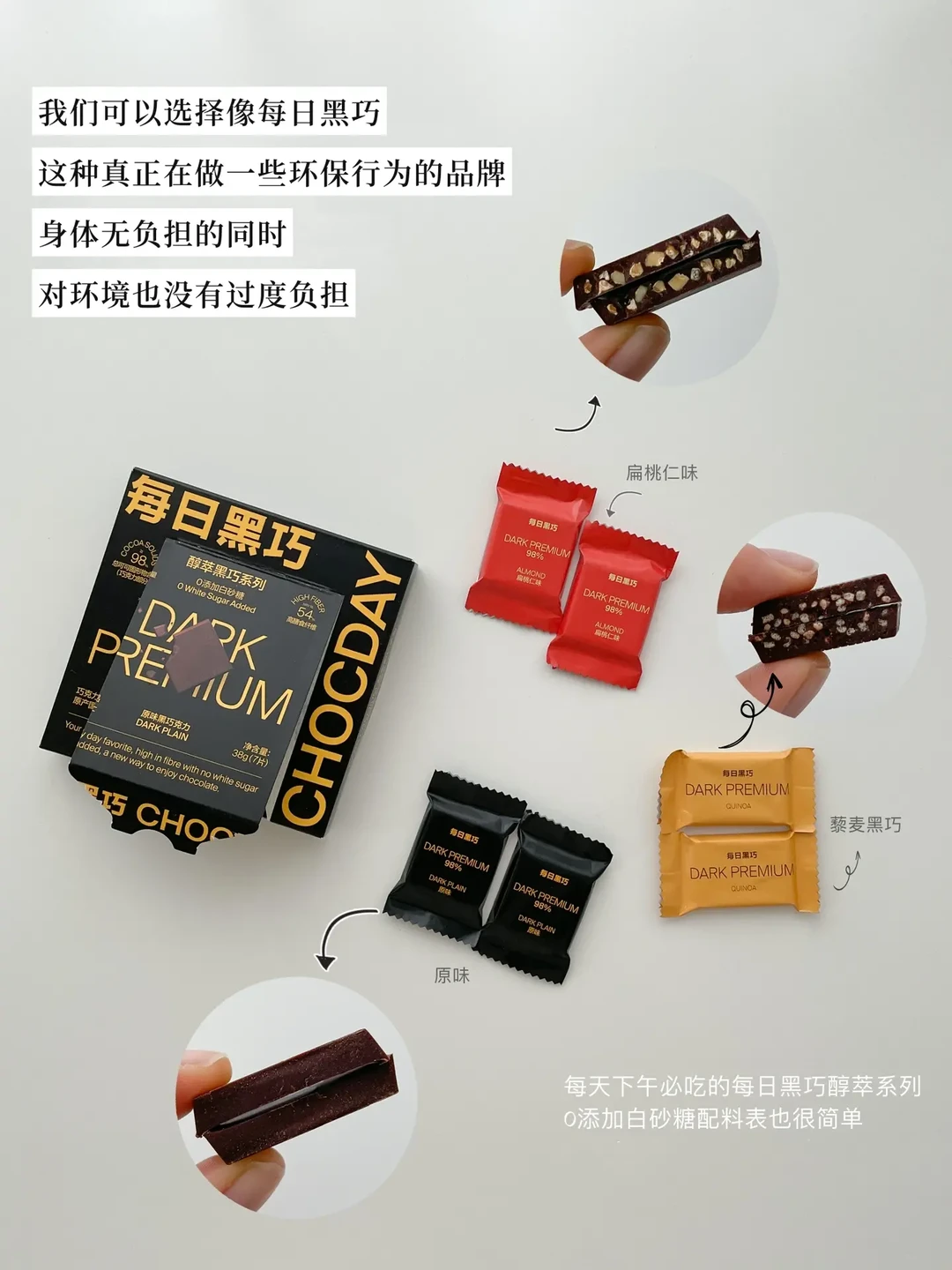 比如我每天下午必吃的每日黑巧醇萃系列,每一片黑巧都坚持清洁能源生产,且持续采用环保可降解材质的包装。一直以来我都是吃0添加白砂糖的黑巧。极简在零食配料表也有要求,每日黑巧干净配料表深得我心,身体无负担,对环境也没有增加负担。