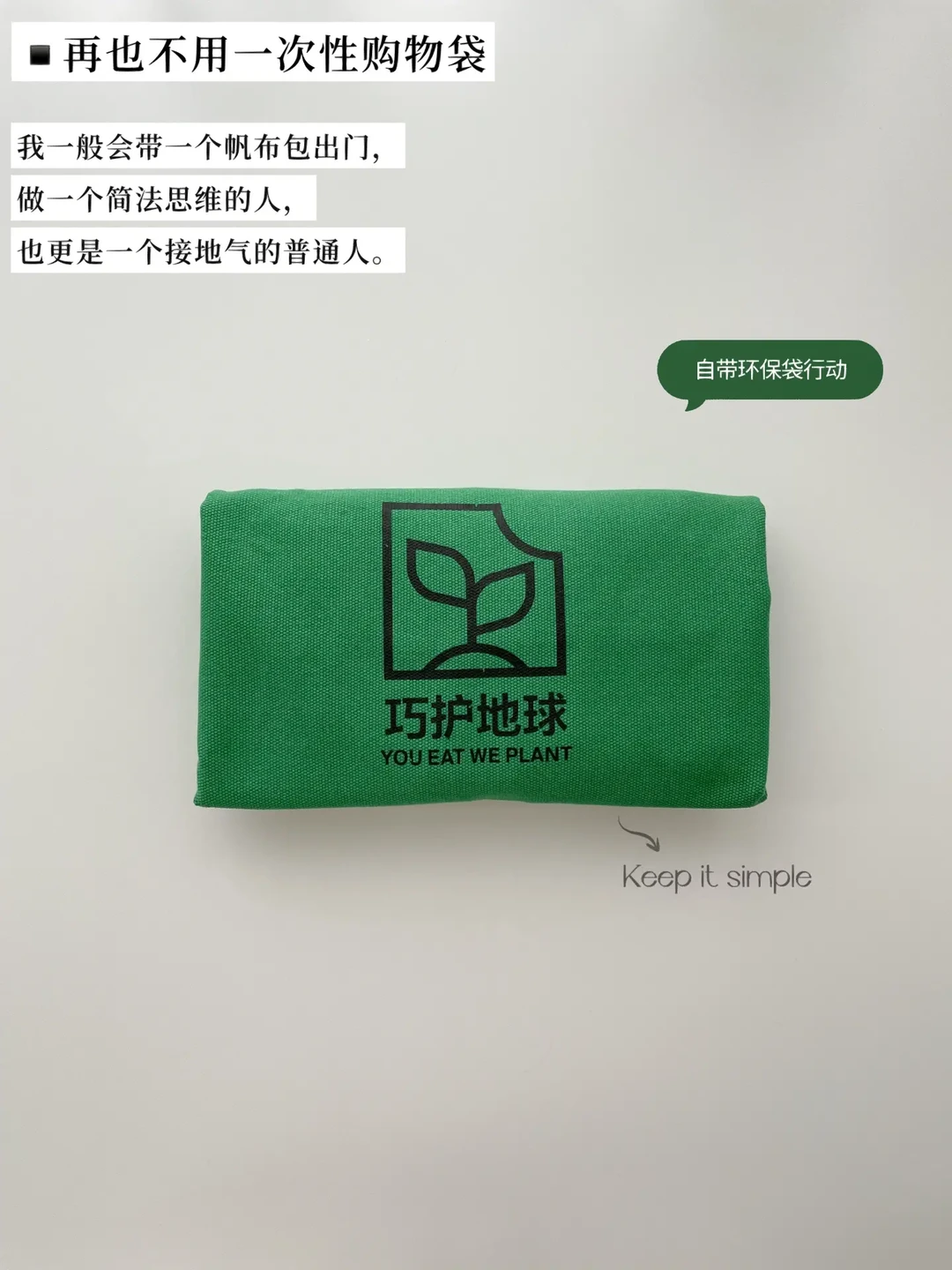 我一般会带一个帆布包出门,做一个简法思维的人,也更是一个接地气的普通人。每次购物都是为你喜爱的事情投票,请谨慎作出每一个决定。带环保袋就能少用塑料袋,给环境减负。