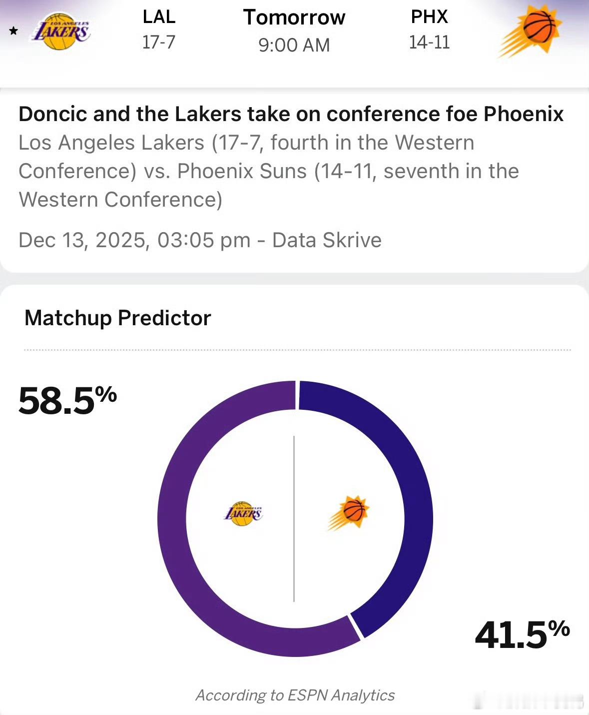 明天湖人太阳比赛预告来了!东詹带队,狄龙蓄势待发:湖想复仇?明天湖人太阳比赛预告来了!今天马刺雷霆的比赛很精彩,但是让我们回到湖人好吗哈哈哈!明早上午9点,湖人将前往菲尼克斯对阵太阳。ESPN这次预测湖人胜率58.5%,太阳胜率41.5%,湖人占优!不过现在看这个ESPN只要预测湖人胜率高,我就很悬啊!上一场打马刺预测湖人60%胜率,没想到爆冷输给了没有文班的马刺,导致杯赛提前淘汰回家!目前两队战绩排名:湖人近5场取得2胜3负,总战绩17胜7负已经掉到西部第5了!太阳近5场取得2胜3负,总战绩14胜11负排名西部第7!双方预测首发:湖人:文森特,东契奇,八村塁,詹姆斯,艾顿太阳:吉莱斯皮,阿伦,狄龙,奥尼尔,马威双方伤病情况!里夫斯(左小腿拉伤一周后评估)、可乐杯因伤缺席!布朗尼下放g联盟!狄龙(左跟腱酸痛)布克(右腹股沟拉伤)均出战成疑!杰伦格林、利弗斯继续因伤缺席!双方球队数据对比:湖人进攻效率全联盟第7,防守效率全联盟第21,罚球率全联盟第1!太阳进攻效率全联盟第17,防守效率全联盟第16,抢断率全联盟第1!在此前7次交手中,湖人只取得1胜6负的战绩!双方在此前12月2号的比赛,湖人就惨败给太阳17分!最高落后25分,半场就被没有布克的太阳打花了!太阳这球队先天就有点克湖人的感觉,湖人本赛季场均失误联盟倒数,而太阳是抢断第一的球队,这不就是正中靶心吗!在此前那场湖人就多达21次失误!明天悬啊!湖人太阳詹姆斯东契奇NBA新赛季NBA热点狄龙湖人太阳马刺淘汰湖人詹姆斯