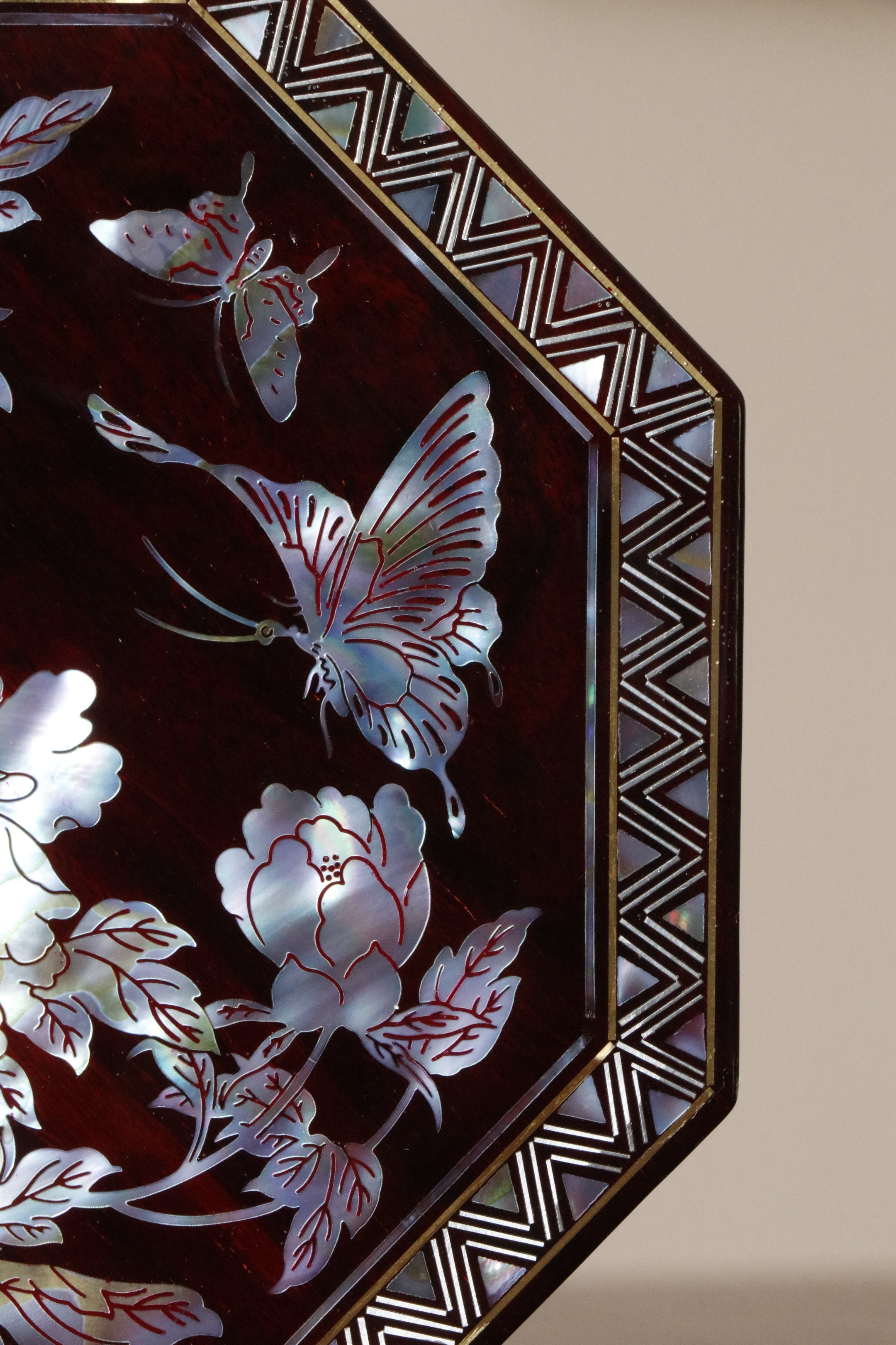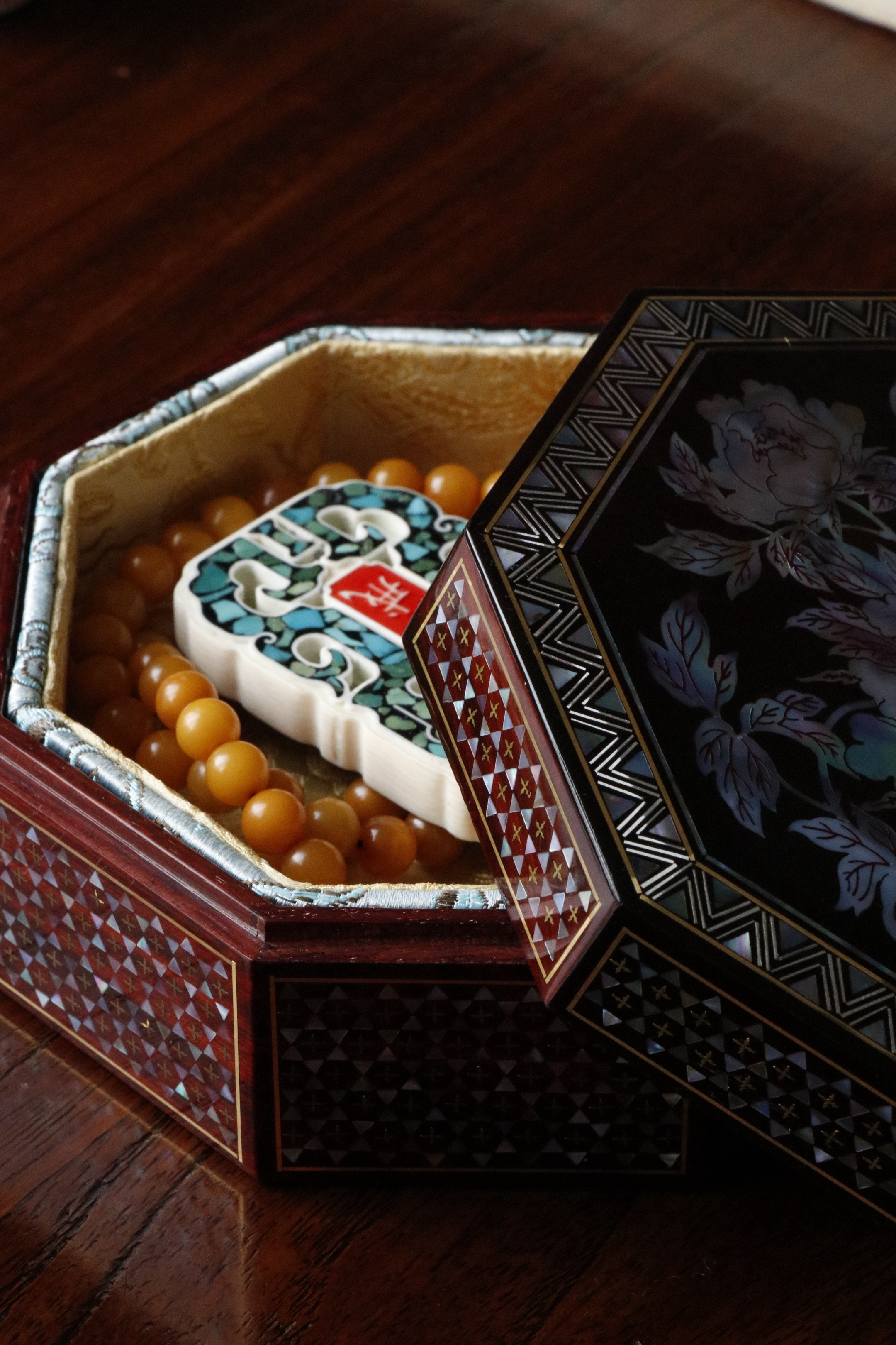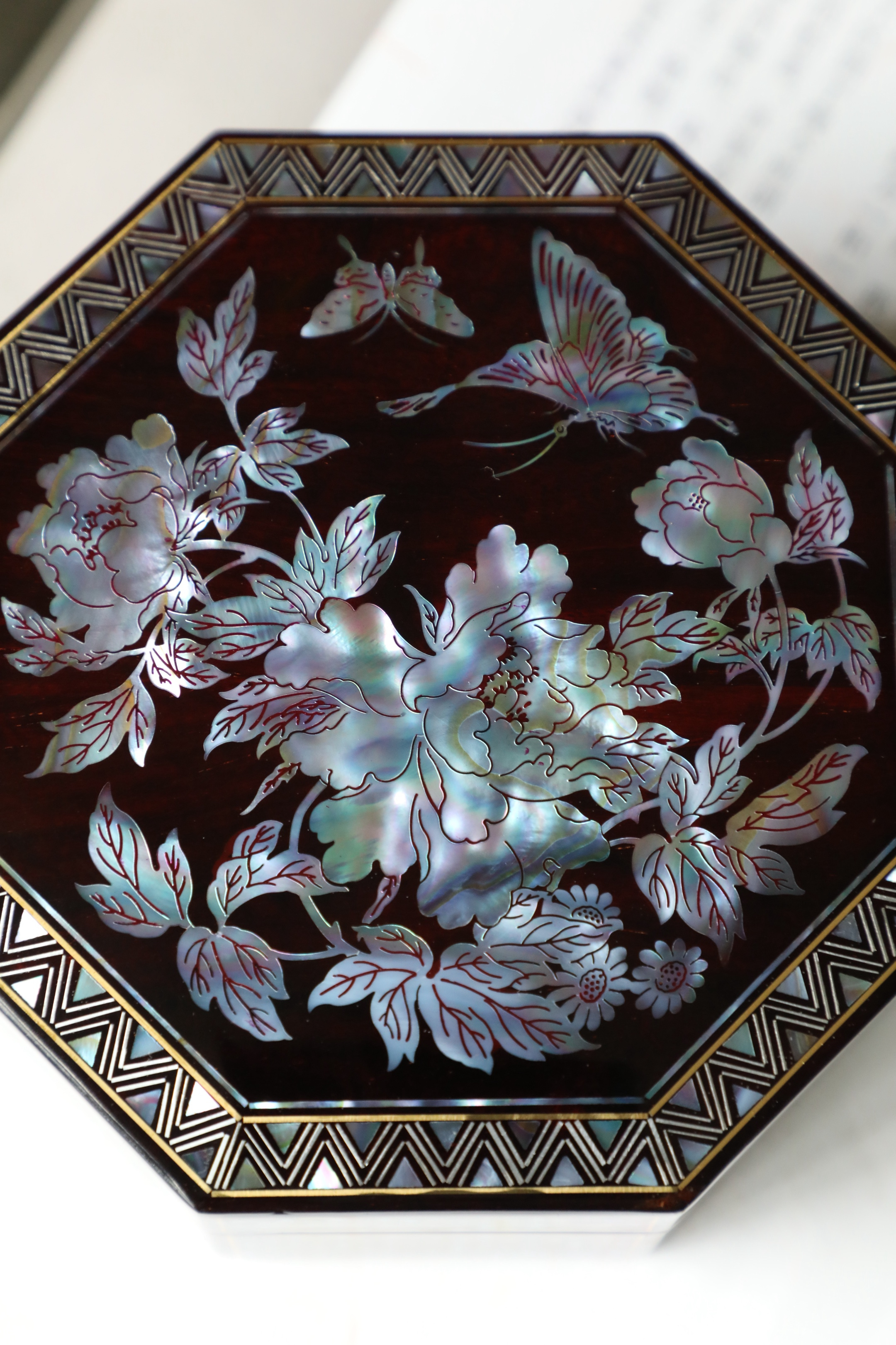 小叶紫檀×螺钿 | 花开富贵 八角盒老料底胎,榫卯结构,髹漆镶嵌螺钿,盒面牡丹蝴蝶图案,立墙锦地,密丽精美,内设锦衬,存物妥帖!13*13*6cm 重290克