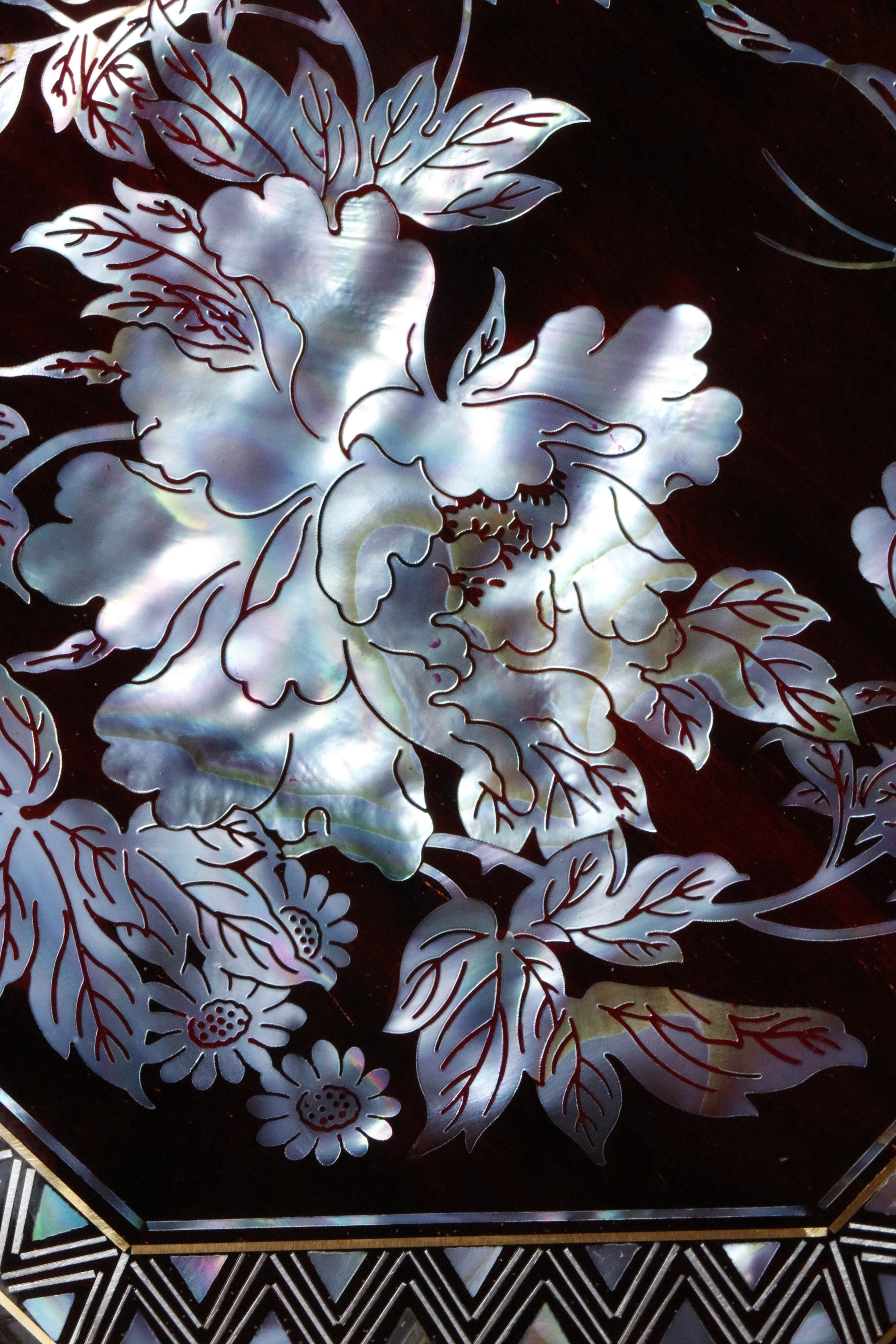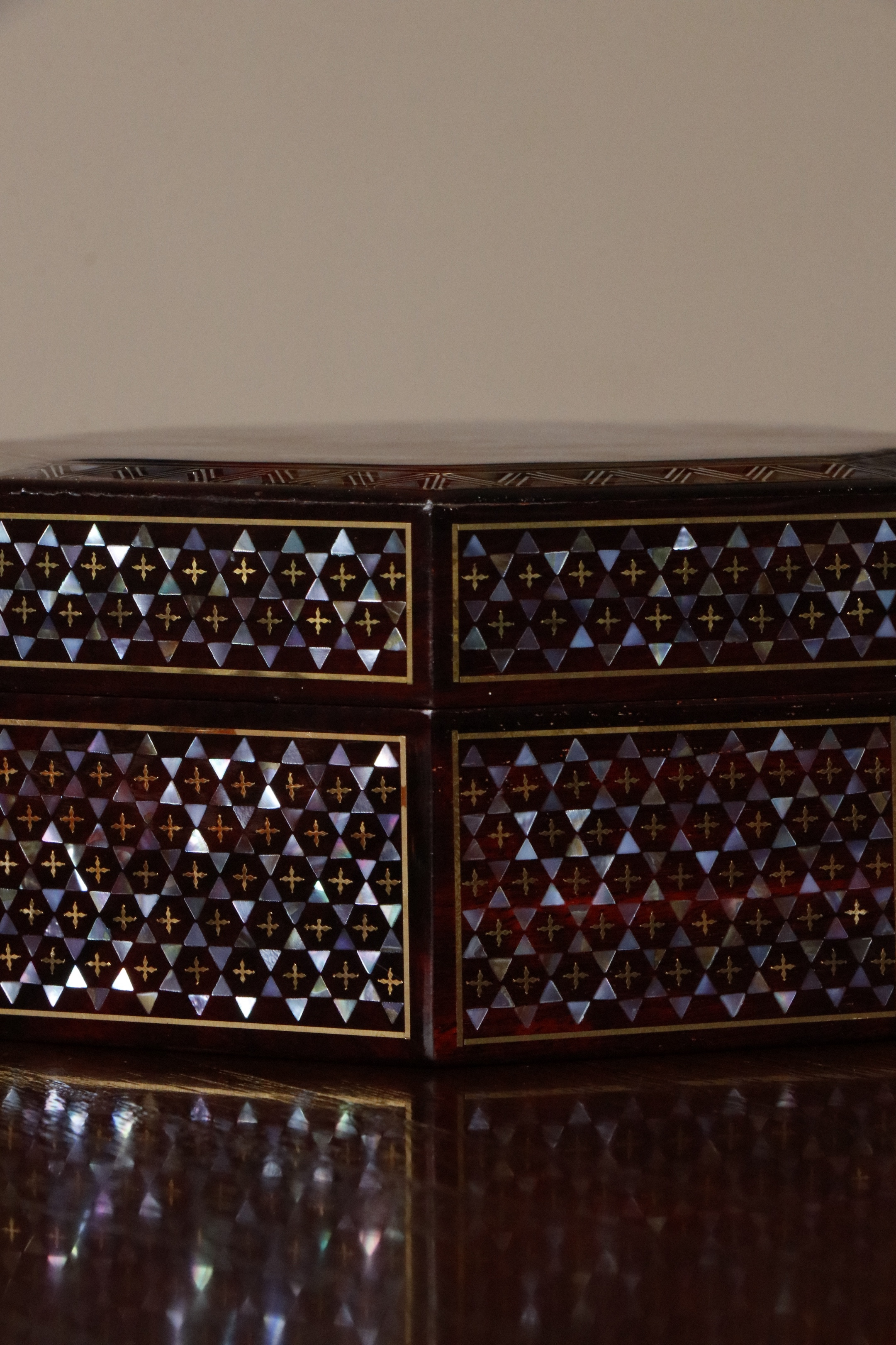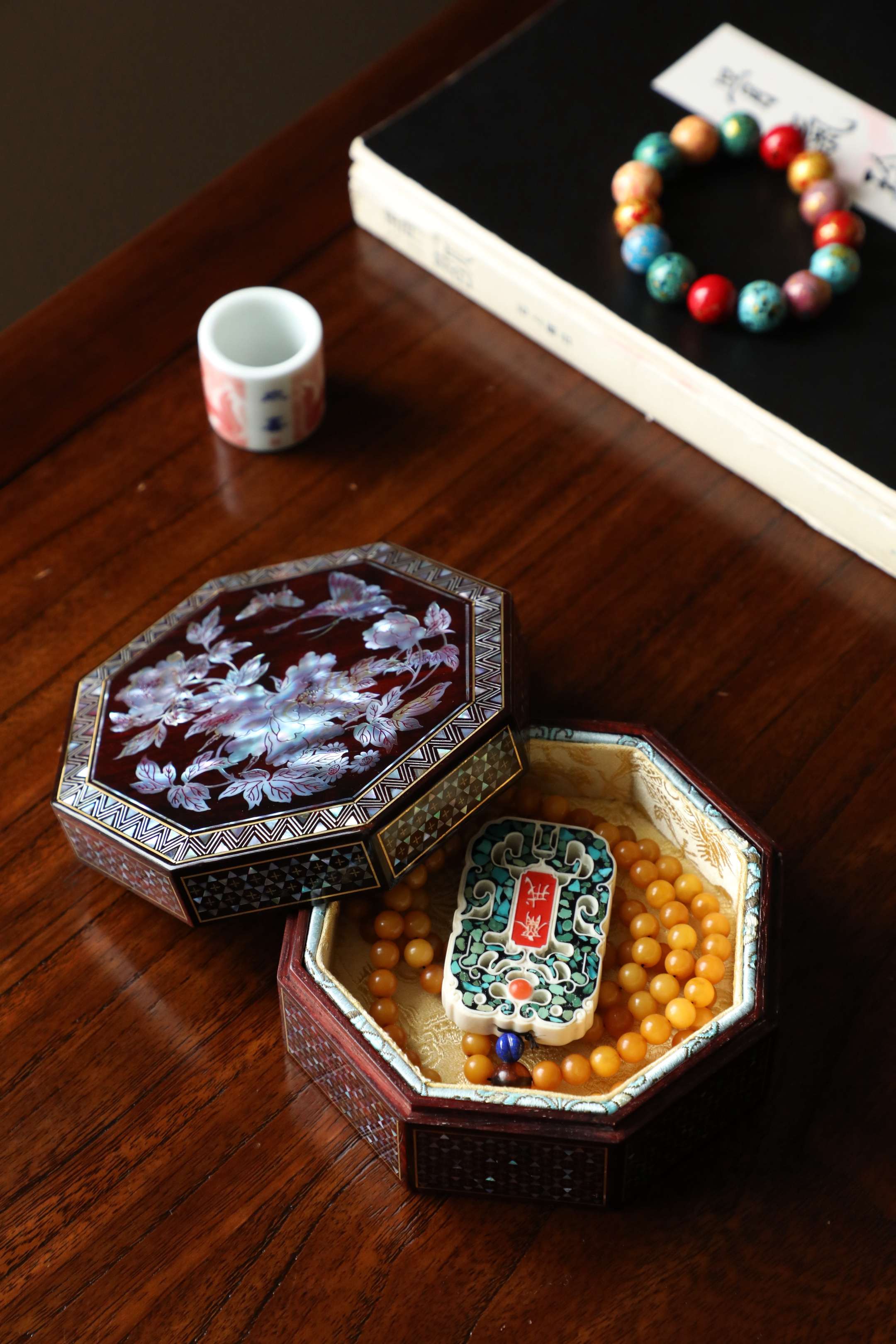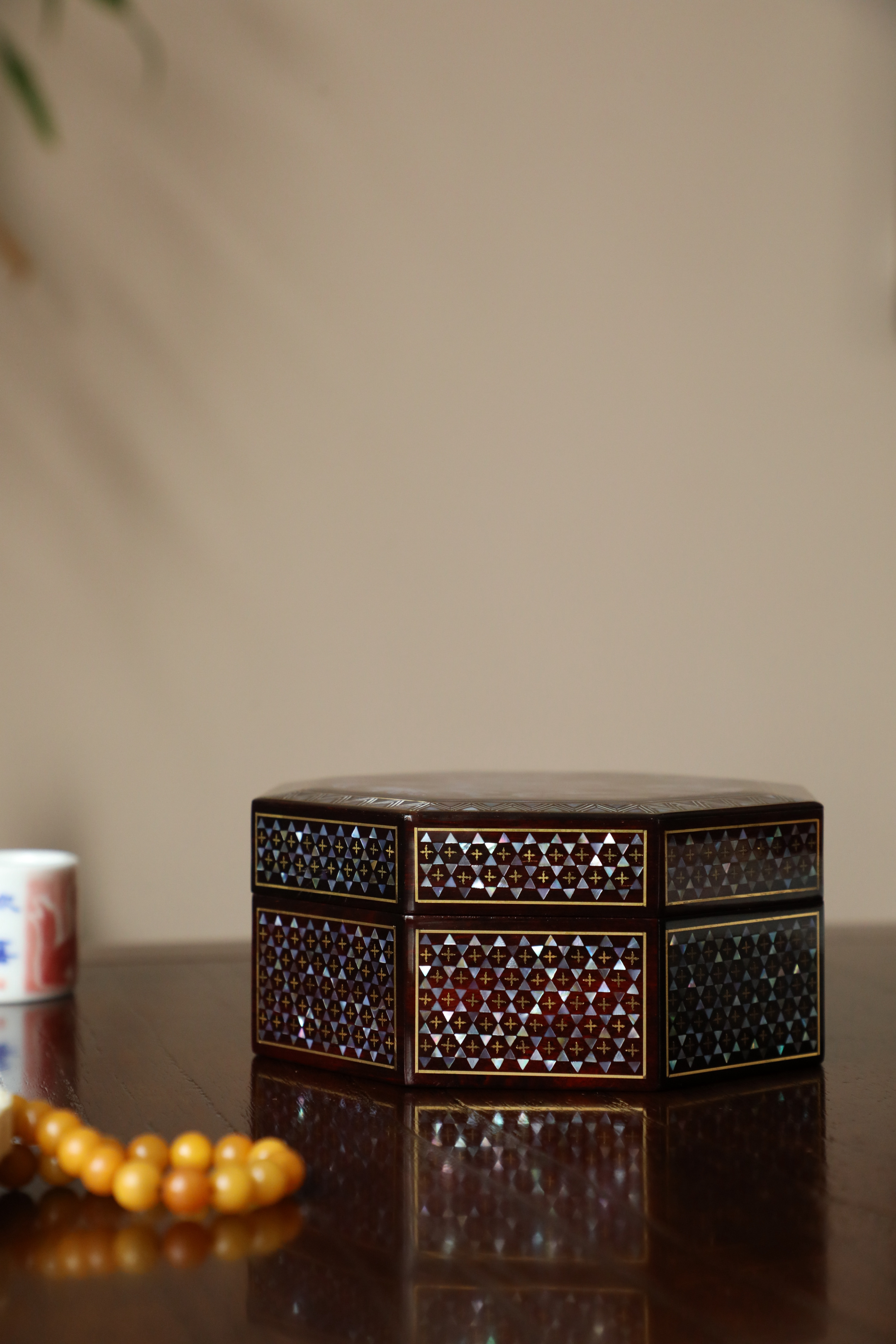 小叶紫檀×螺钿 | 花开富贵 八角盒老料底胎,榫卯结构,髹漆镶嵌螺钿,盒面牡丹蝴蝶图案,立墙锦地,密丽精美,内设锦衬,存物妥帖!13*13*6cm 重290克